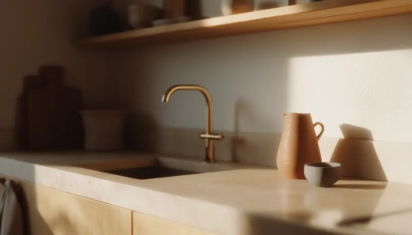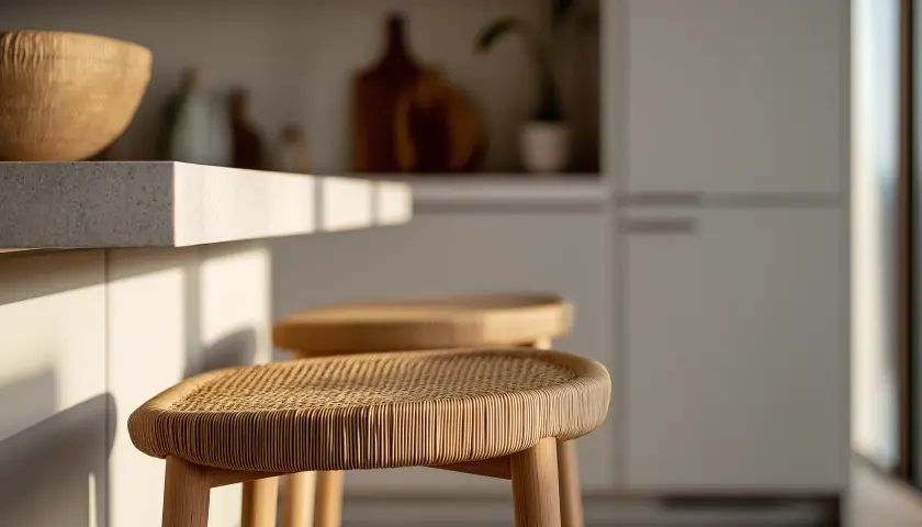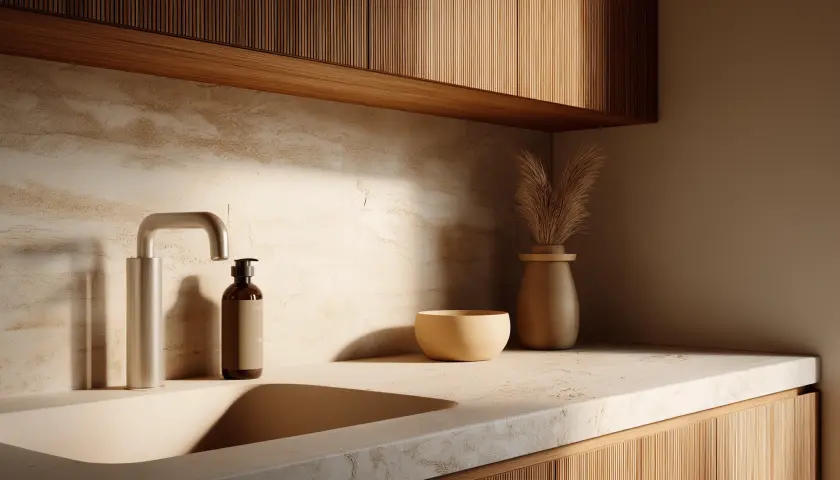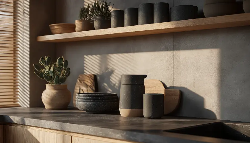 Bij het inrichten van een Japandi keuken zijn natuurlijke materialen essentieel. Hout, zoals berkenhout of eikenhout, is een populaire keuze voor kasten en werkbladen. Natuursteen, zoals marmer of graniet, voegt luxe en klasse toe aan uw keuken. Keramische tegels met een rustig dessin zijn ideaal voor de achterwand en vloer, omdat ze gemakkelijk schoon te maken zijn en niet alle aandacht opeisen. Bamboe, met zijn lichte en luchtige uitstraling, kan worden gebruikt voor accessoires zoals manden of schalen.