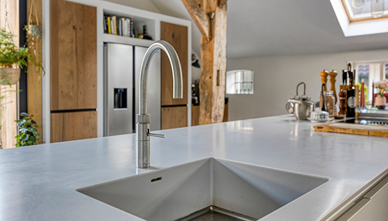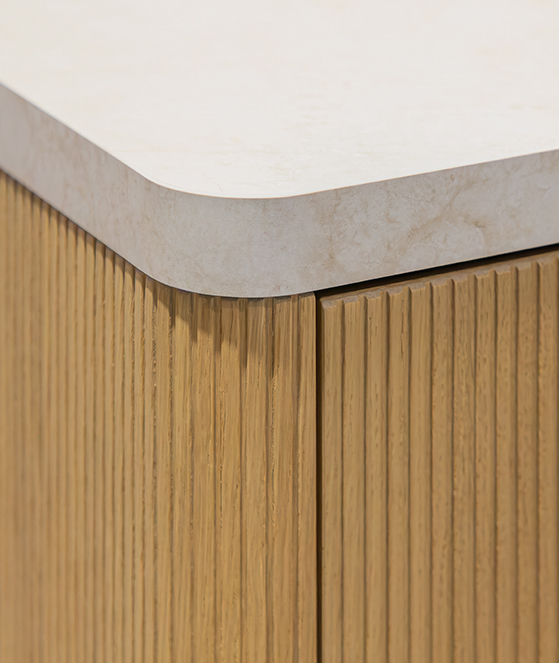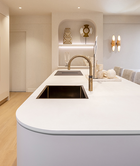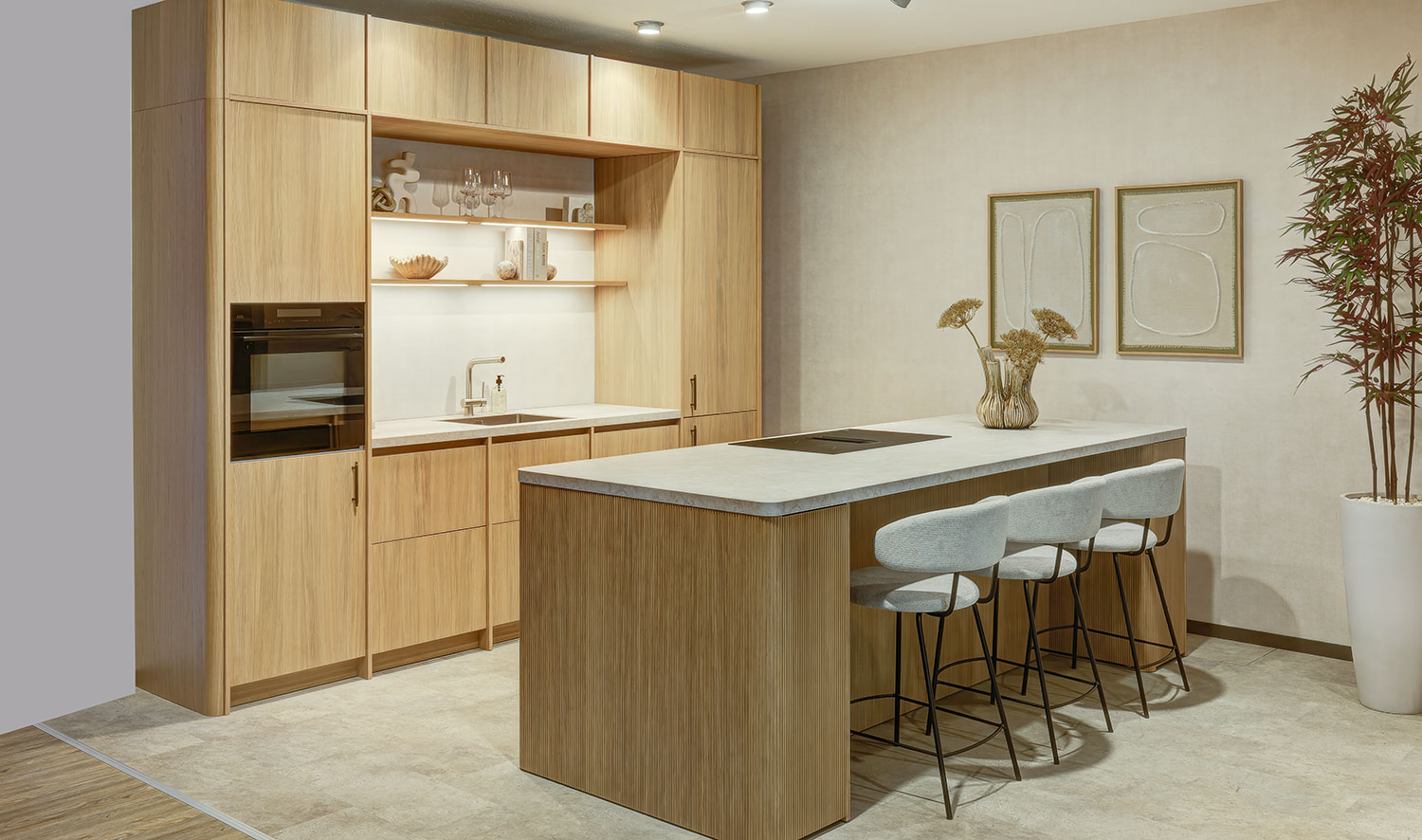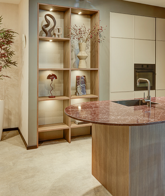 Ronde vormen zijn niet nieuw, maar in 2026 worden ze overal doorgevoerd. “Rond is het nieuwe strak”, zegt Daniëlle met een glimlach. “Fronten, kookeilanden, werkbladen… alles krijgt zachtere lijnen.” Fabrikanten werken hard aan nieuwe technieken om met materialen als keramiek en natuursteen te kunnen buigen. “Daardoor ontstaan er keukens die niet alleen praktisch zijn, maar ook een veel vriendelijkere uitstraling hebben. De tijd van scherpe hoeken is echt voorbij.” Zelfs details als handgrepen en verlichting volgen deze trend. “Alles mag wat zachter aanvoelen. Dat maakt de keuken meer uitnodigend.”