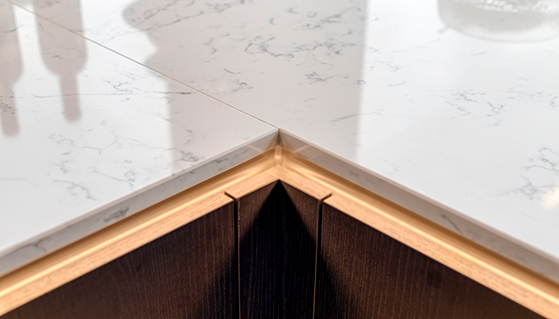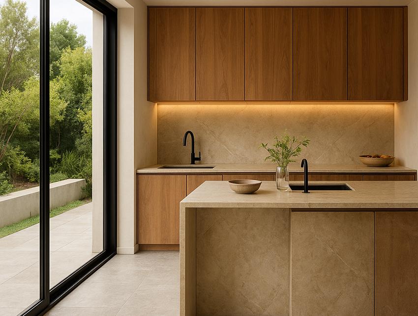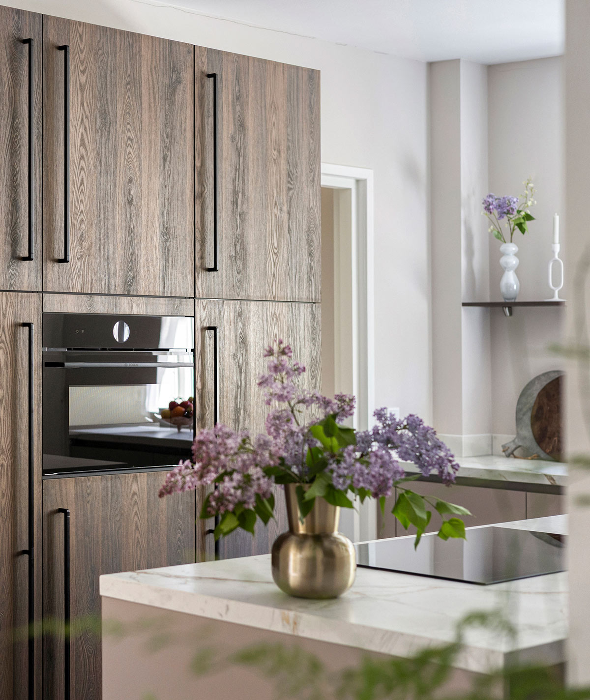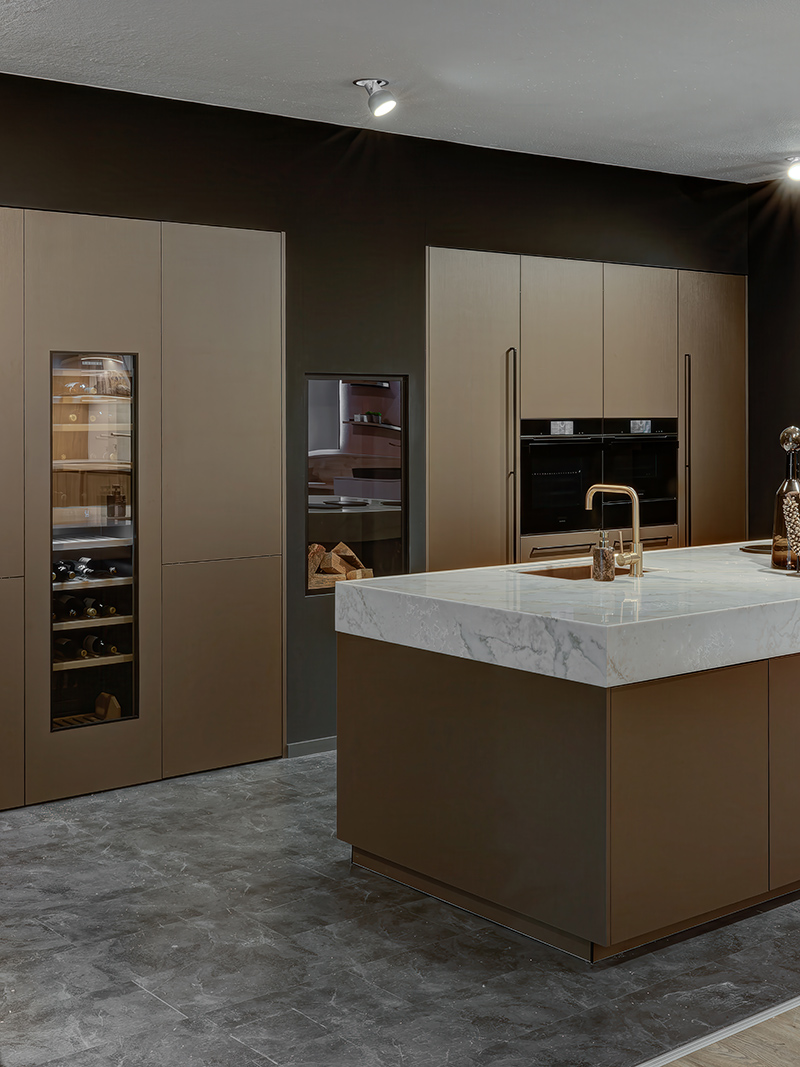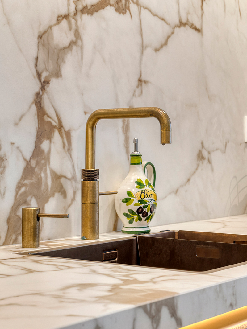 Keramiek en composiet blijven de populairste keuzes voor werkbladen en fronten. “De prints van keramiek zijn zó realistisch dat u nauwelijks verschil ziet met natuursteen”, zegt Daniëlle. “Het biedt de luxe uitstraling van steen, maar is onderhoudsvriendelijker en betaalbaarder.” Ook metaalaccenten veranderen van toon. “Goud maakt plaats voor brons, roestvast staal en zachte metallic tinten. Dat oogt rustiger en combineert prachtig met hout en zandkleuren.”