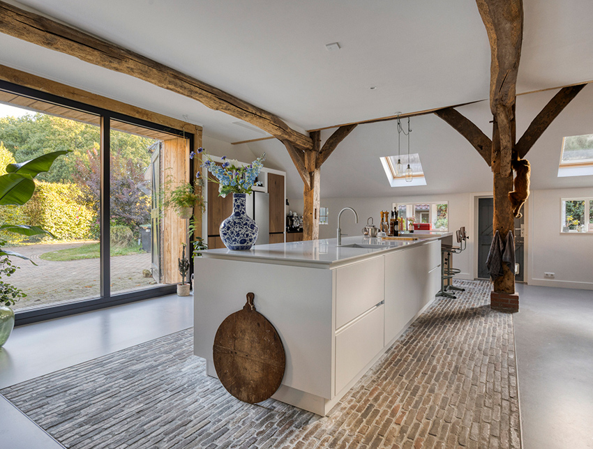 Een opvallende trend die zich steeds sterker ontwikkelt, is de doorlopende verbinding tussen buiten en binnen. “Architecten trekken materialen en lijnen van buiten naar binnen door”, legt Daniëlle uit. “Hout, natuursteen of betonlook vloeren lopen visueel door in de keuken. Dat zorgt voor een ruimtelijk gevoel.” Deze trend past volgens haar perfect bij de huidige wens naar harmonie. “We willen niet meer dat de keuken een afgesloten werkplek is. Het is een leefruimte geworden, een plek om te koken, te leven en te genieten.”