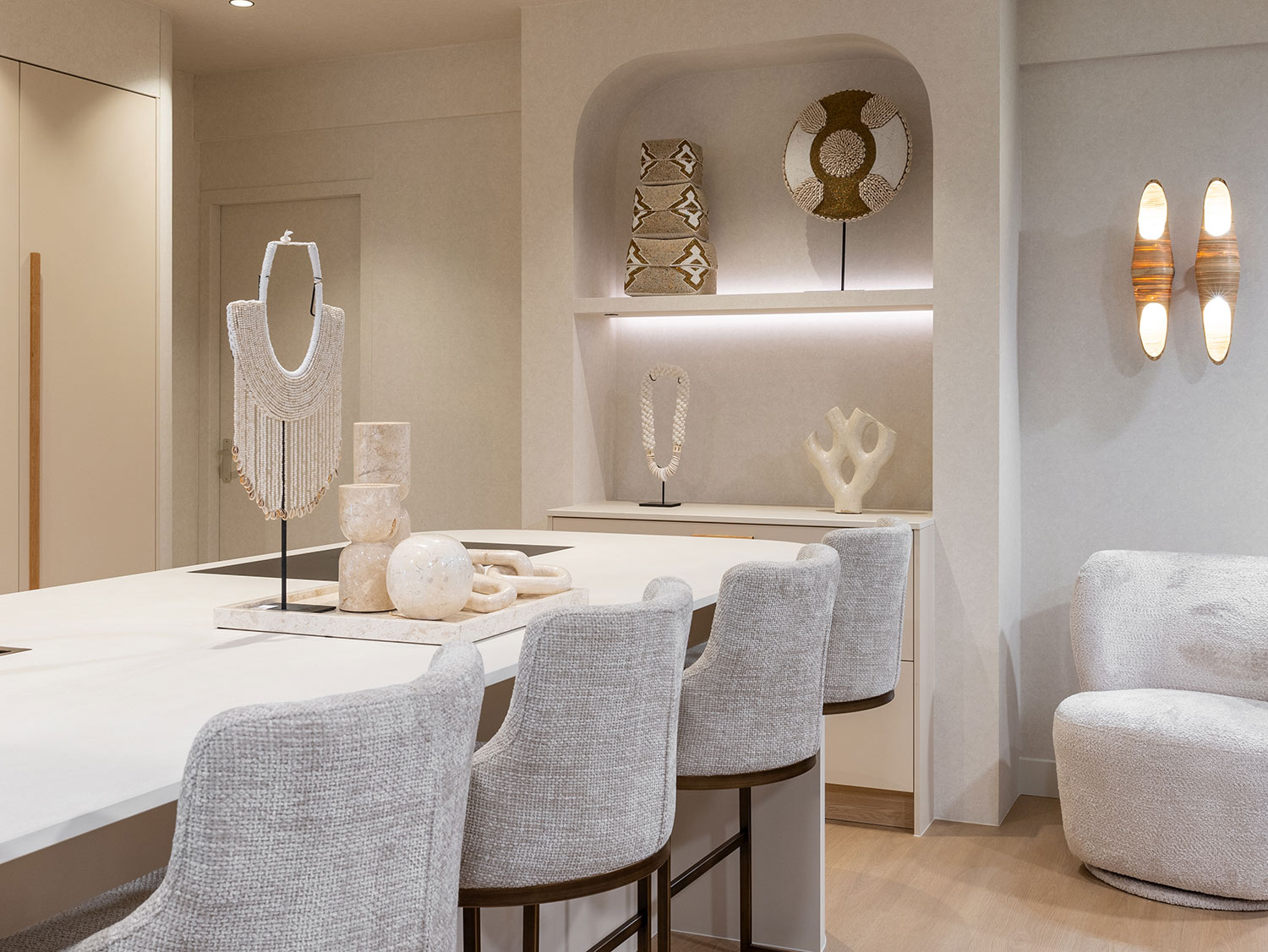 De bekende hotel chique-stijl blijft ook in 2026 populair, maar in een verfijnde vorm. “Waar het eerst draaide om zwart marmer en goud, zien we nu walnoot, beige marmer en brons”, legt Daniëlle uit. “De luxe blijft, maar het wordt minder glimmend en meer ingetogen. Chic, maar warm.” Steeds vaker wordt deze stijl doorgetrokken in het interieur. “De keuken sluit naadloos aan op de woonkamer of eetkamer. Kleuren en materialen vloeien in elkaar over. Dat zorgt voor rust en eenheid in huis.”