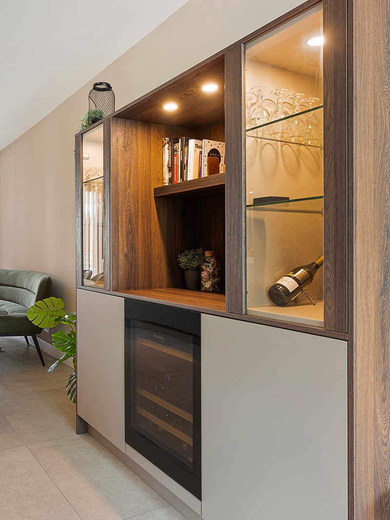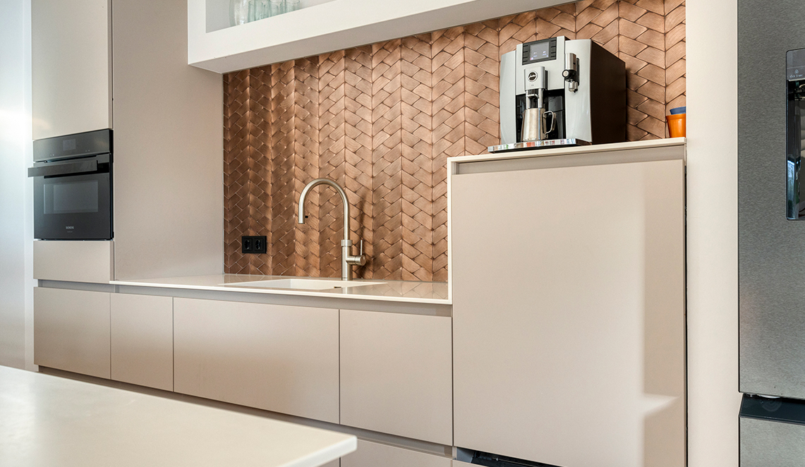 Zwart speelt niet langer de hoofdrol. “Een subtiel accent mag nog, maar brons en champagnekleuren nemen het over. Dat geeft een vriendelijkere uitstraling en zorgt voor meer warmte in huis.” Volgens Daniëlle komt dat doordat mensen weer behoefte hebben aan rust. “We willen dat onze keuken niet alleen mooi is, maar ook prettig aanvoelt. Japandi is daar perfect voor.”