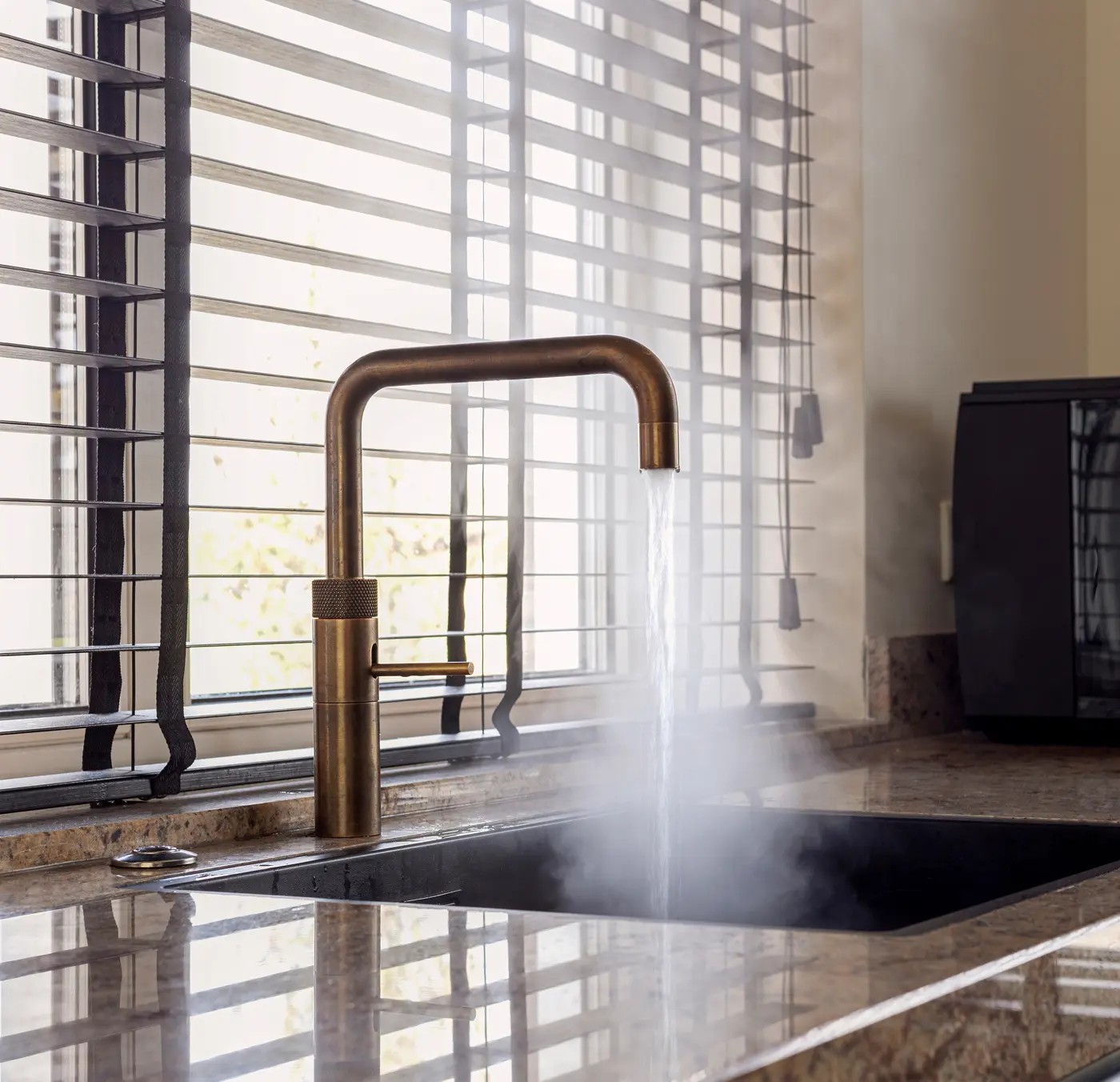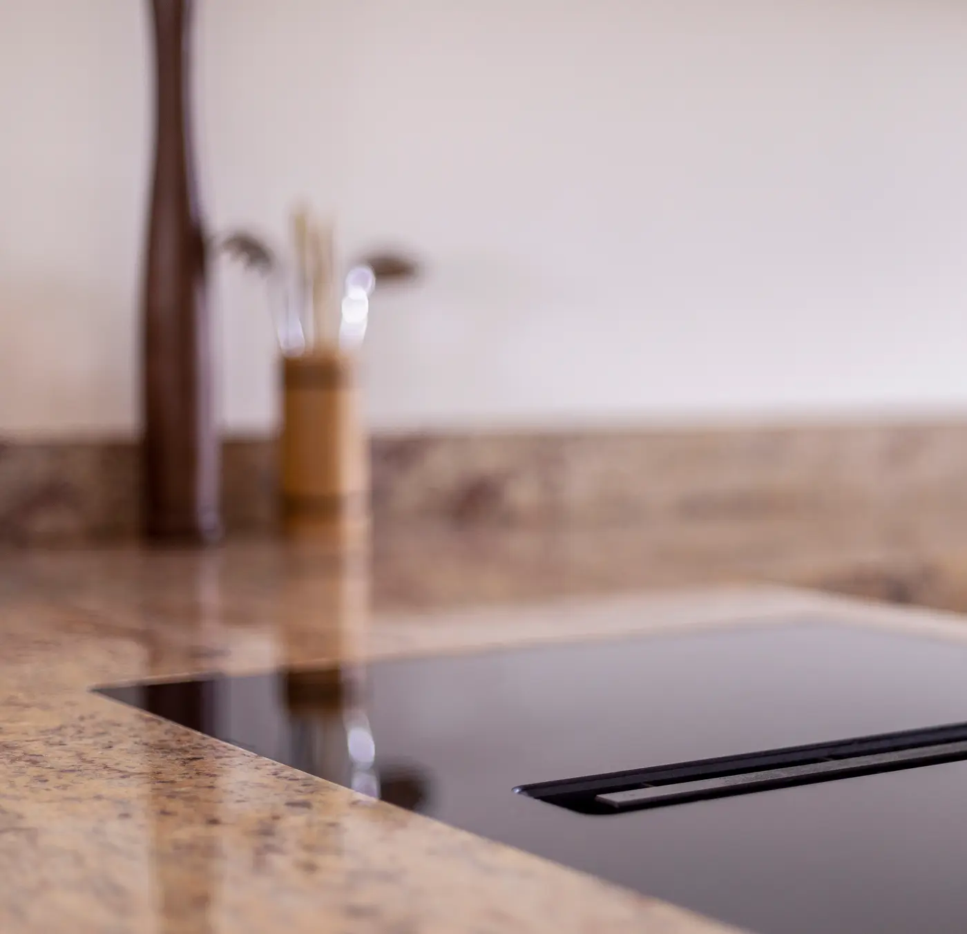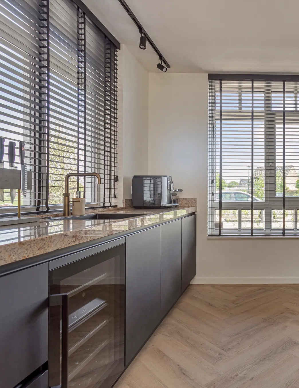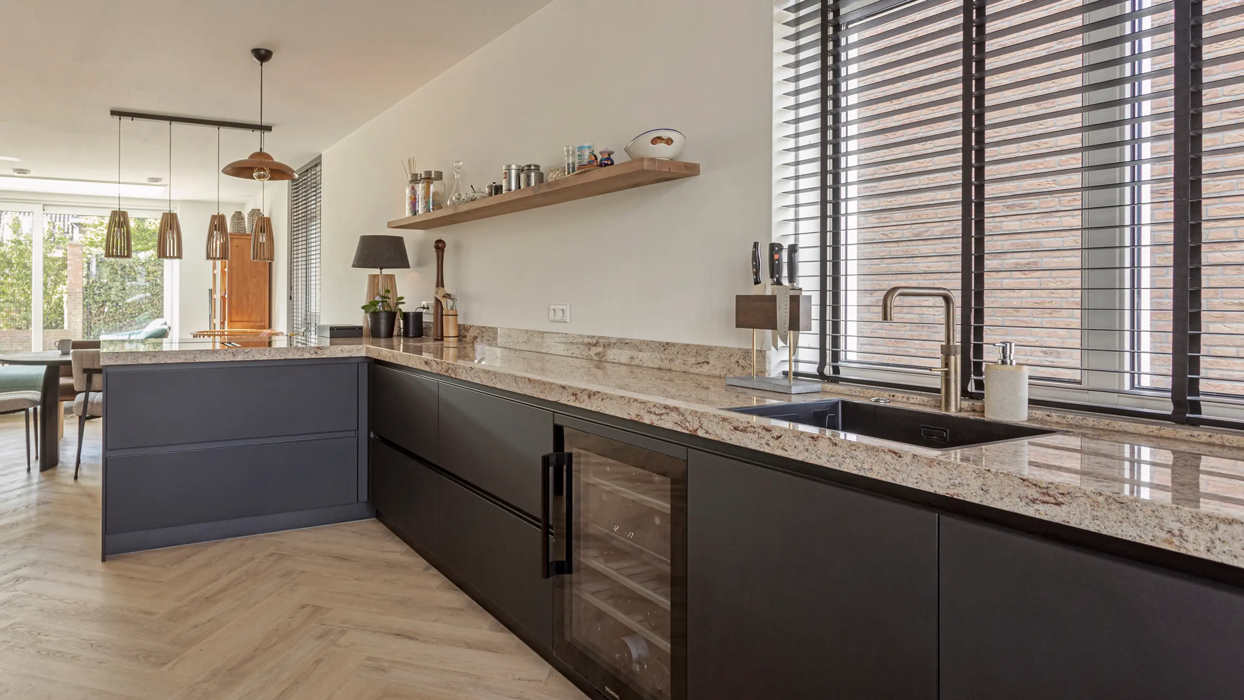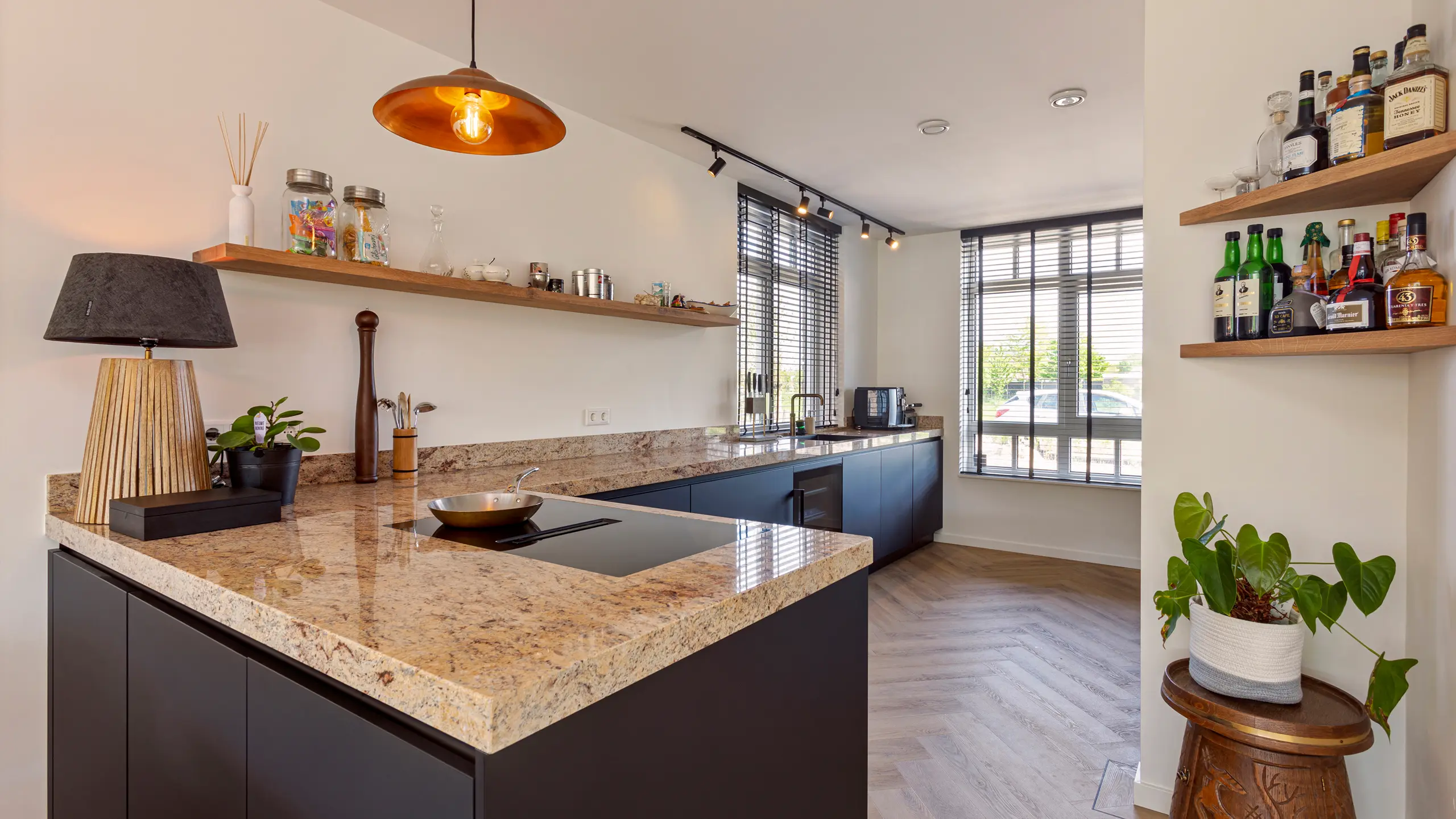 Deze prachtige keuken combineert diepe zwarte fronten met een opvallend amberkleurig marmerlook werkblad dat warmte en luxe uitstraalt. De open houten schappen voegen een natuurlijk accent toe, terwijl de verlichting en accessoires zorgen voor een uitnodigende sfeer. Het royale werkblad biedt volop ruimte om te koken, borrelen of ontspannen, en de stijlvolle wijnhoek maakt de keuken compleet.