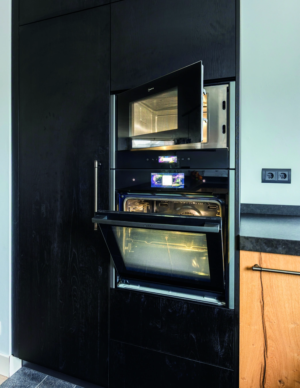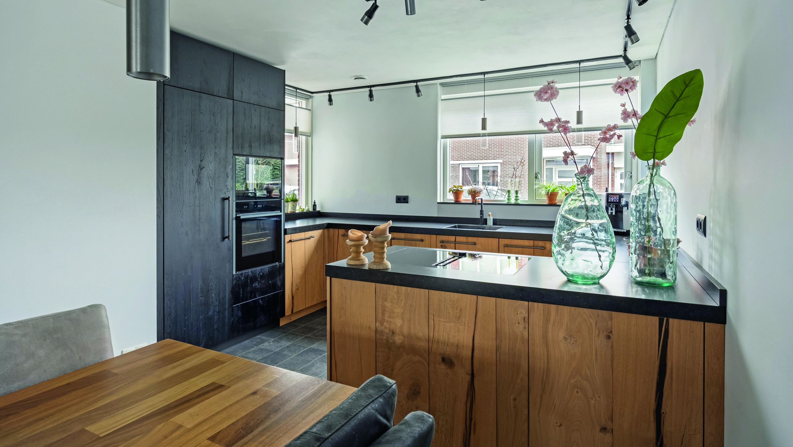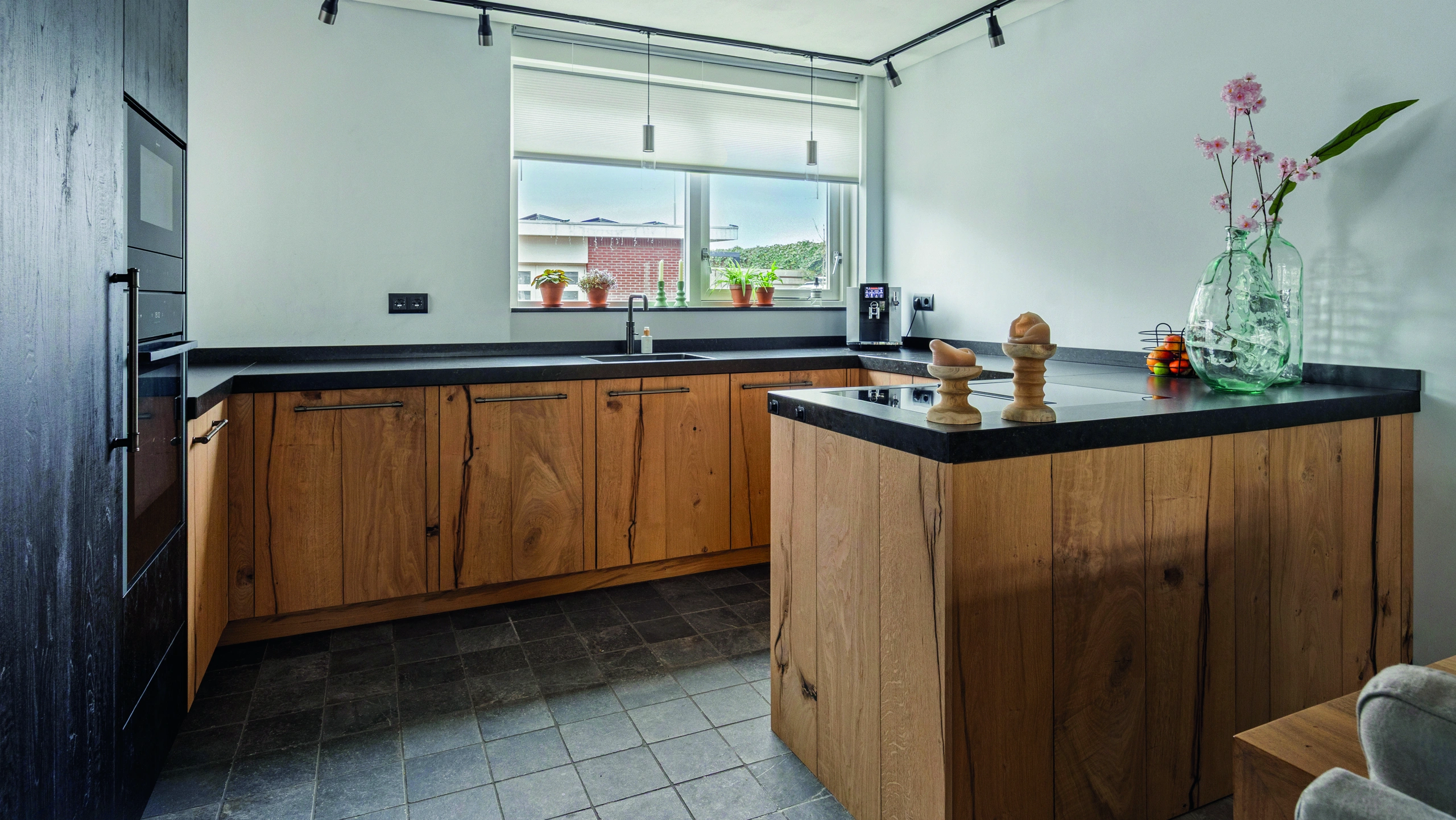 Deze u-vormige keuken combineert robuust hout met Duitse kwaliteit. De zwarte wand met hoogwaardige inbouwapparatuur zorgt voor een krachtig contrast. Een moderne heetwaterkraan verhoogt het comfort en maakt koken efficiënt, stijlvol en perfect afgestemd op dagelijks gebruik in elke woning.