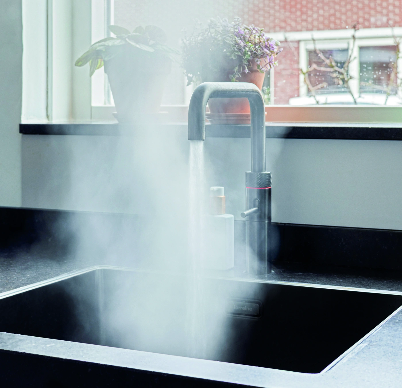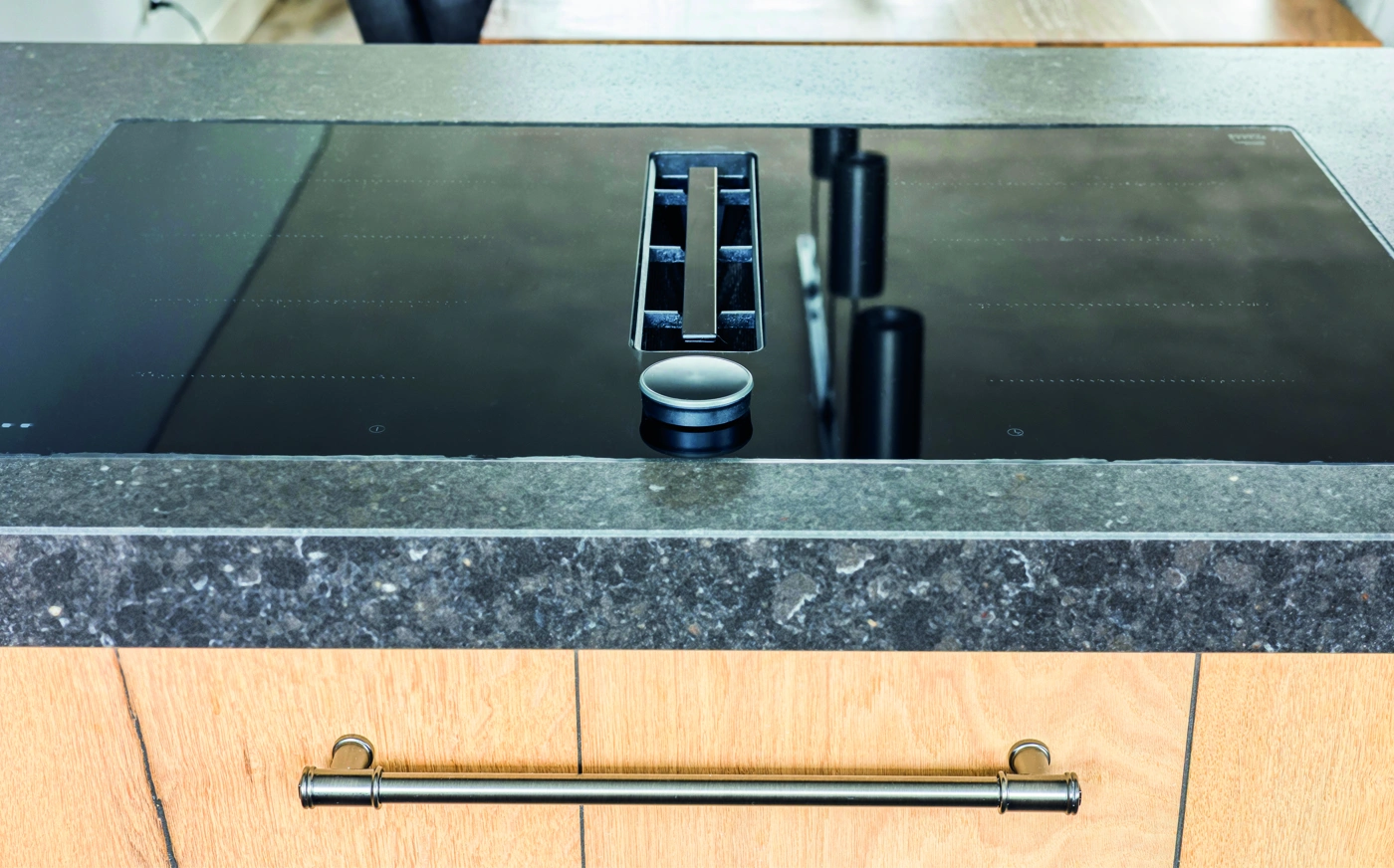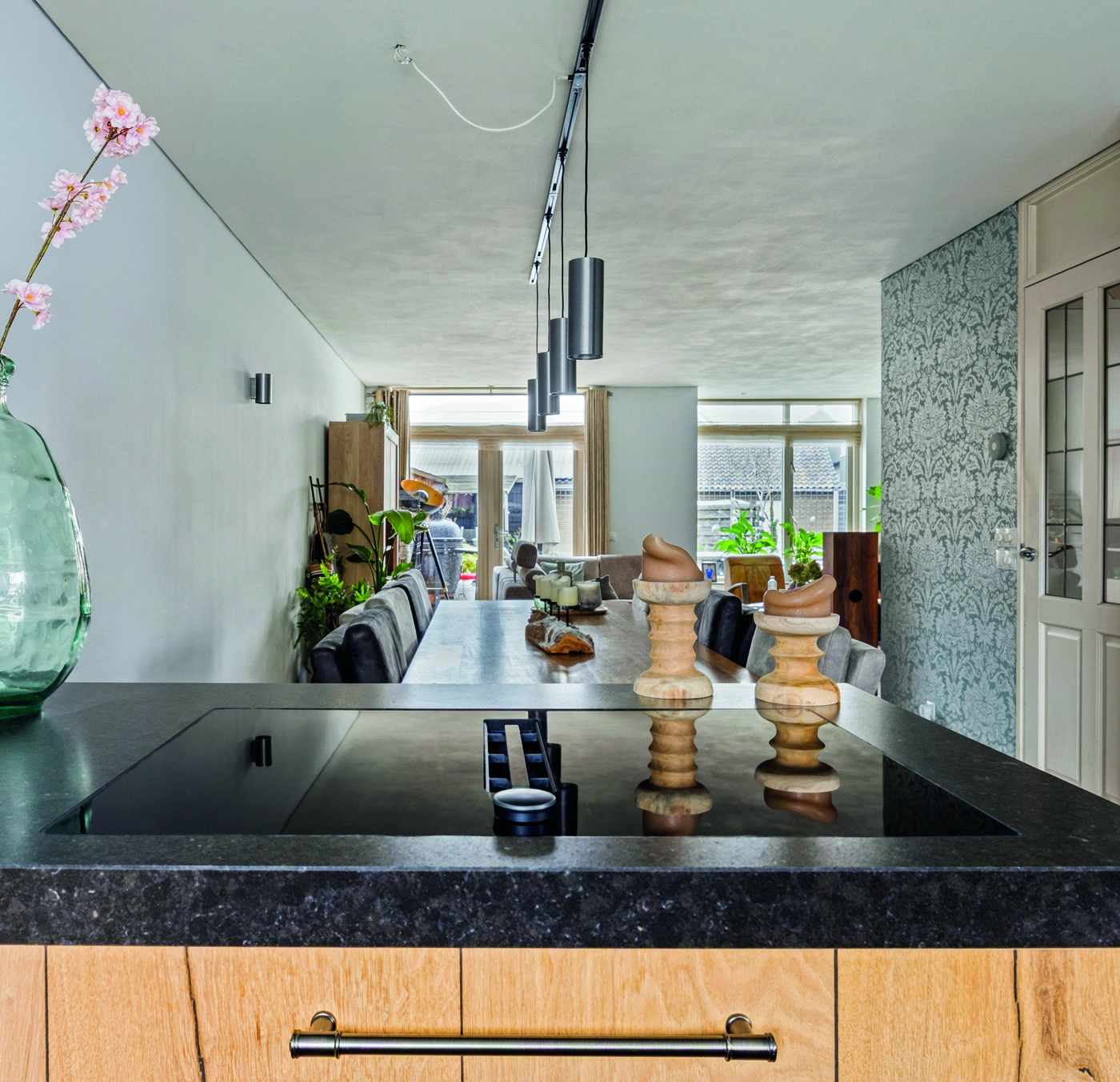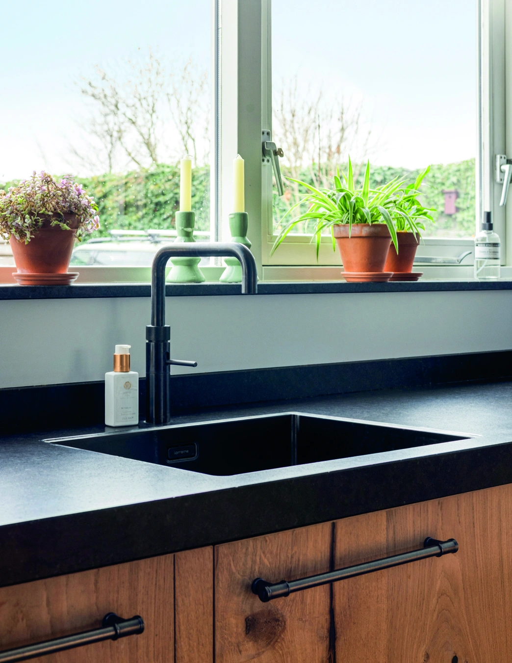 Deze u-vormige keuken combineert robuust hout met Duitse kwaliteit. De zwarte wand met hoogwaardige inbouwapparatuur zorgt voor een krachtig contrast. Een moderne heetwaterkraan verhoogt het comfort en maakt koken efficiënt, stijlvol en perfect afgestemd op dagelijks gebruik in elke woning.