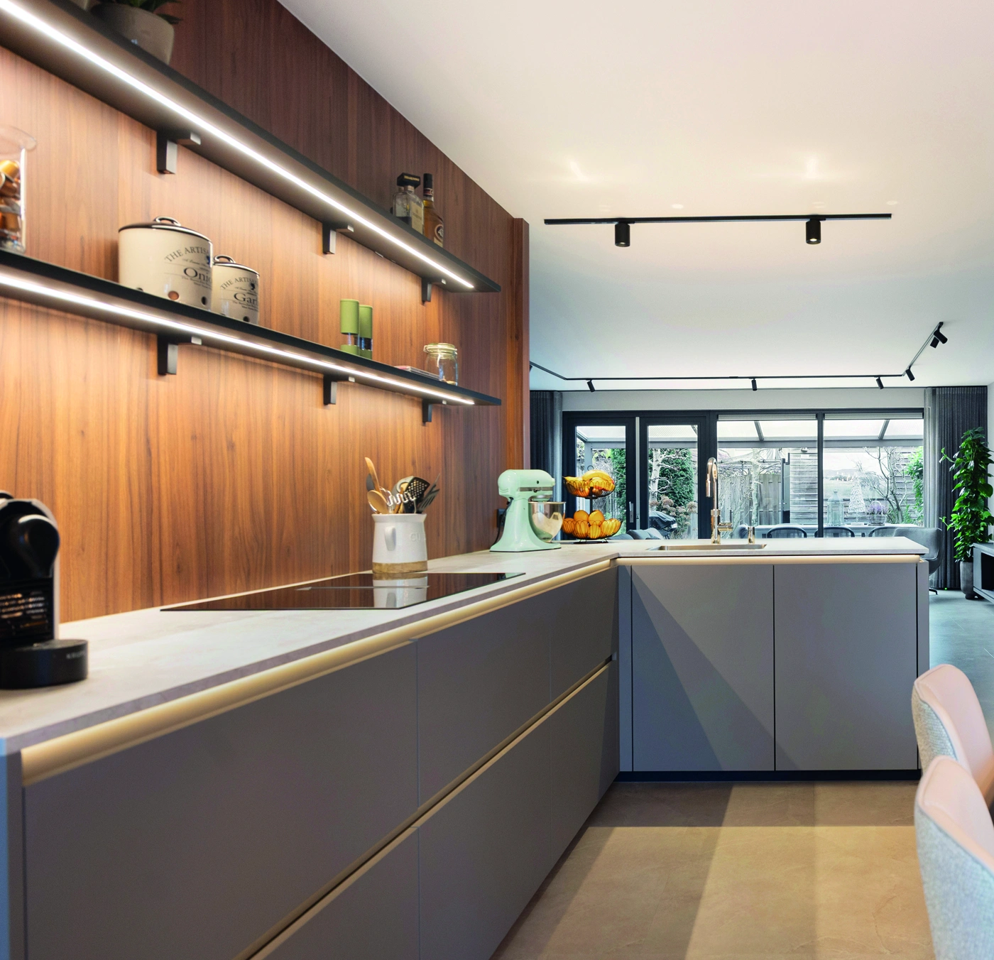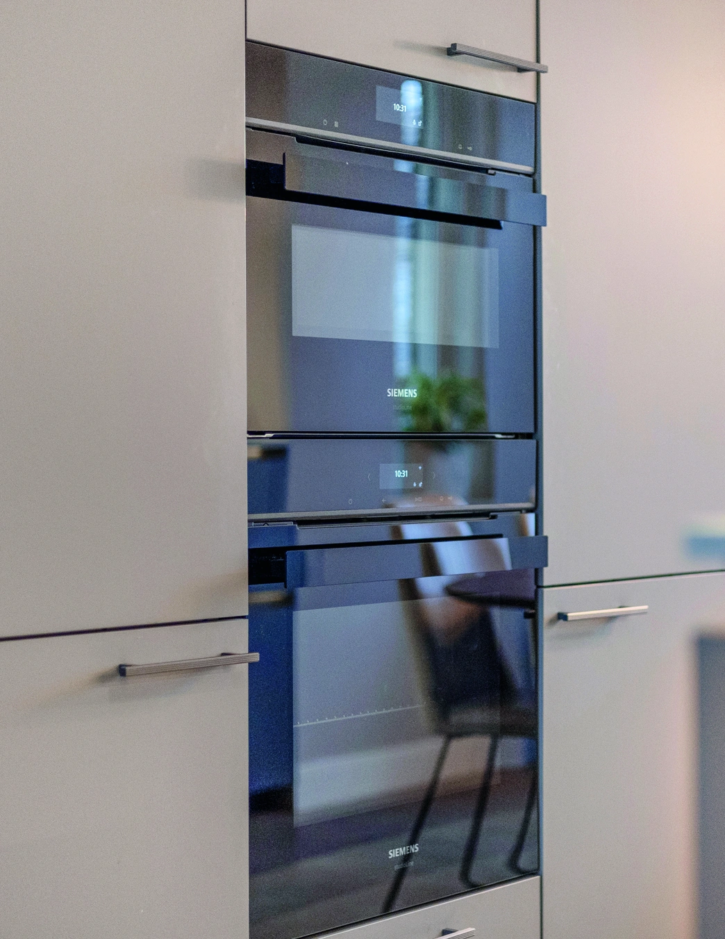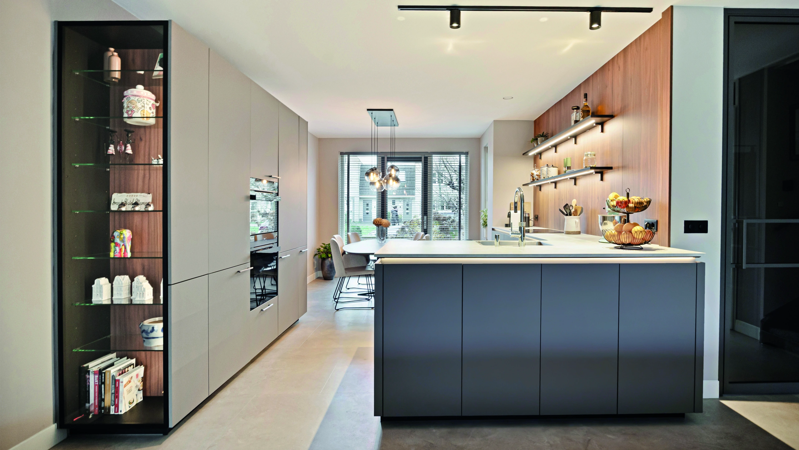 Stijlvolle blauwe hoekkeuken gecombineerd met een losse grijze kastenwand. Voorzien van hoogwaardige Siemens apparatuur en ontworpen met veel slimme bergruimte. Duitse kwaliteit staat garant voor duurzaamheid, comfort en een tijdloos design dat jarenlang meegaat, in elke moderne keukenomgeving, perfect passend.
