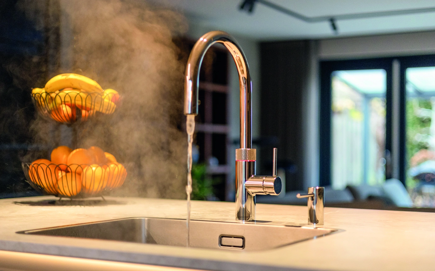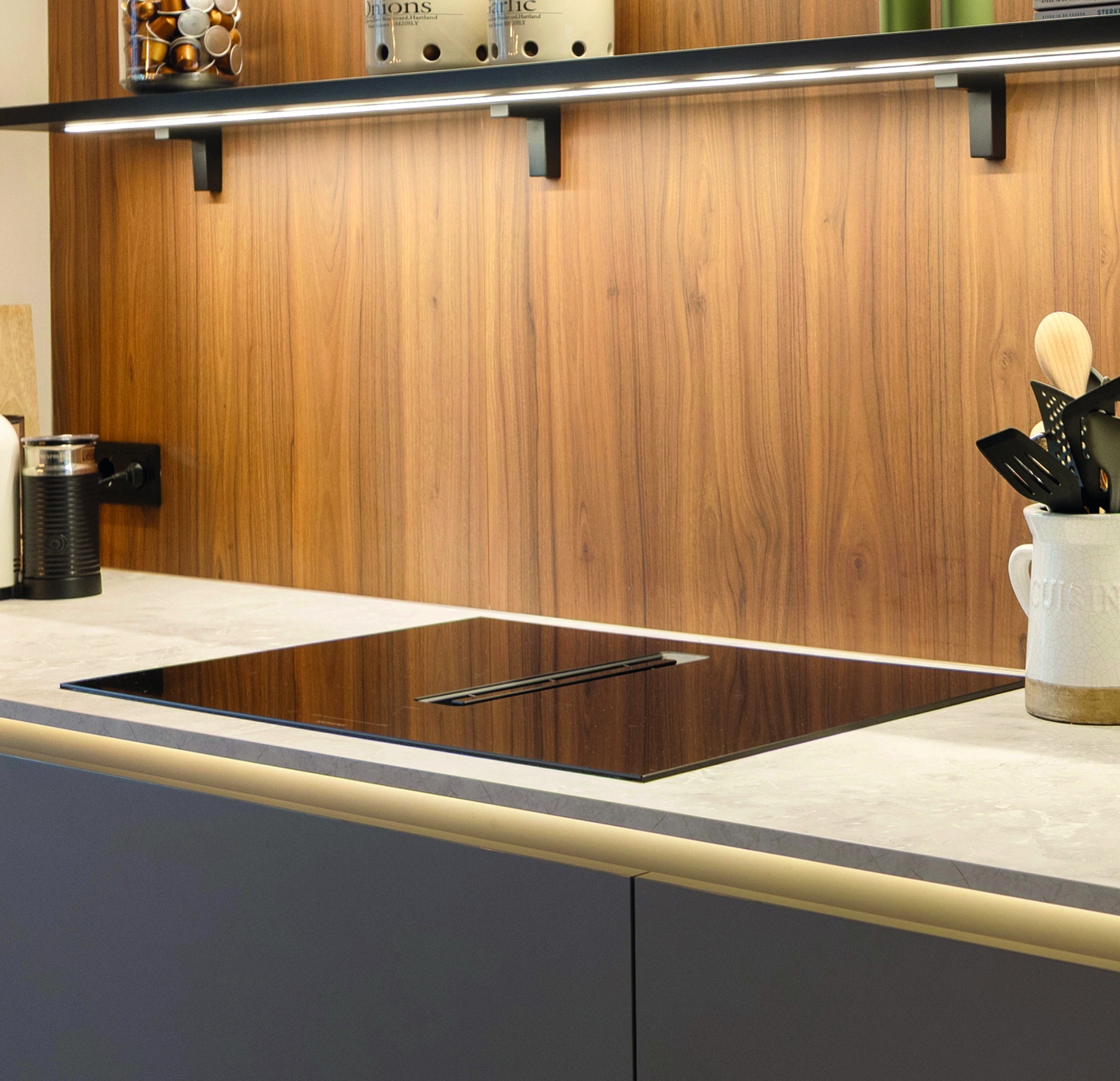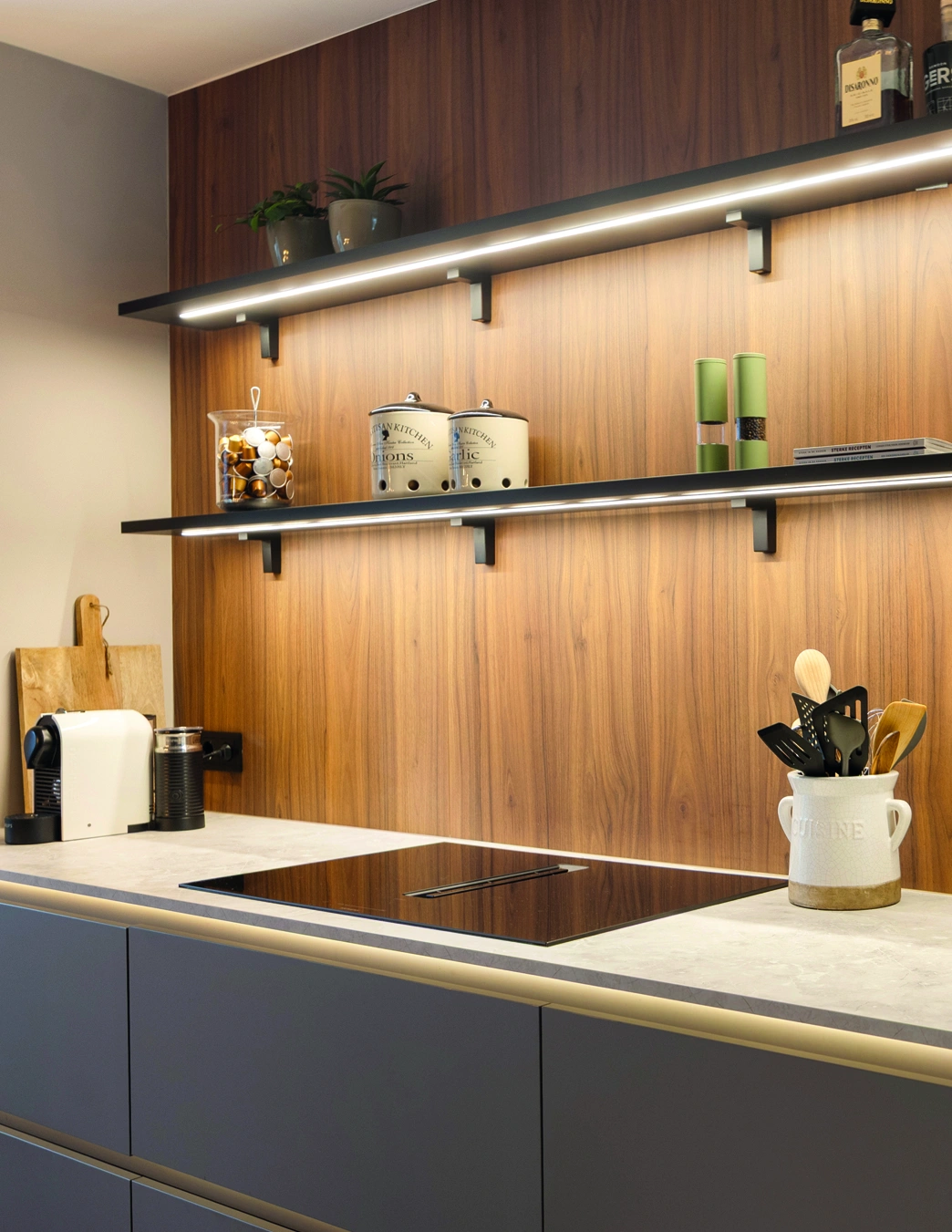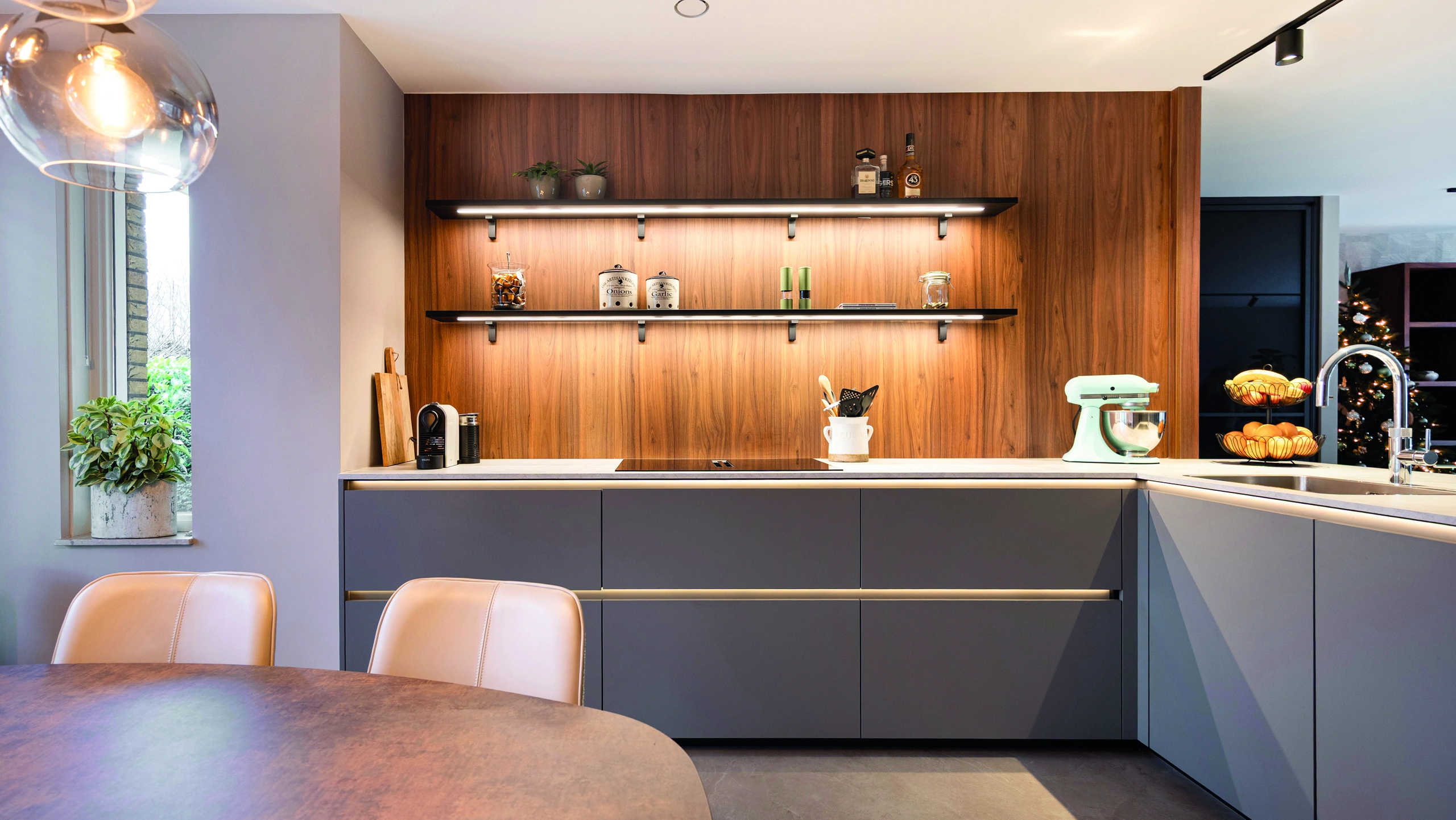 Stijlvolle blauwe hoekkeuken gecombineerd met een losse grijze kastenwand. Voorzien van hoogwaardige Siemens apparatuur en ontworpen met veel slimme bergruimte. Duitse kwaliteit staat garant voor duurzaamheid, comfort en een tijdloos design dat jarenlang meegaat, in elke moderne keukenomgeving, perfect passend.
