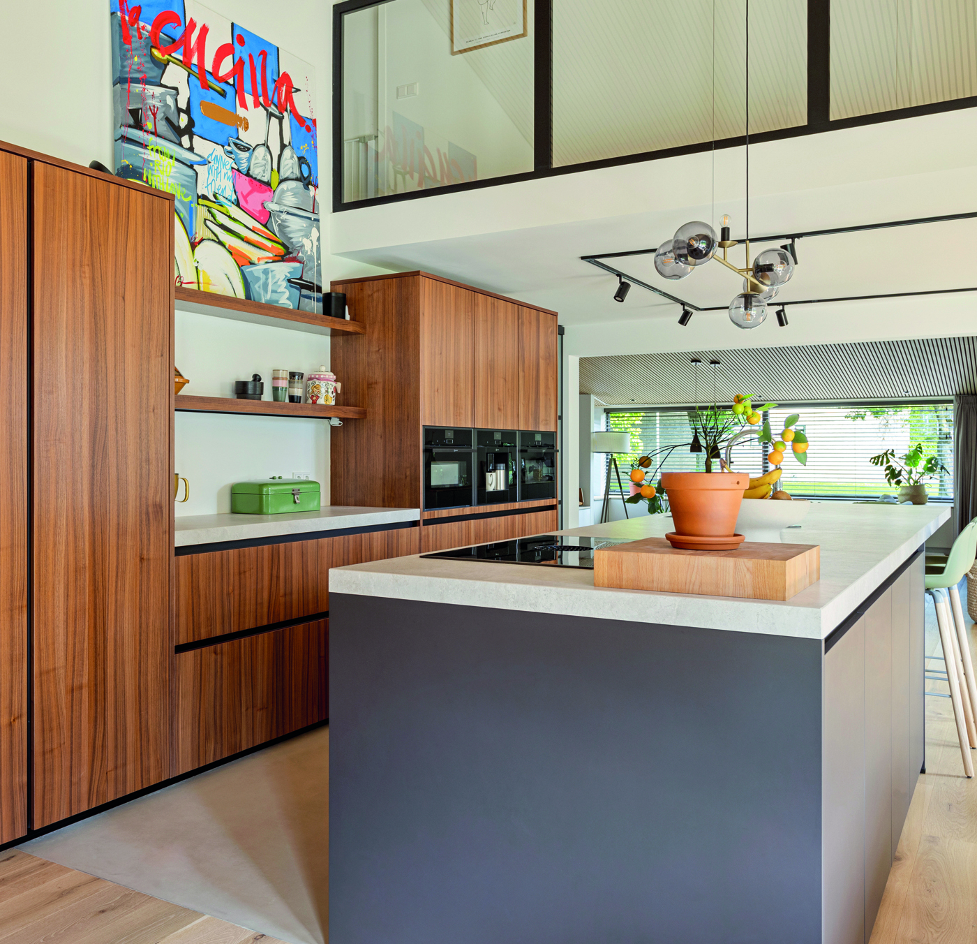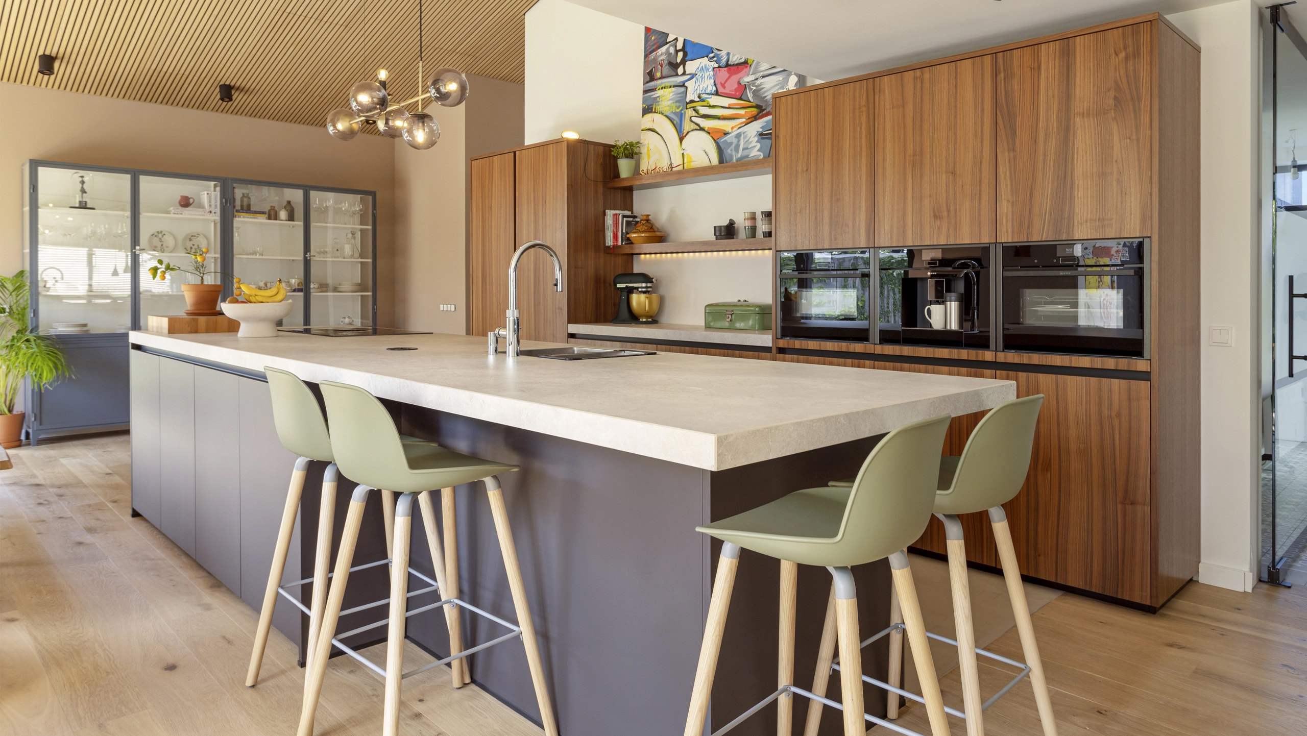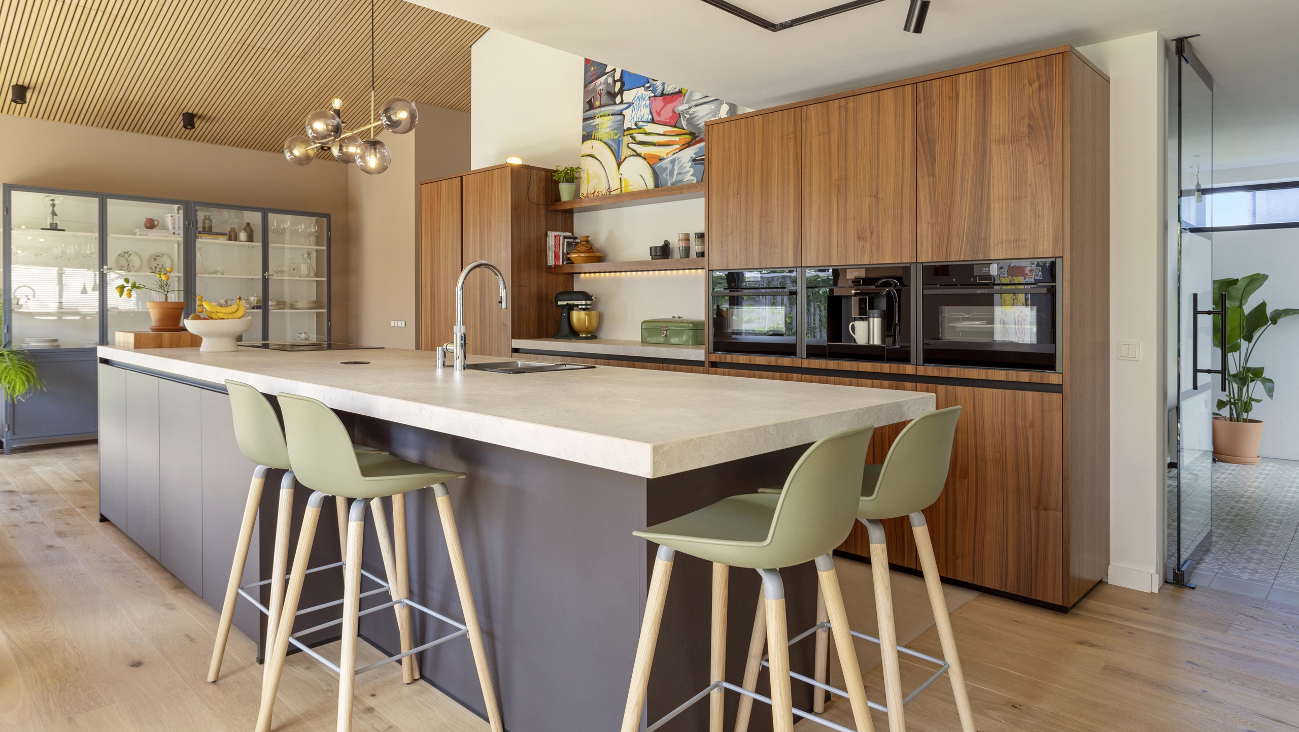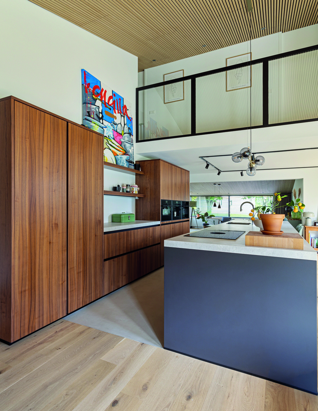 Deze moderne keuken combineert warme houttinten met strakke lijnen en een royaal kookeiland. De hoogwaardige apparatuur, geïntegreerde opbergruimte en stijlvolle verlichting zorgen voor comfort en functionaliteit. Een uitnodigende plek waar koken, samenkomen en genieten moeiteloos samenkomen in een eigentijds interieur.