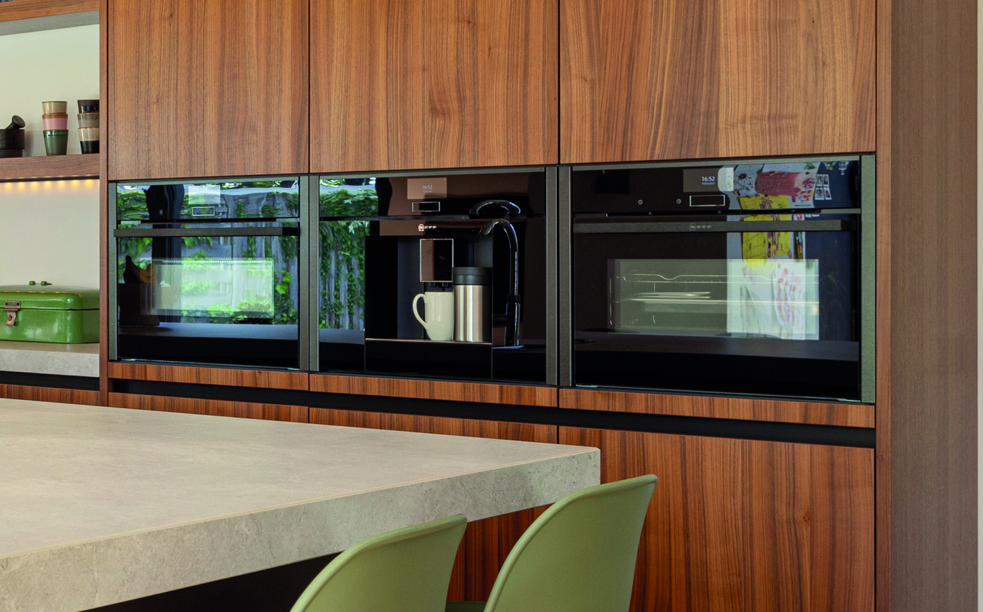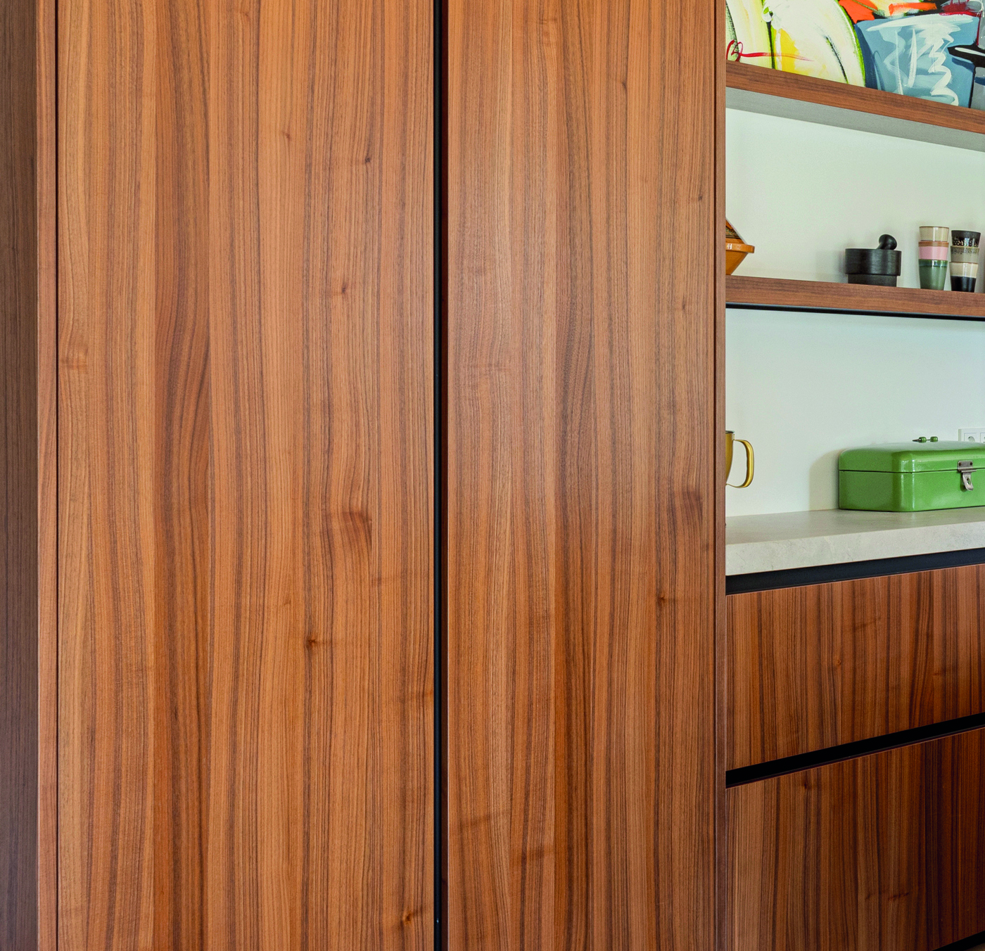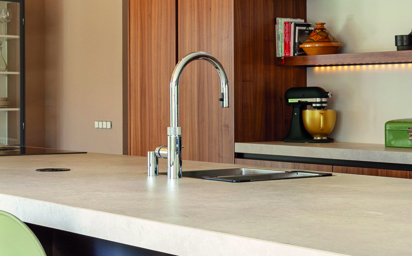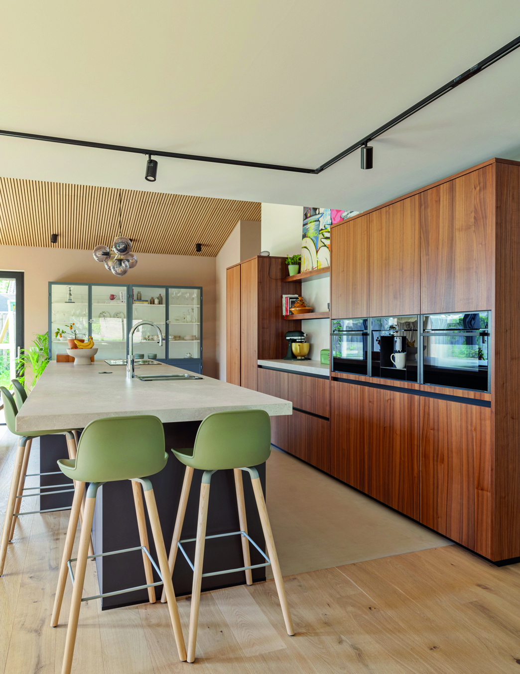 Deze moderne keuken combineert warme houttinten met strakke lijnen en een royaal kookeiland. De hoogwaardige apparatuur, geïntegreerde opbergruimte en stijlvolle verlichting zorgen voor comfort en functionaliteit. Een uitnodigende plek waar koken, samenkomen en genieten moeiteloos samenkomen in een eigentijds interieur.