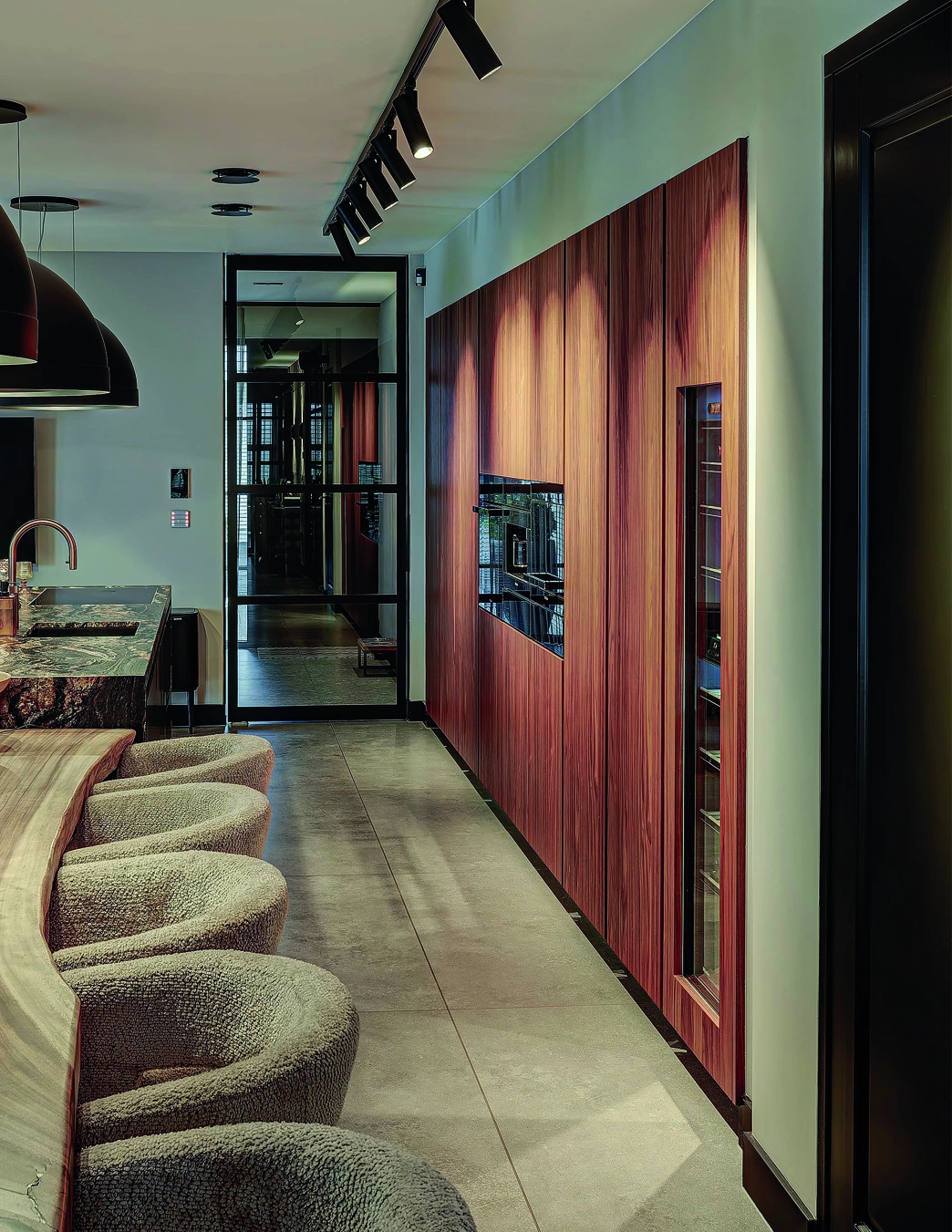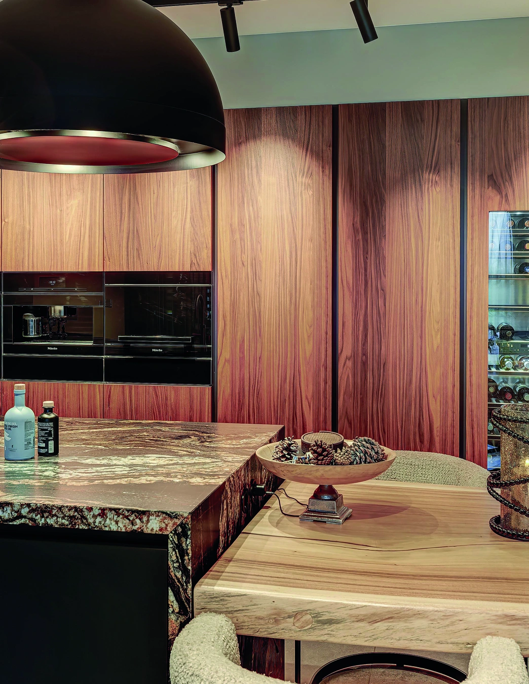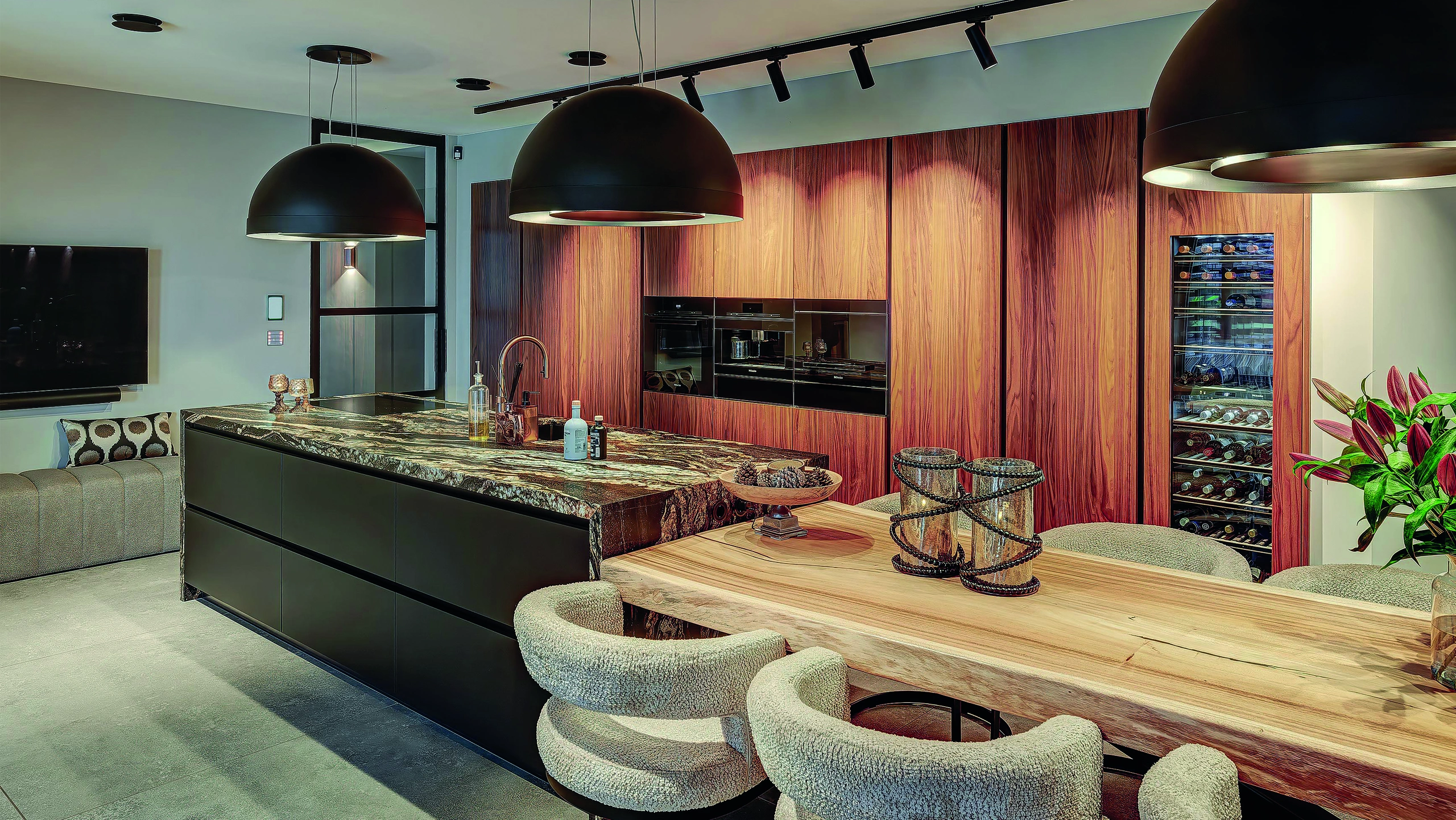 Deze luxe keuken straalt warmte en elegantie uit. Rijke houttinten, natuurstenen werkbladen en verfijnde verlichting creëren een hotelwaardige sfeer. Het royale kookeiland nodigt uit tot koken, ontmoeten en genieten, met hoogwaardige apparatuur en maatwerk tot in perfectie voor modern wonen.