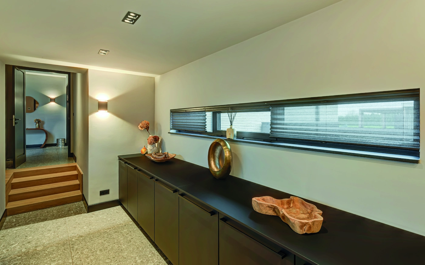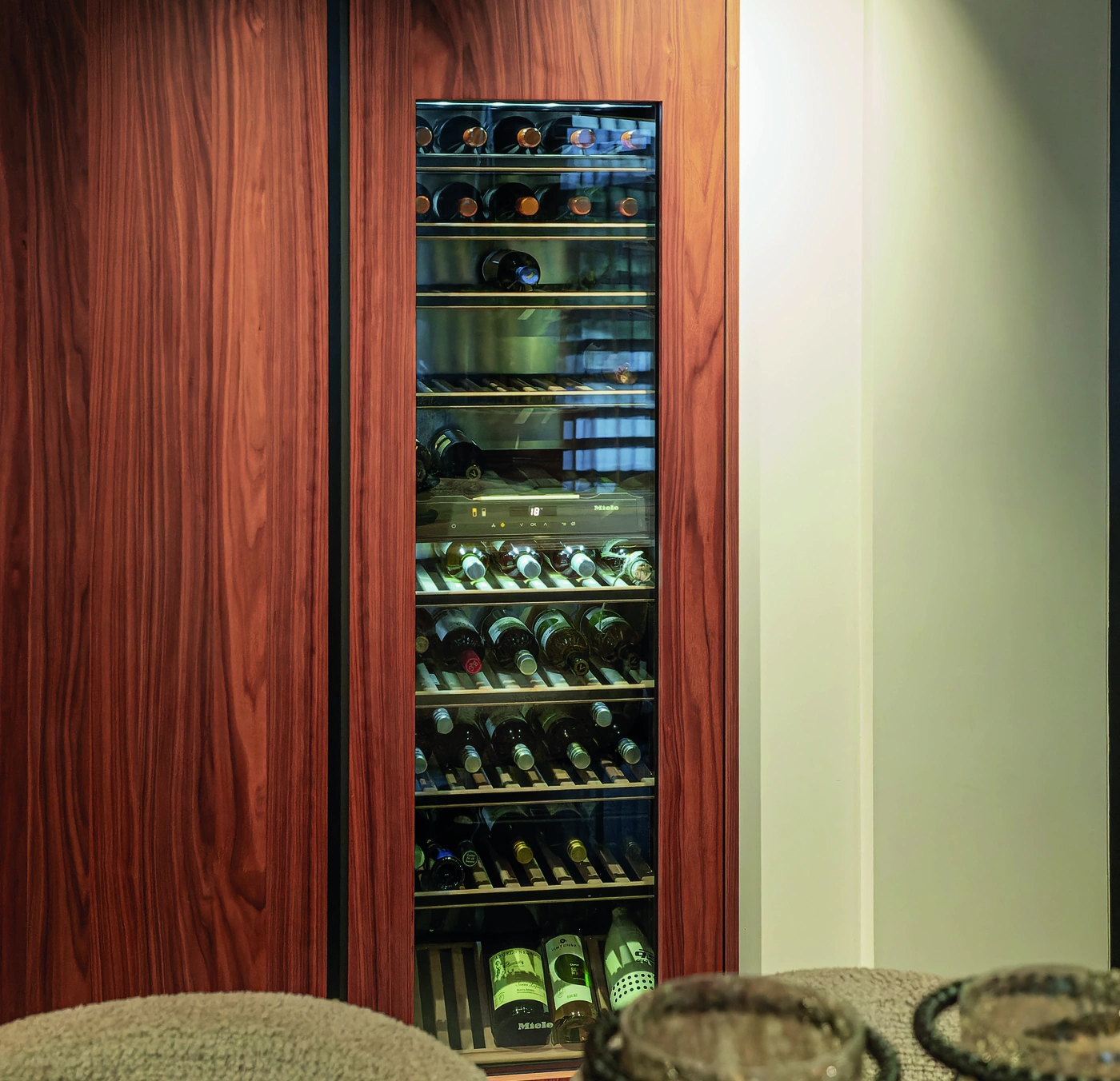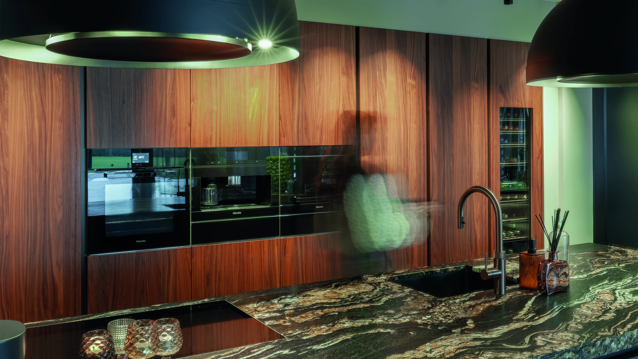 Deze luxe keuken straalt warmte en elegantie uit. Rijke houttinten, natuurstenen werkbladen en verfijnde verlichting creëren een hotelwaardige sfeer. Het royale kookeiland nodigt uit tot koken, ontmoeten en genieten, met hoogwaardige apparatuur en maatwerk tot in perfectie voor modern wonen.