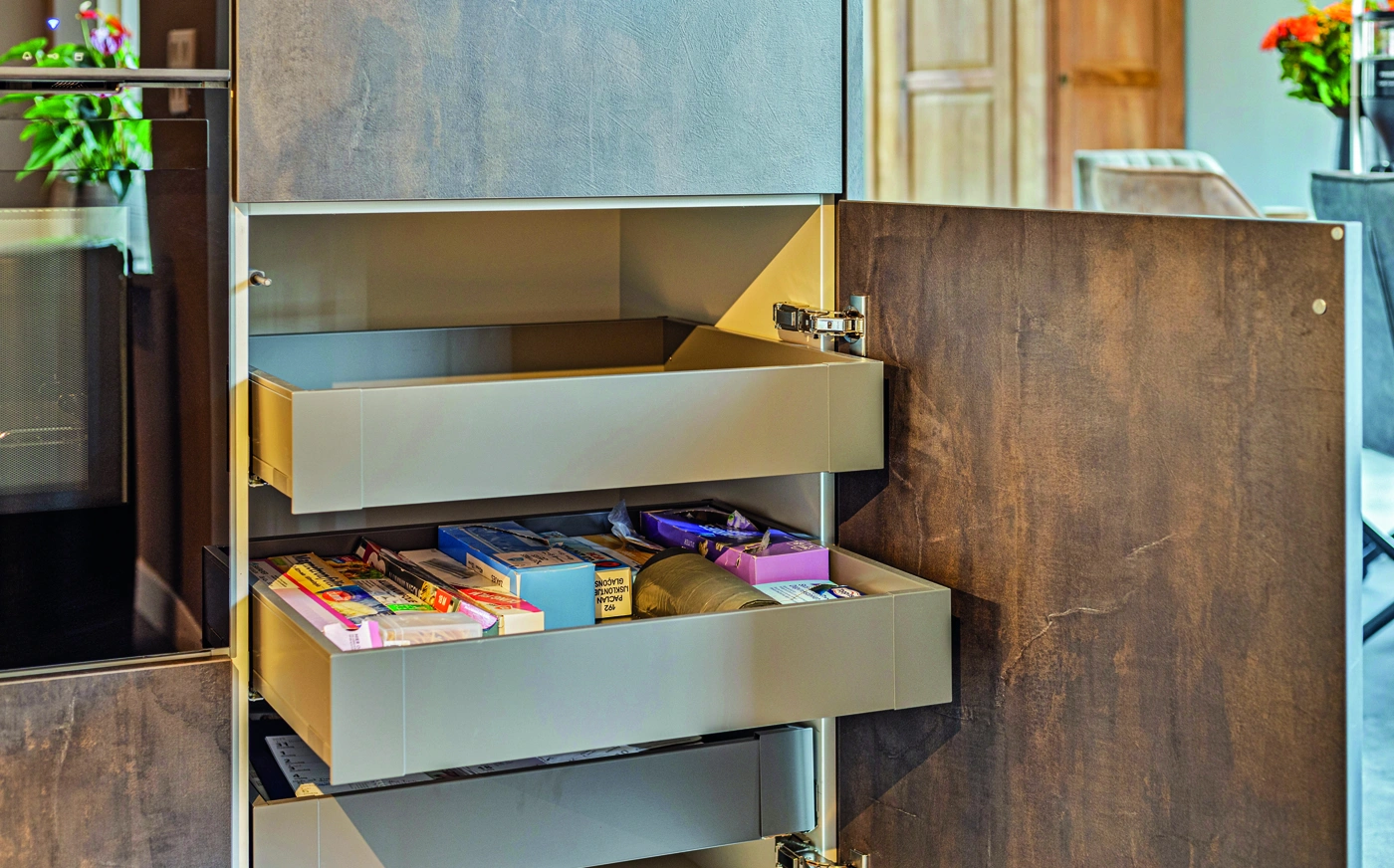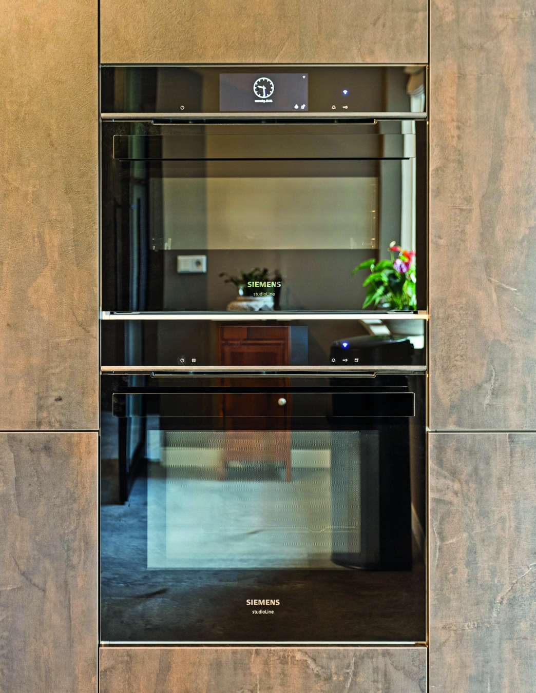 Moderne keuken met warme aardetinten, strakke lijnen en luxe inbouwapparatuur. Het robuuste kastenwandontwerp contrasteert elegant met lichte fronten en een rustig werkblad. Een harmonieuze leefkeuken waar design, comfort en functionaliteit samenkomen in een tijdloze, stijlvolle woonomgeving voor dagelijks modern wonen.