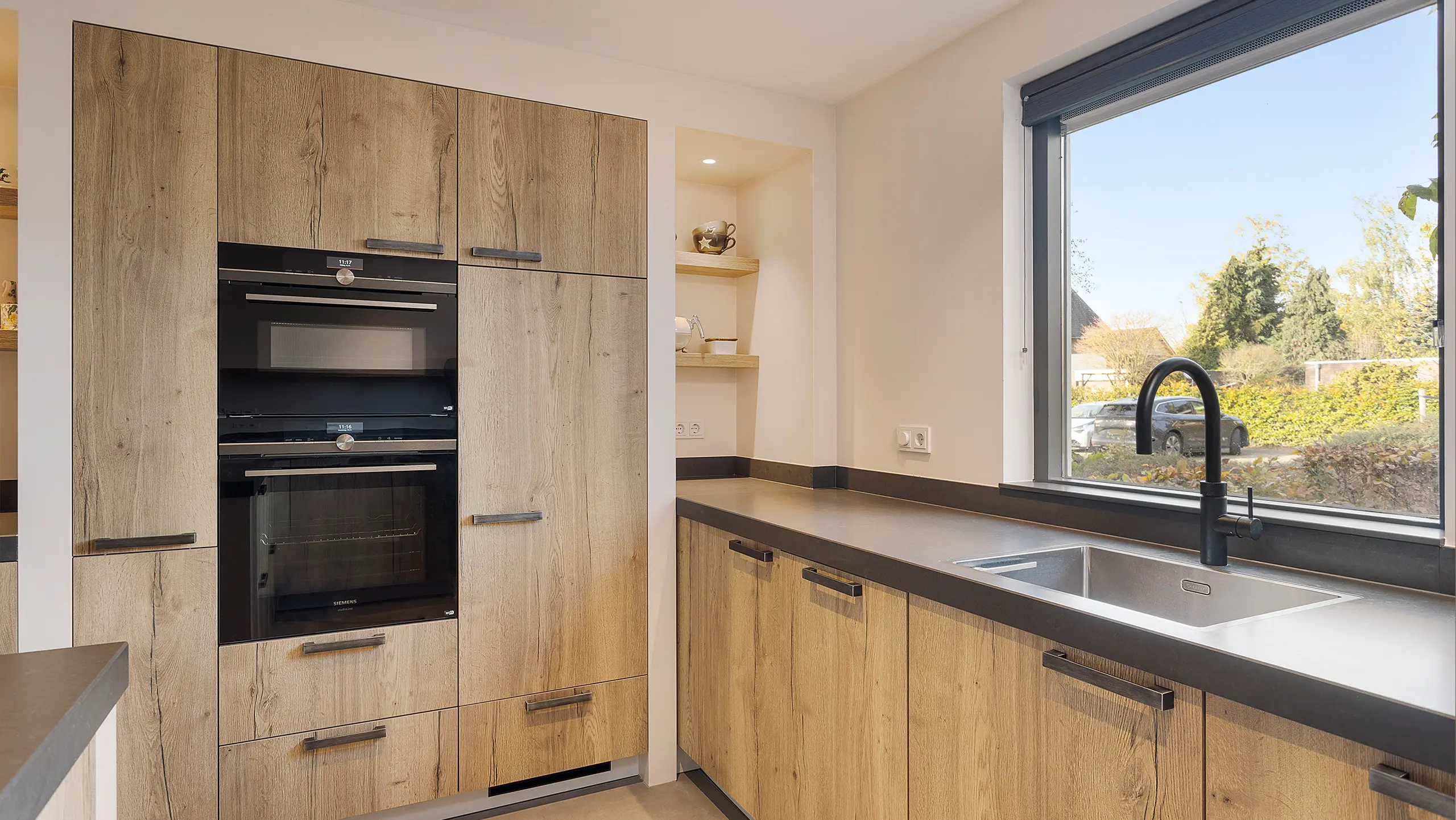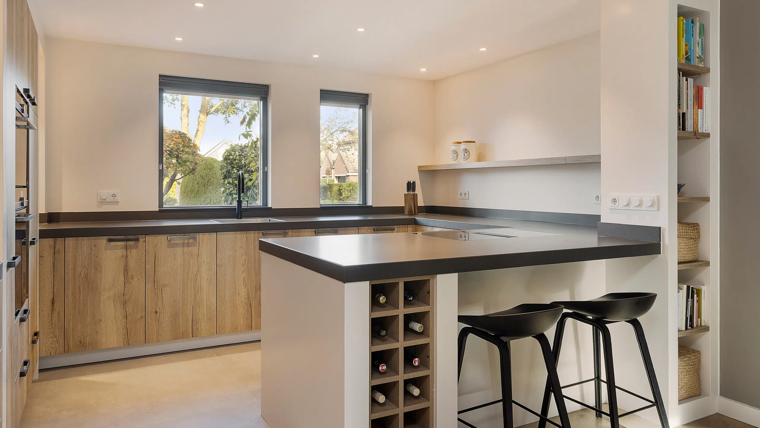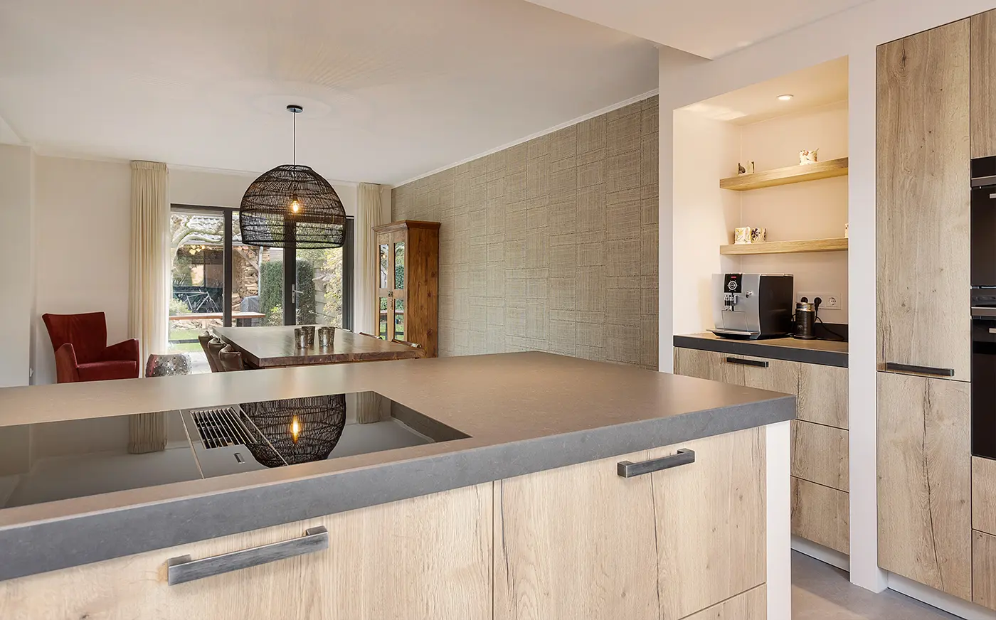 Deze landelijk moderne keuken combineert natuurlijke warmte met eigentijdse elegantie. De houten fronten en zwarte details zorgen voor een stijlvolle balans, terwijl het royale werkblad uitnodigt tot koken én gezellig samenzijn aan de bar. Slim ontworpen met een nis-kast, open planken en een geïntegreerde wijnkast, biedt deze keuken zowel sfeer als praktische opbergruimte.