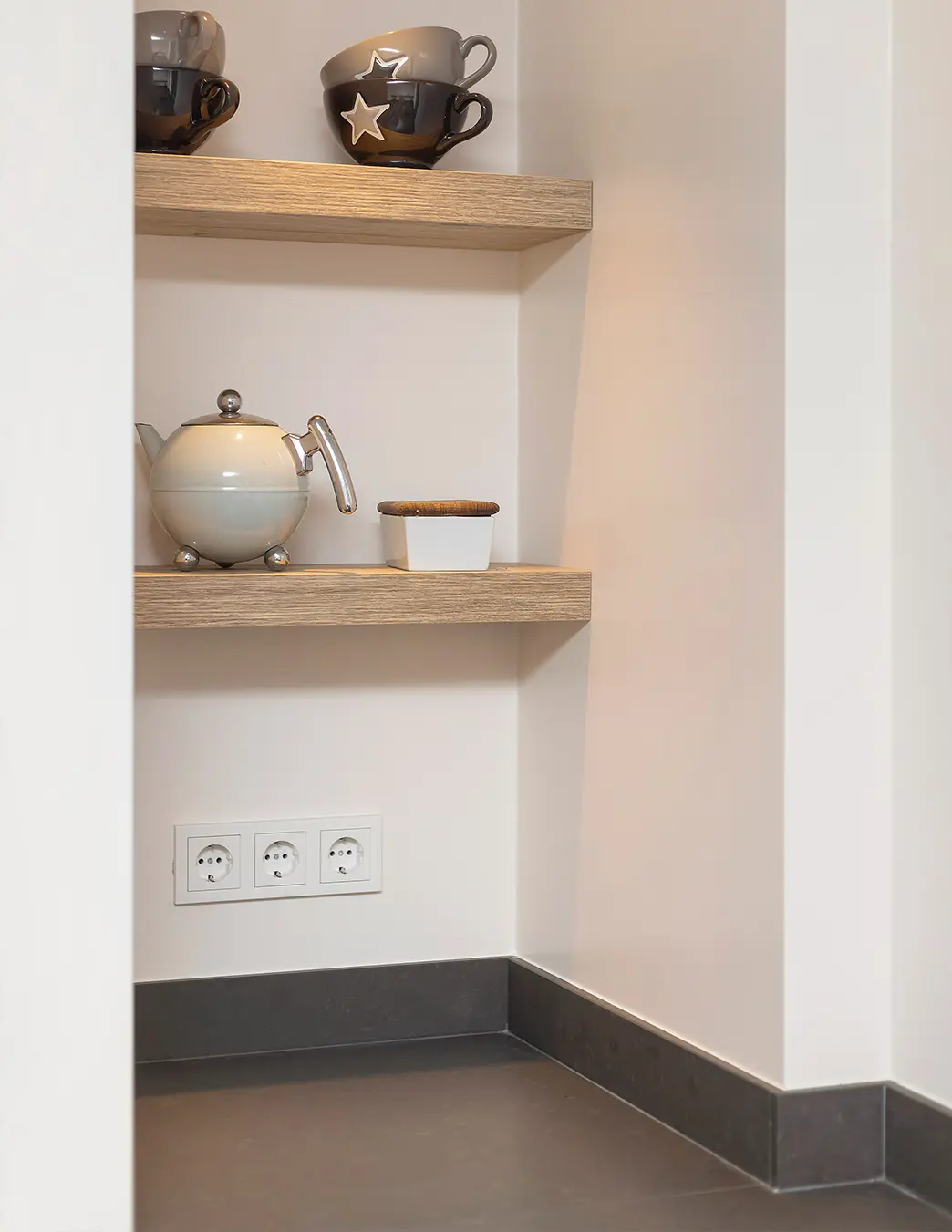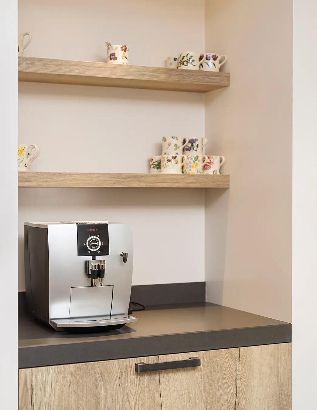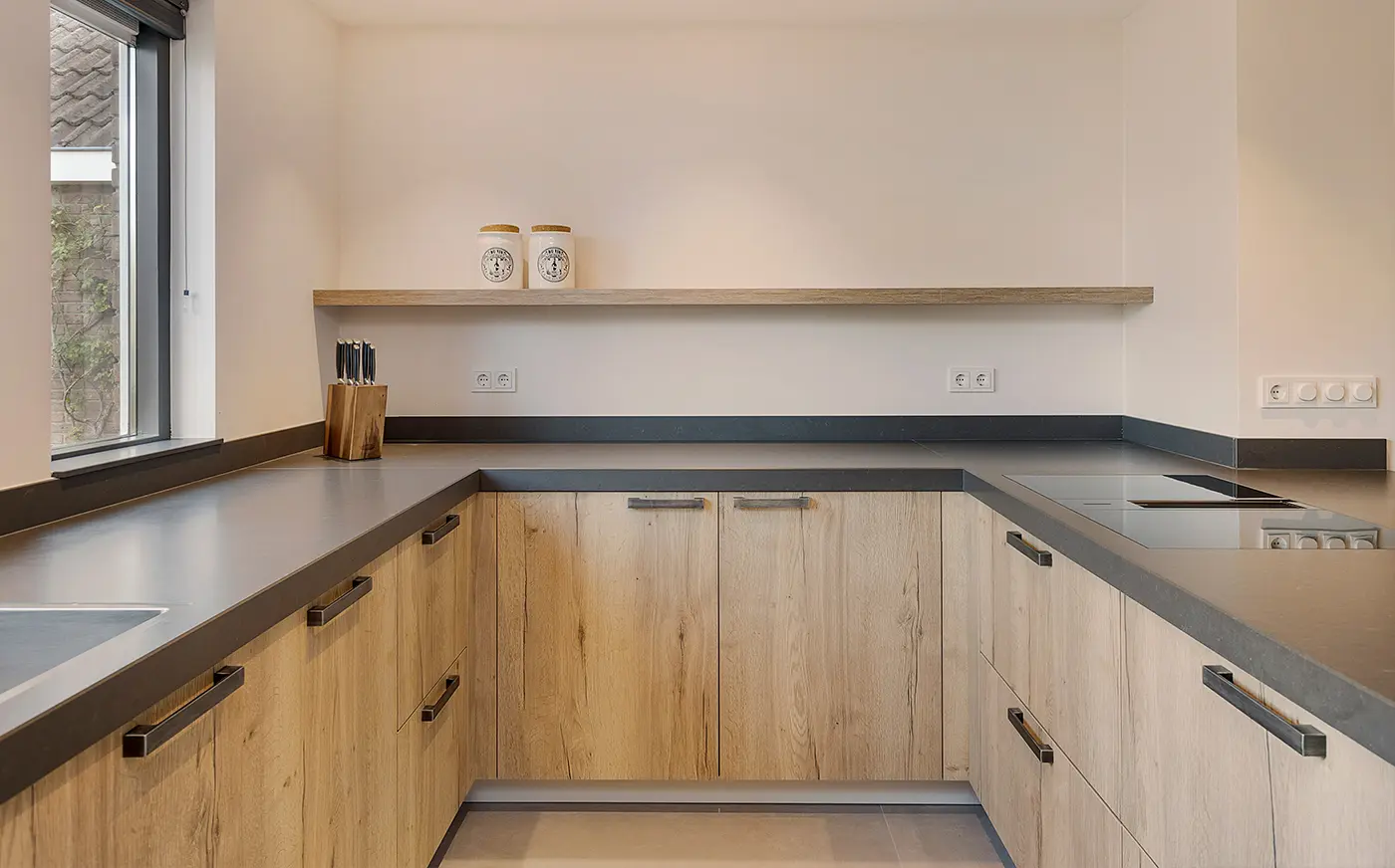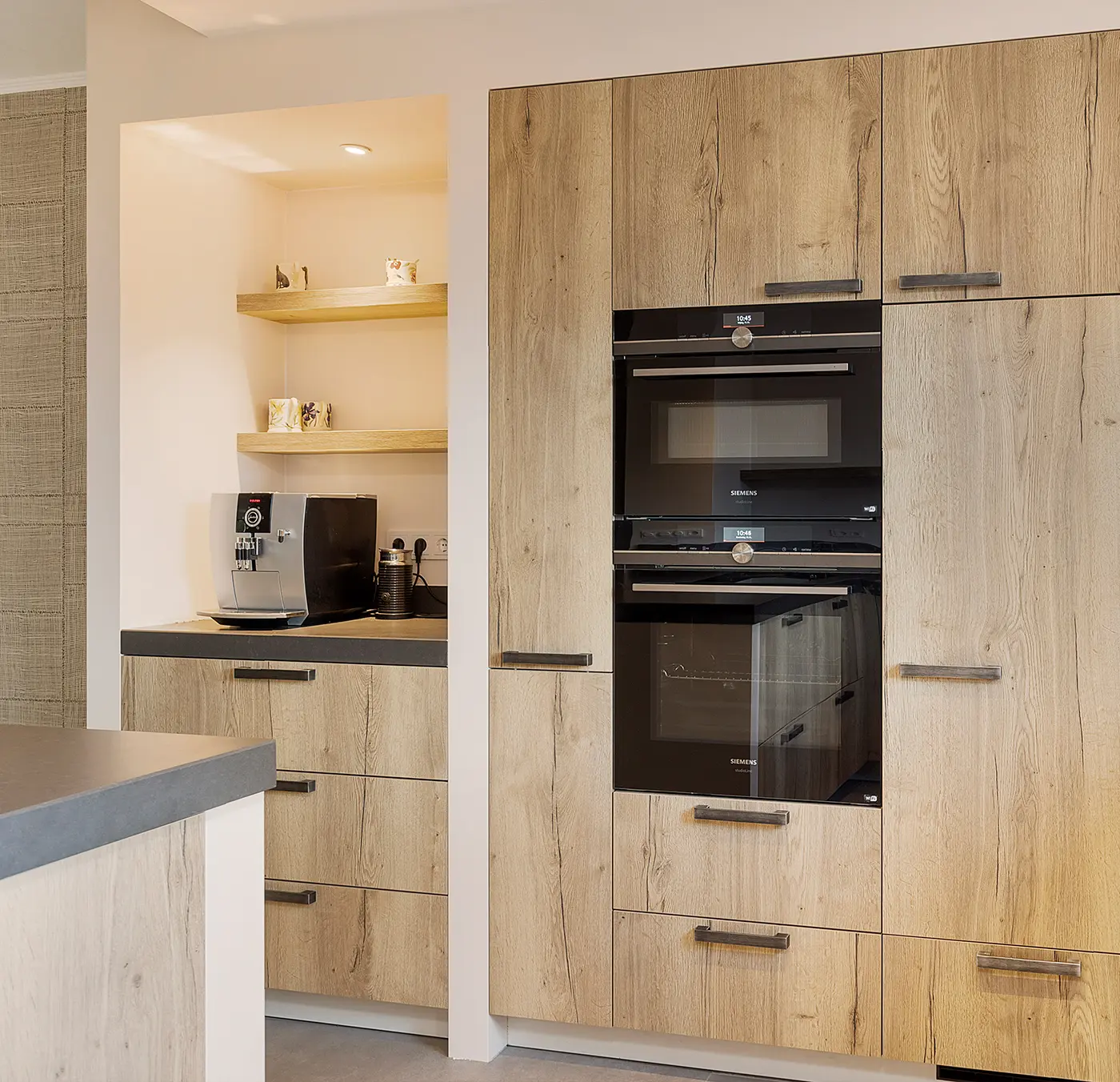 Deze landelijk moderne keuken combineert natuurlijke warmte met eigentijdse elegantie. De houten fronten en zwarte details zorgen voor een stijlvolle balans, terwijl het royale werkblad uitnodigt tot koken én gezellig samenzijn aan de bar. Slim ontworpen met een nis-kast, open planken en een geïntegreerde wijnkast, biedt deze keuken zowel sfeer als praktische opbergruimte.