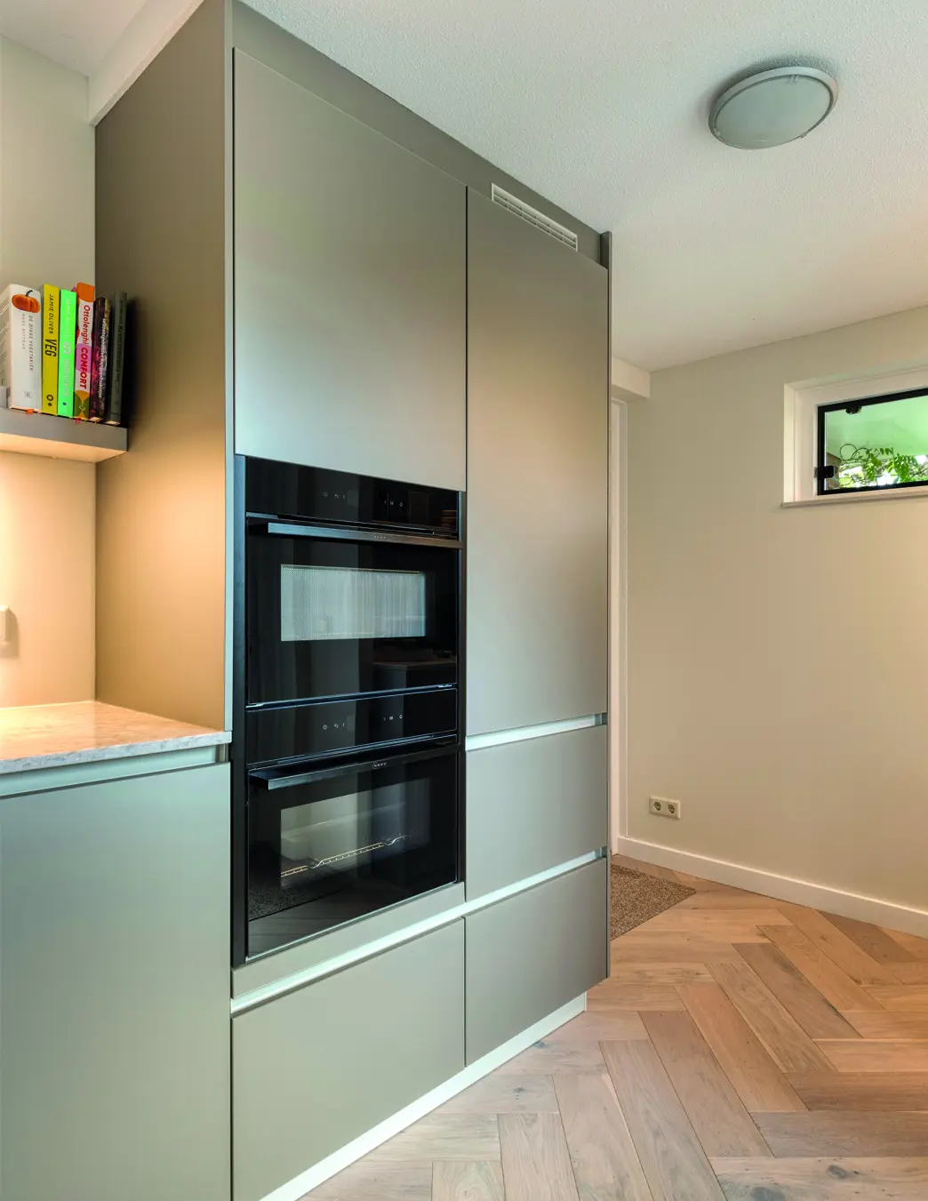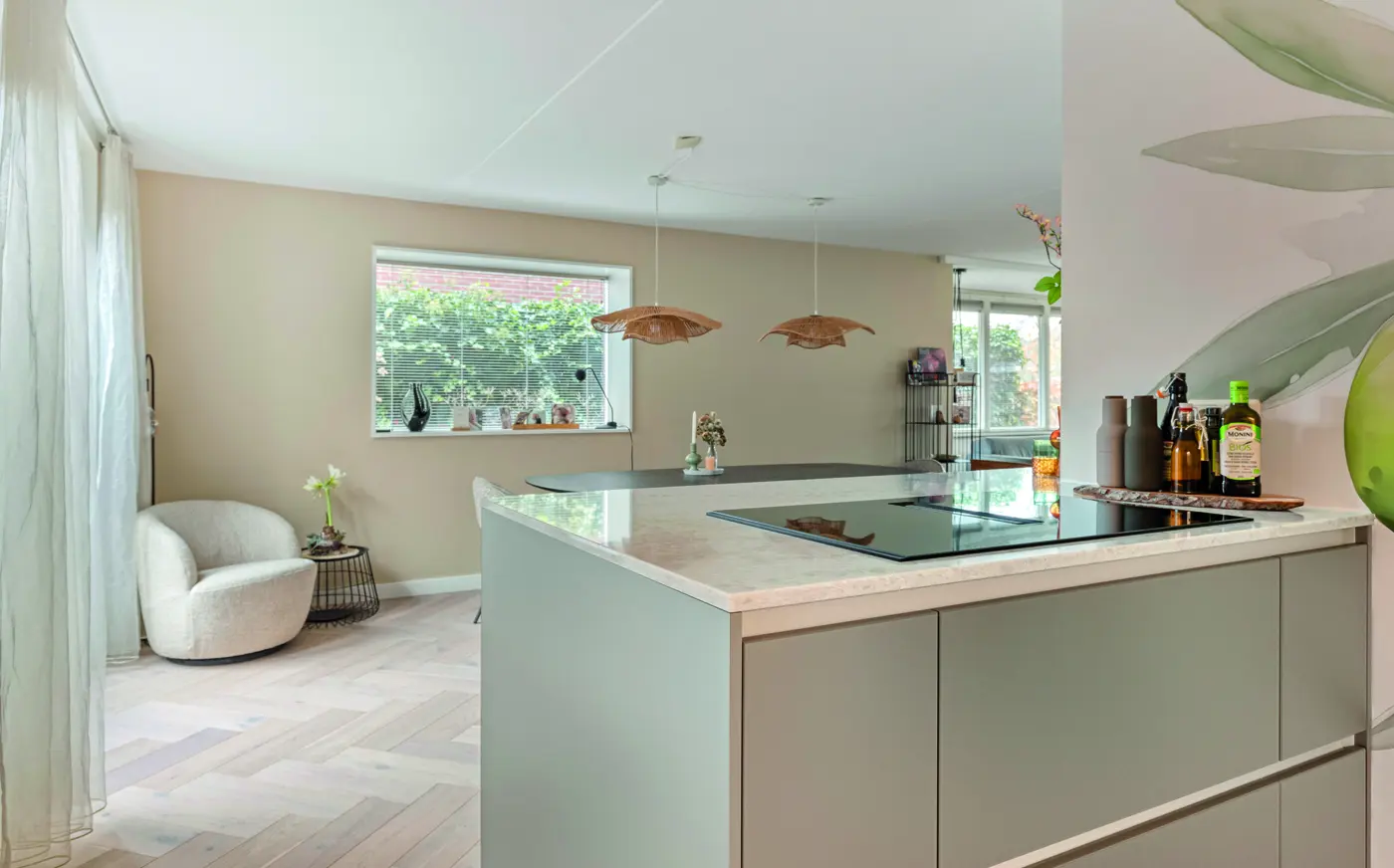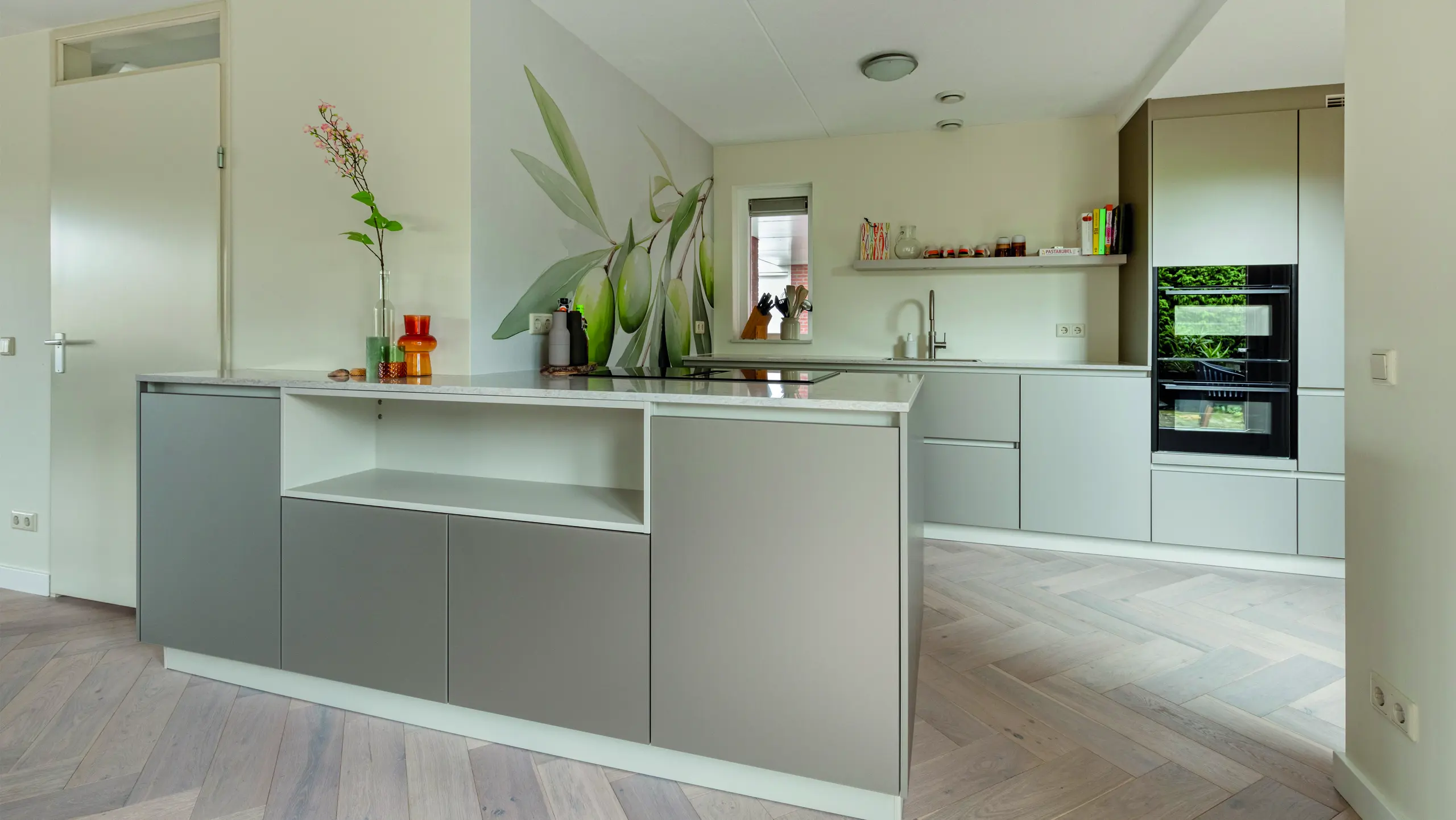 Moderne keuken met strakke lijnen, lichtgrijze tinten, en slimme indeling. Het kookeiland verbindt wonen en koken, terwijl hoogwaardige materialen, veel licht en doordachte details zorgen voor comfort, rust en tijdloze elegantie in elke dagelijkse leefruimte voor gezinnen en levensgenieters samen.
