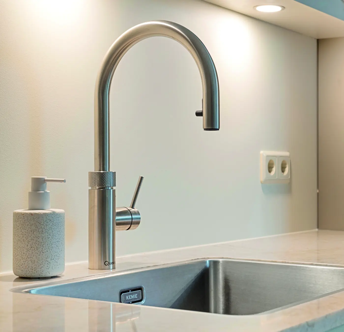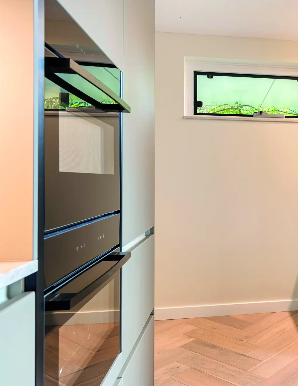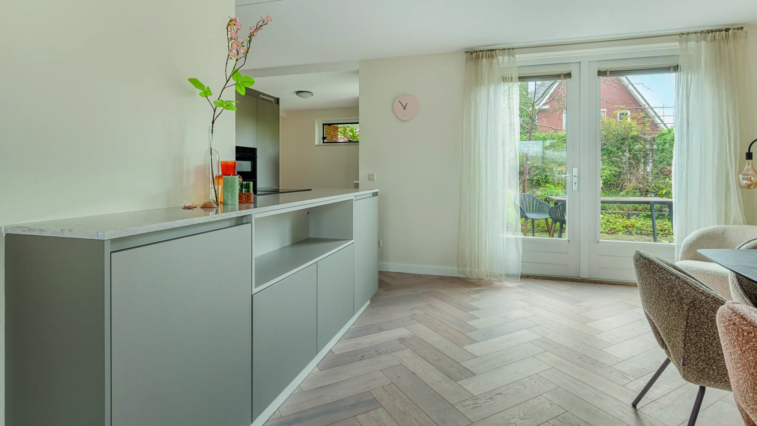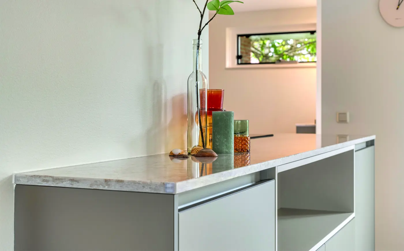 Moderne keuken met strakke lijnen, lichtgrijze tinten, en slimme indeling. Het kookeiland verbindt wonen en koken, terwijl hoogwaardige materialen, veel licht en doordachte details zorgen voor comfort, rust en tijdloze elegantie in elke dagelijkse leefruimte voor gezinnen en levensgenieters samen.