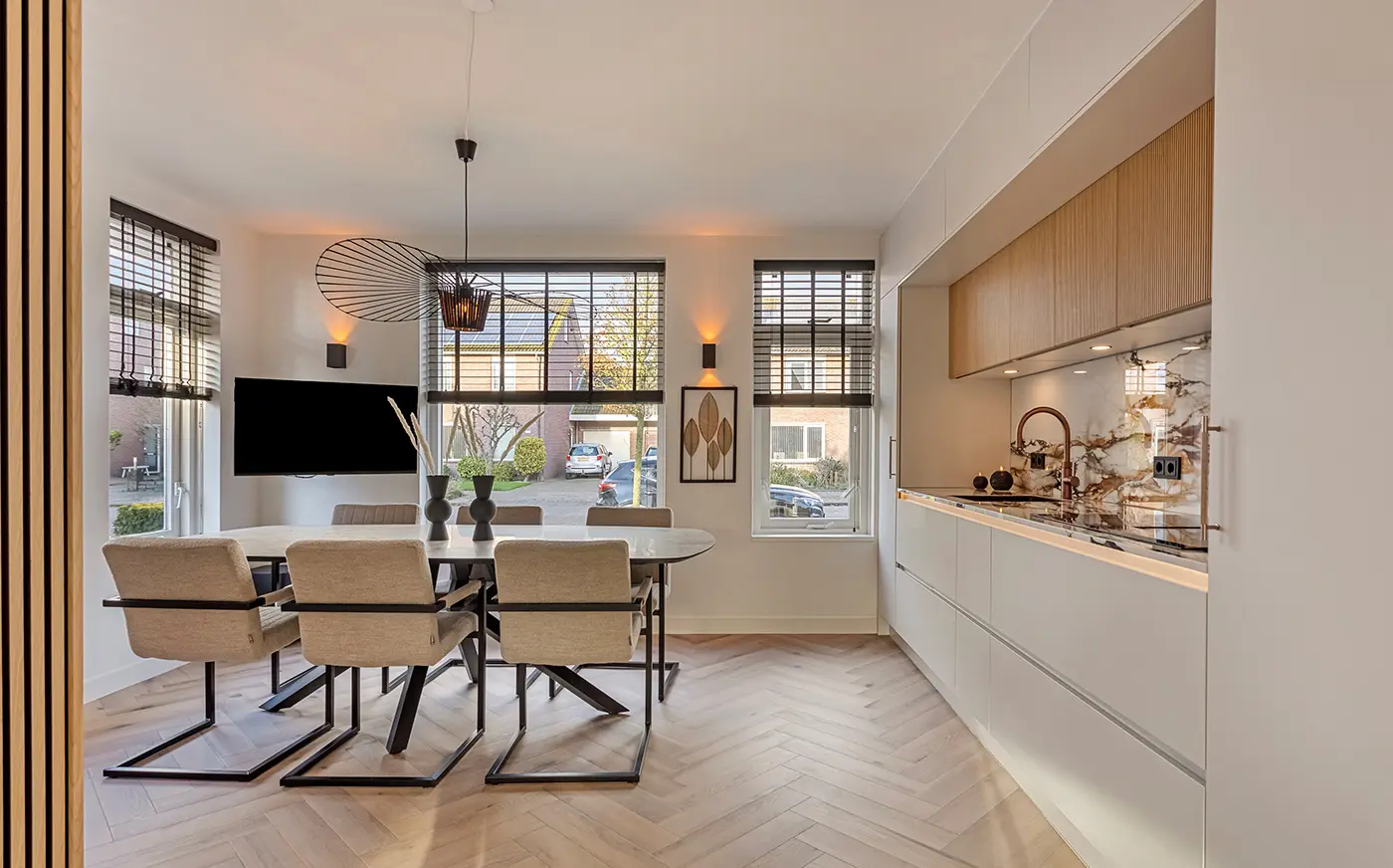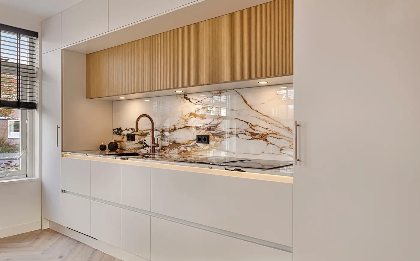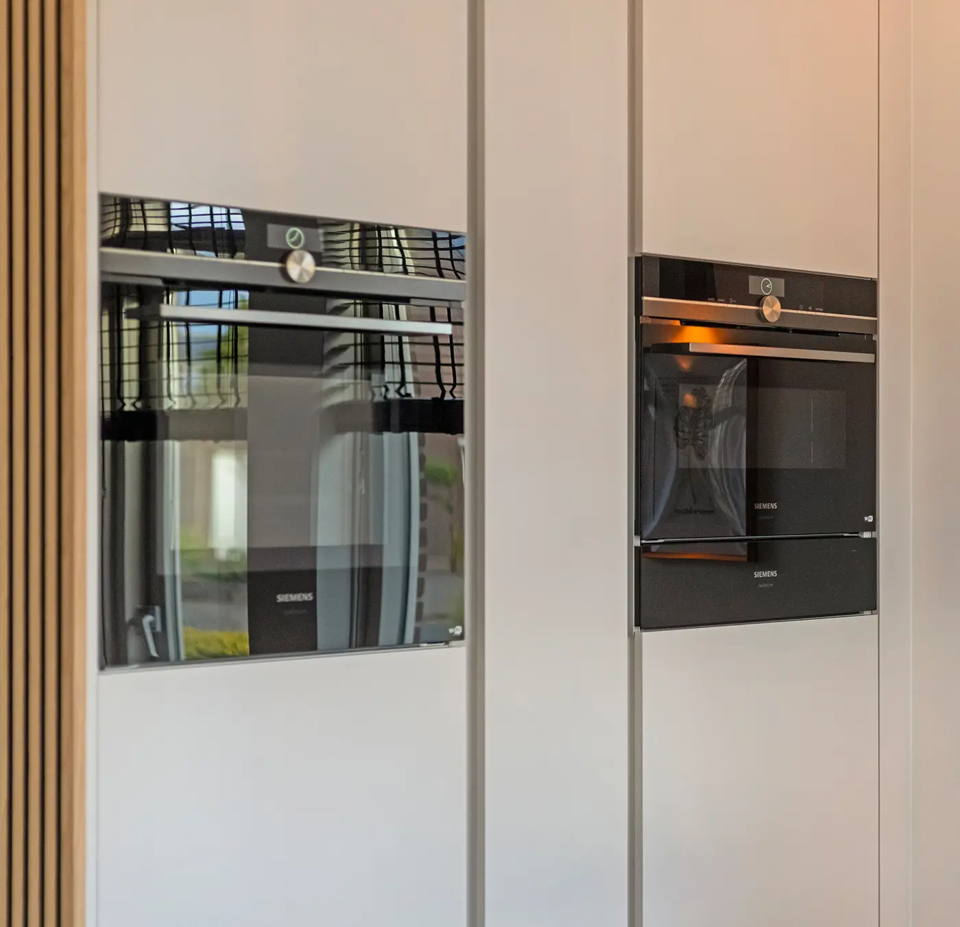 Deze elegante wandkeuken combineert subtiele grijstinten met een opvallend marmerlook werkblad en achterwand. De verticale houtaccenten voegen warmte toe aan het design, terwijl de greeploze fronten zorgen voor een strak en verfijnd uiterlijk. Met de geïntegreerde kookplaat met afzuiging en hoogwaardige apparatuur van Siemens is deze compacte keuken zowel stijlvol als uitzonderlijk praktisch.