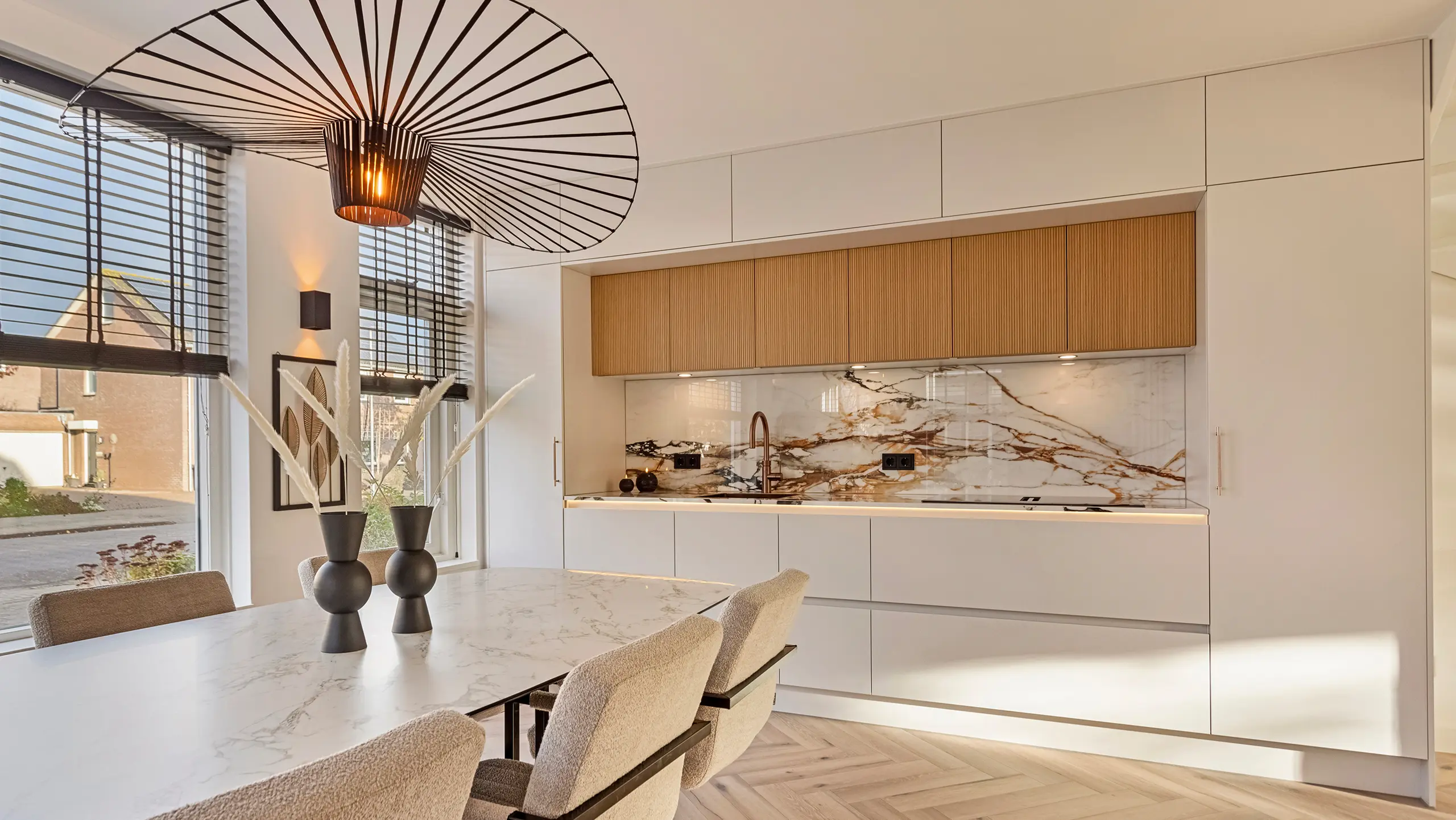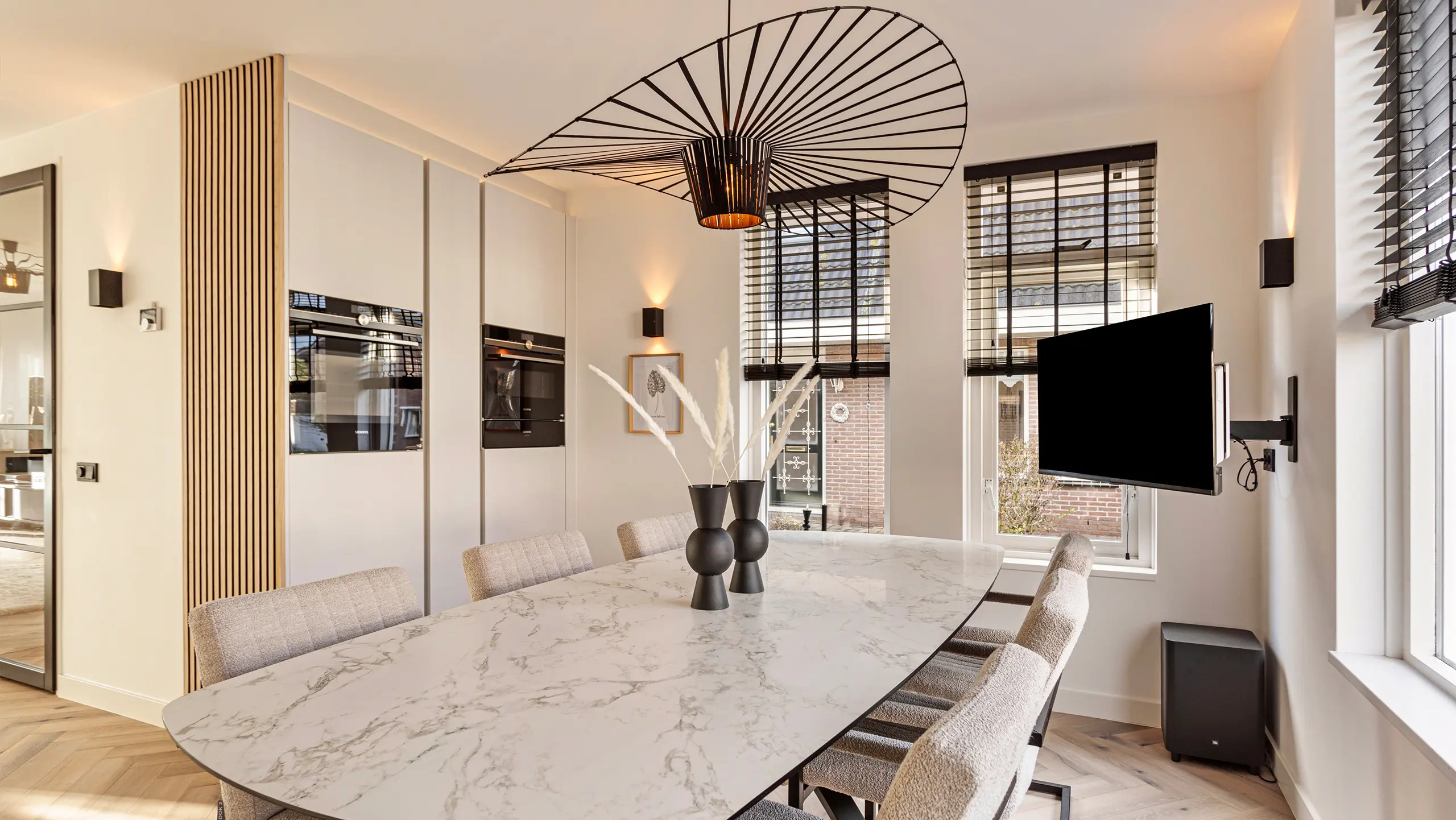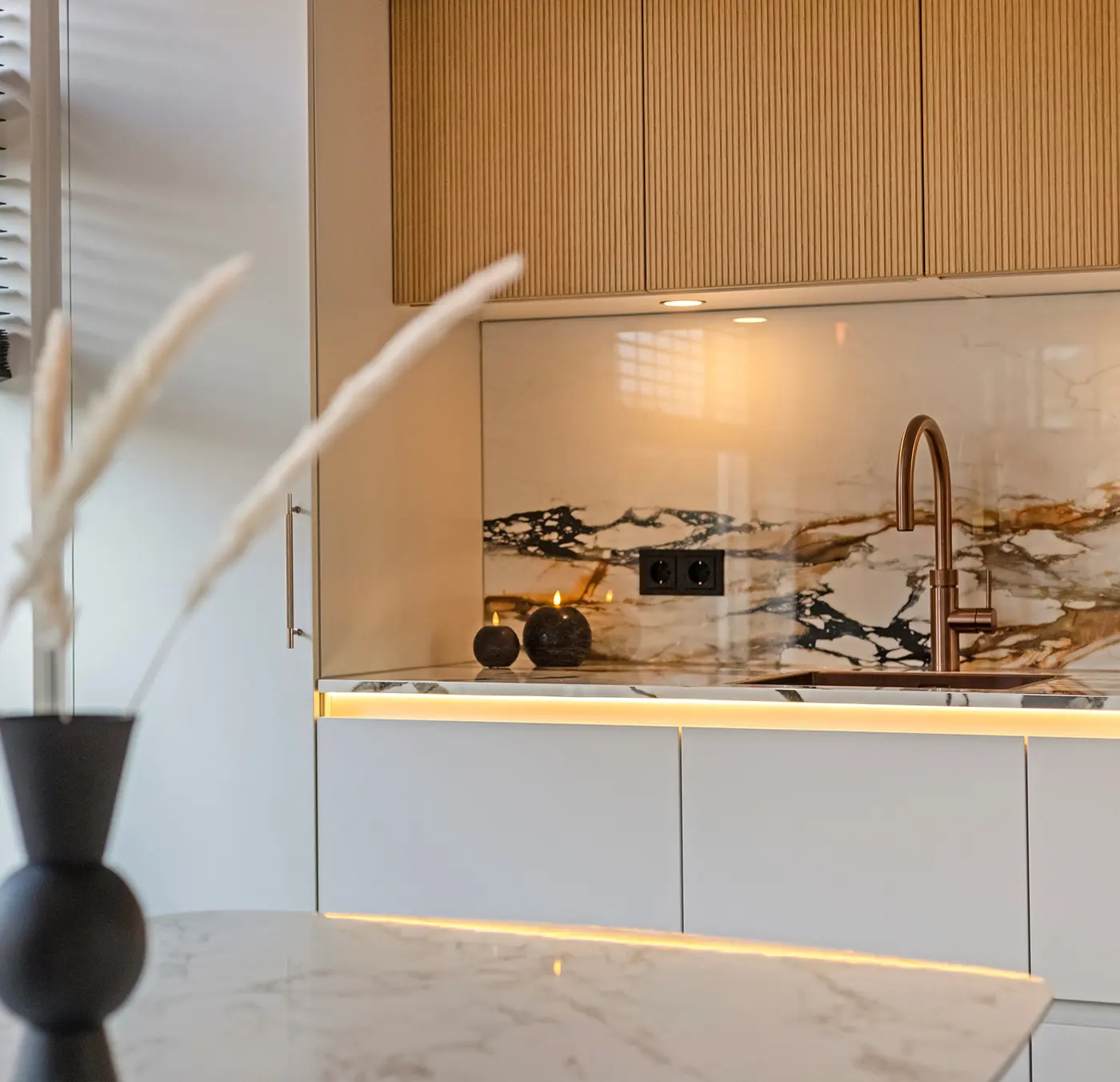 Deze elegante wandkeuken combineert subtiele grijstinten met een opvallend marmerlook werkblad en achterwand. De verticale houtaccenten voegen warmte toe aan het design, terwijl de greeploze fronten zorgen voor een strak en verfijnd uiterlijk. Met de geïntegreerde kookplaat met afzuiging en hoogwaardige apparatuur van Siemens is deze compacte keuken zowel stijlvol als uitzonderlijk praktisch.