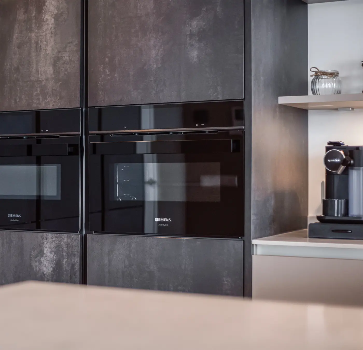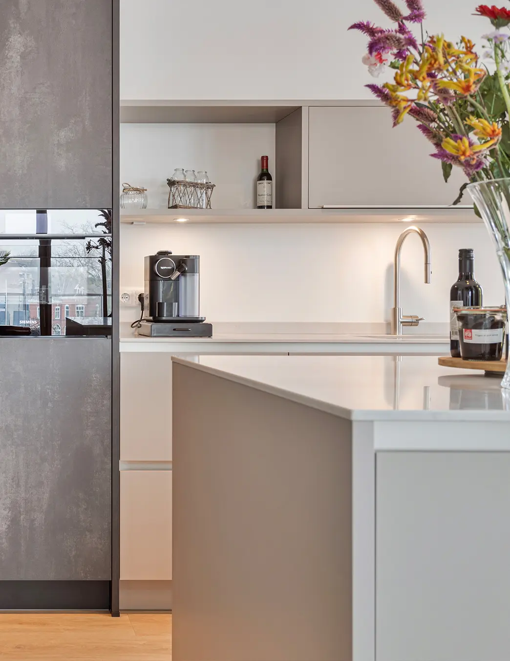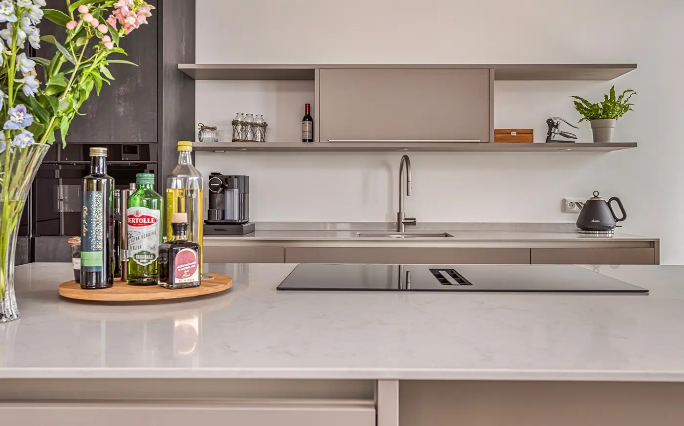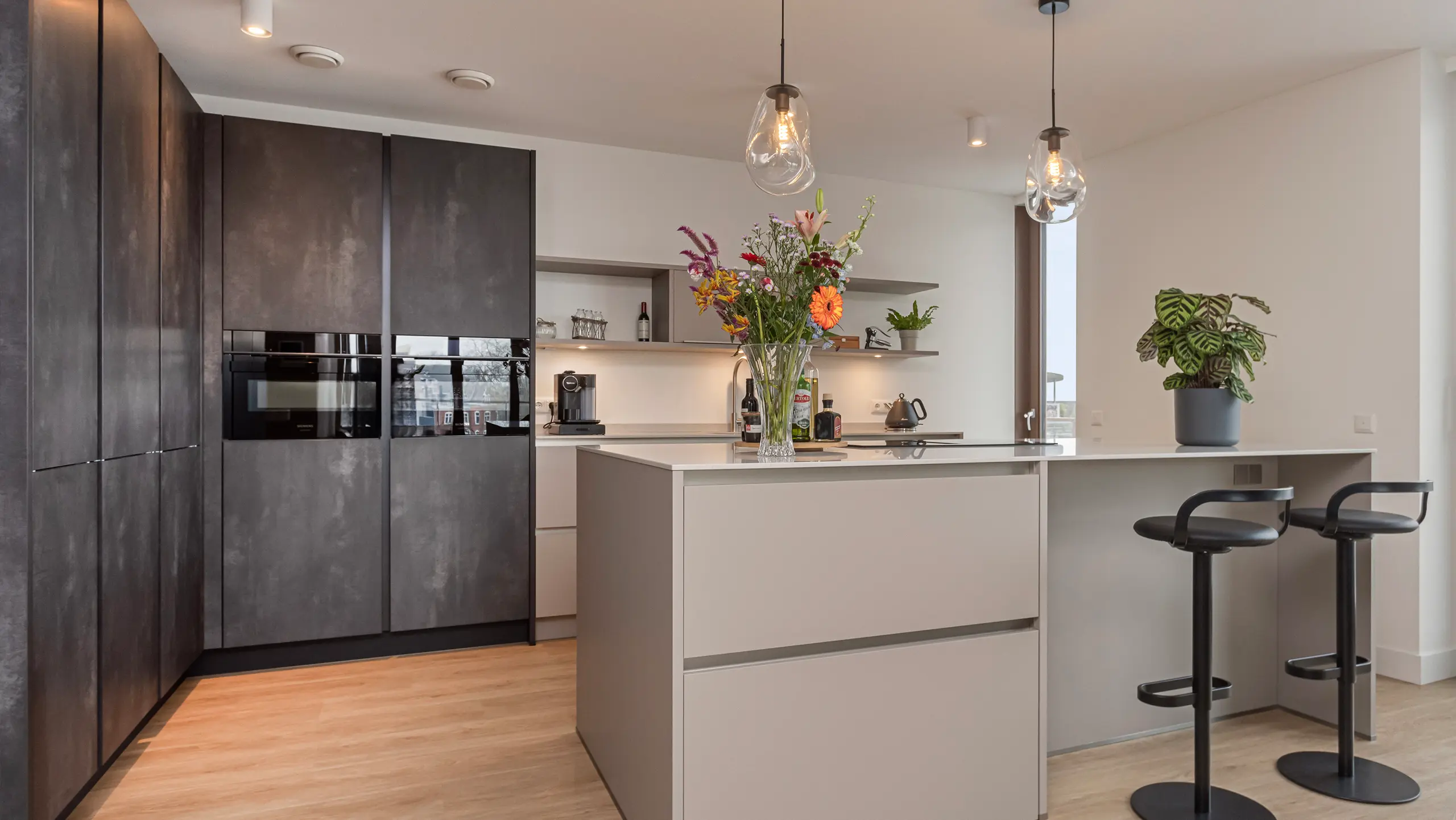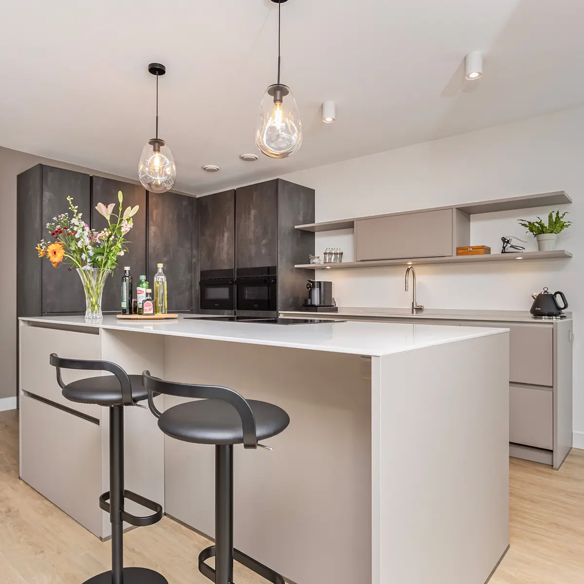 Deze moderne hoekkeuken met kookeiland en bargedeelte combineert strak design met praktische elegantie. De donkere wandkasten vormen een stijlvol contrast met de lichte fronten, terwijl het kookeiland uitnodigt tot samen koken en gezellig natafelen. Siemens apparatuur staat garant voor kwalitatief koken en een vleugje luxe, perfect afgestemd op een eigentijdse woonruimte en Urban lifestyle.