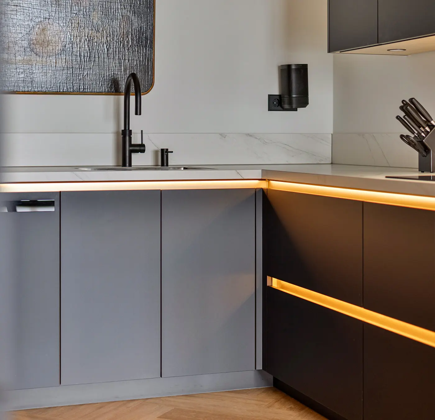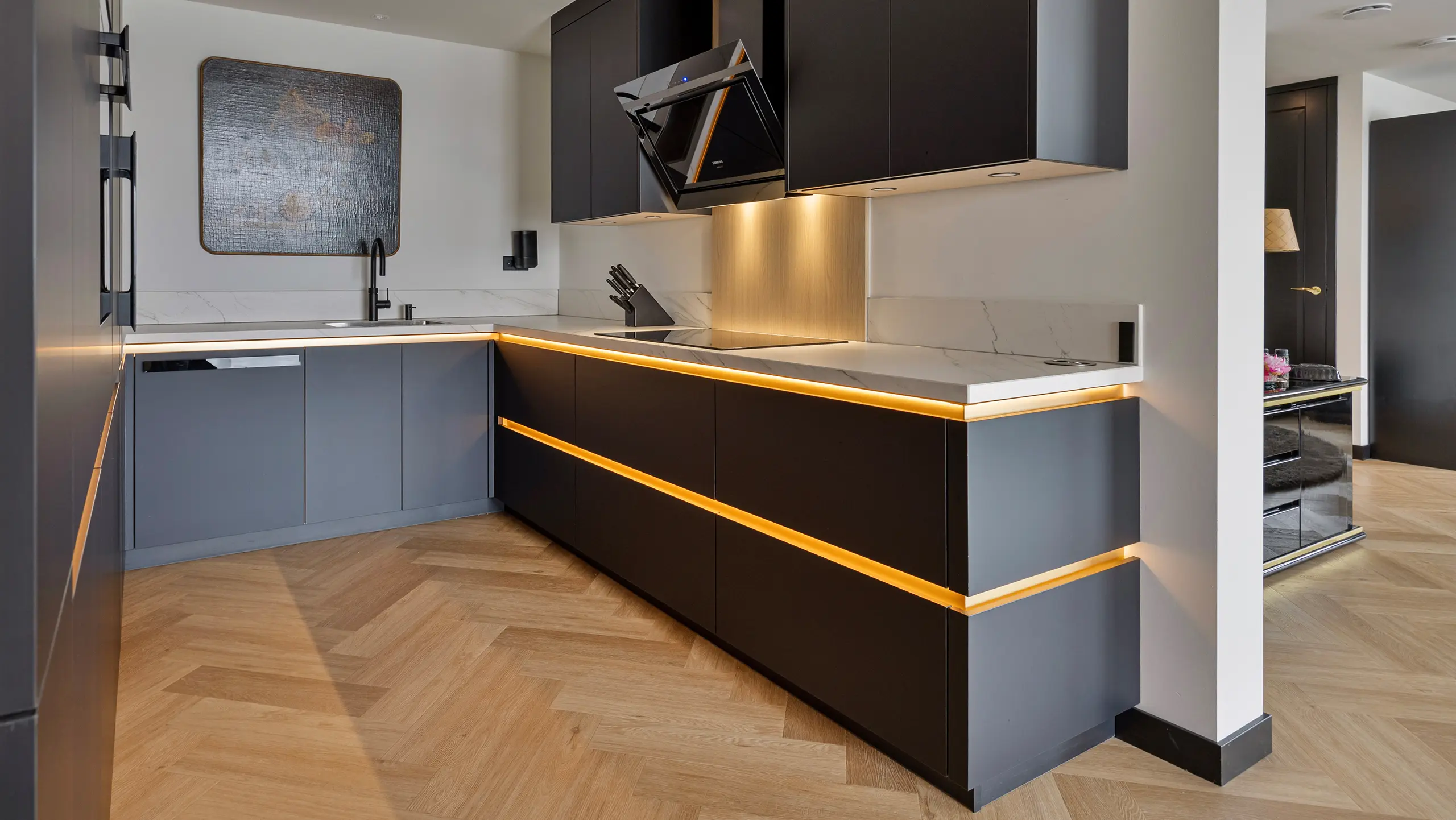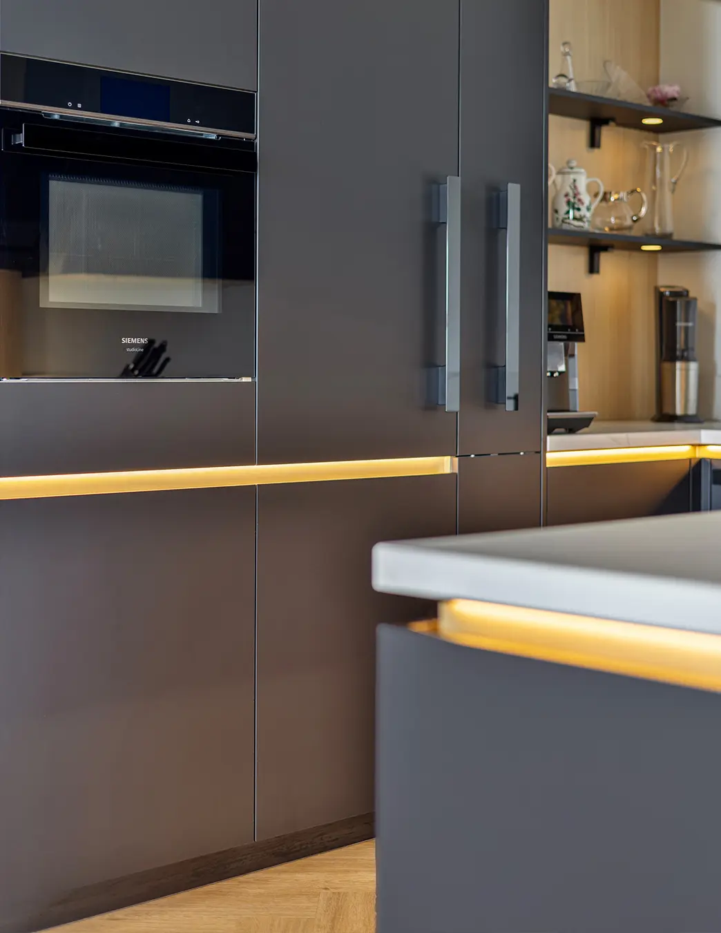 Deze prachtige U-vormige designkeuken combineert donkere fronten met een subtiel marmerlook werkblad en warme LED-accentverlichting. De geïntegreerde verlichting benadrukt de strakke lijnen en geeft de ruimte een stijlvolle, bijna luxueuze sfeer. De Siemens-apparatuur zorgt voor gebruiksgemak en precisie, terwijl de royale kastruimte en doordachte indeling optimaal kookcomfort garanderen.