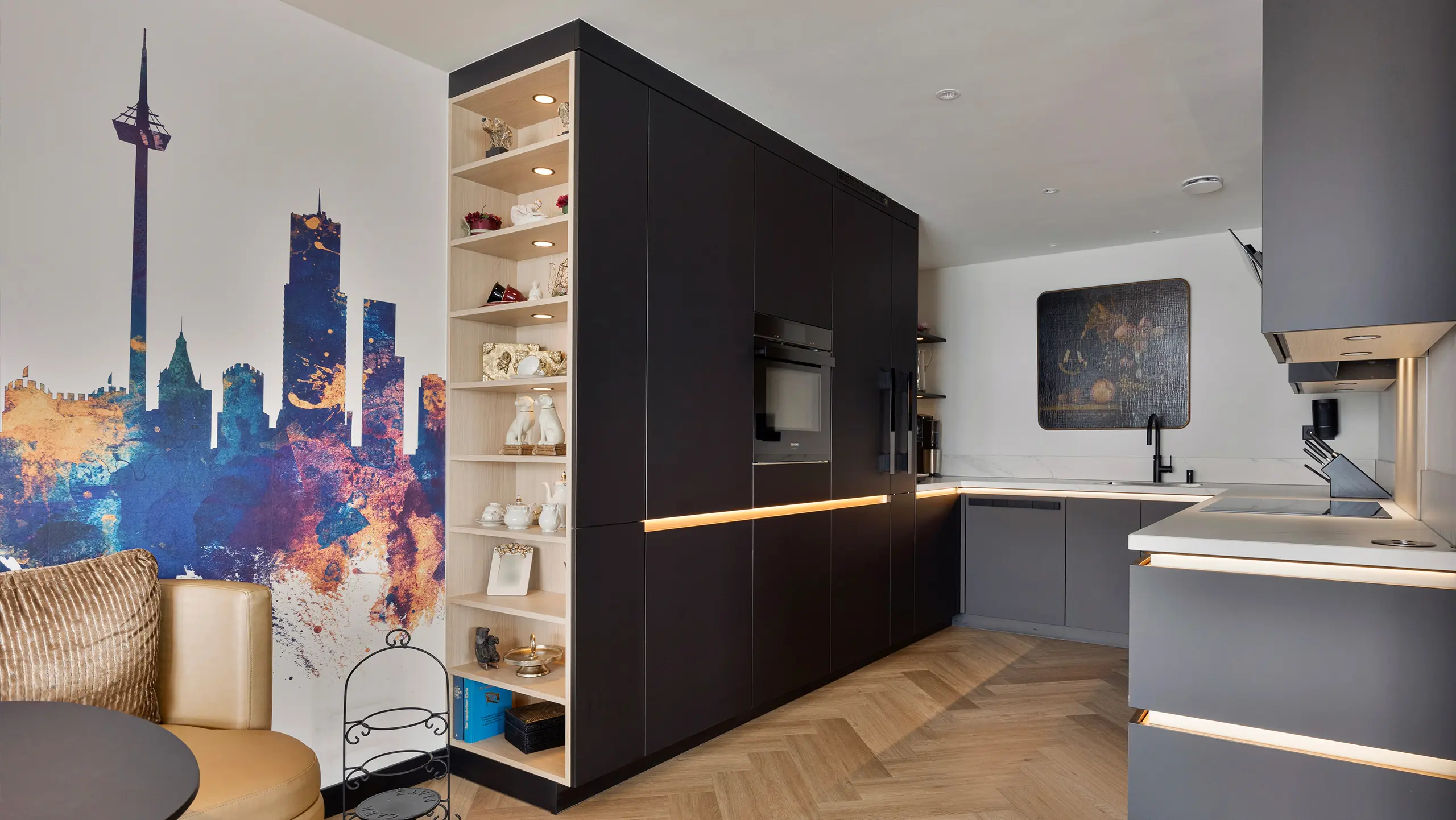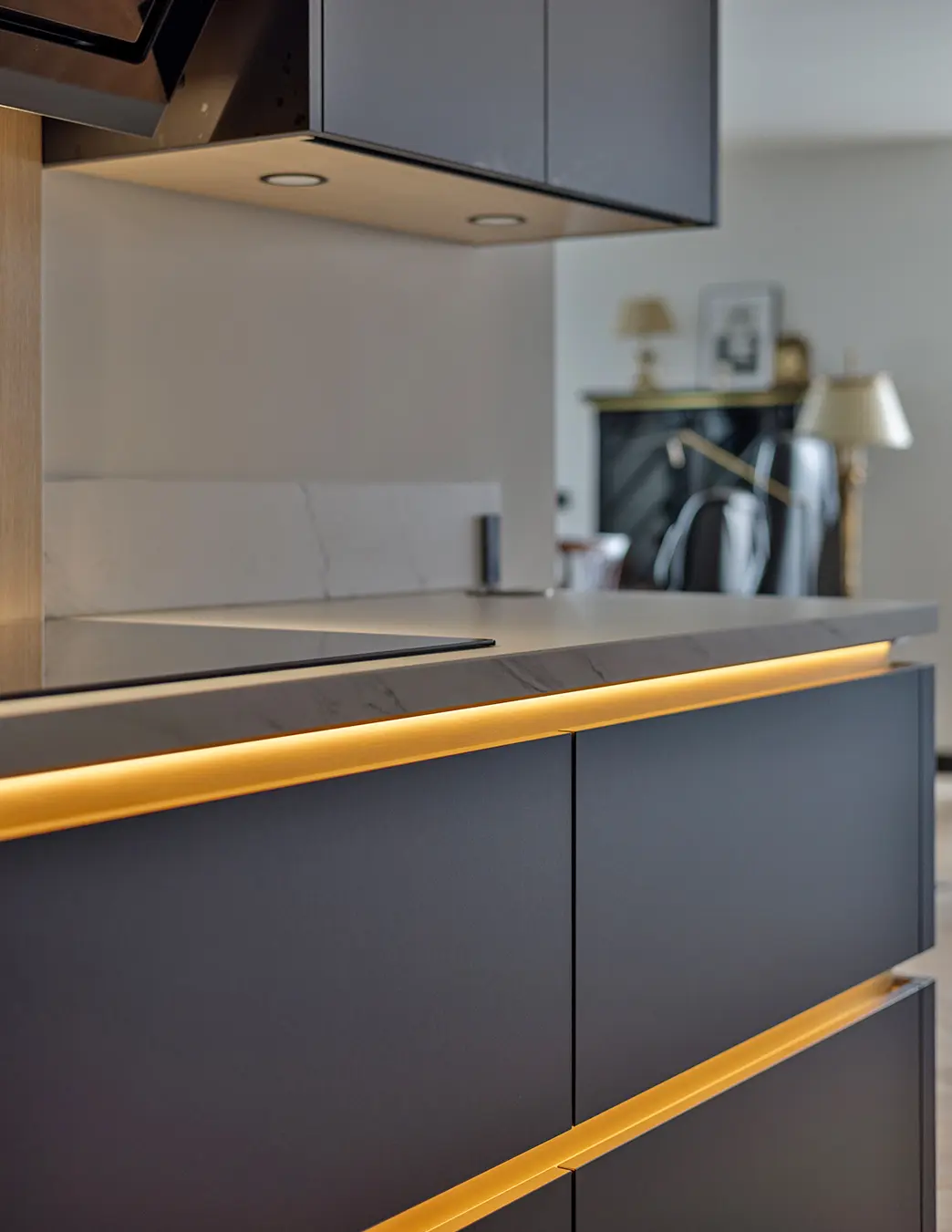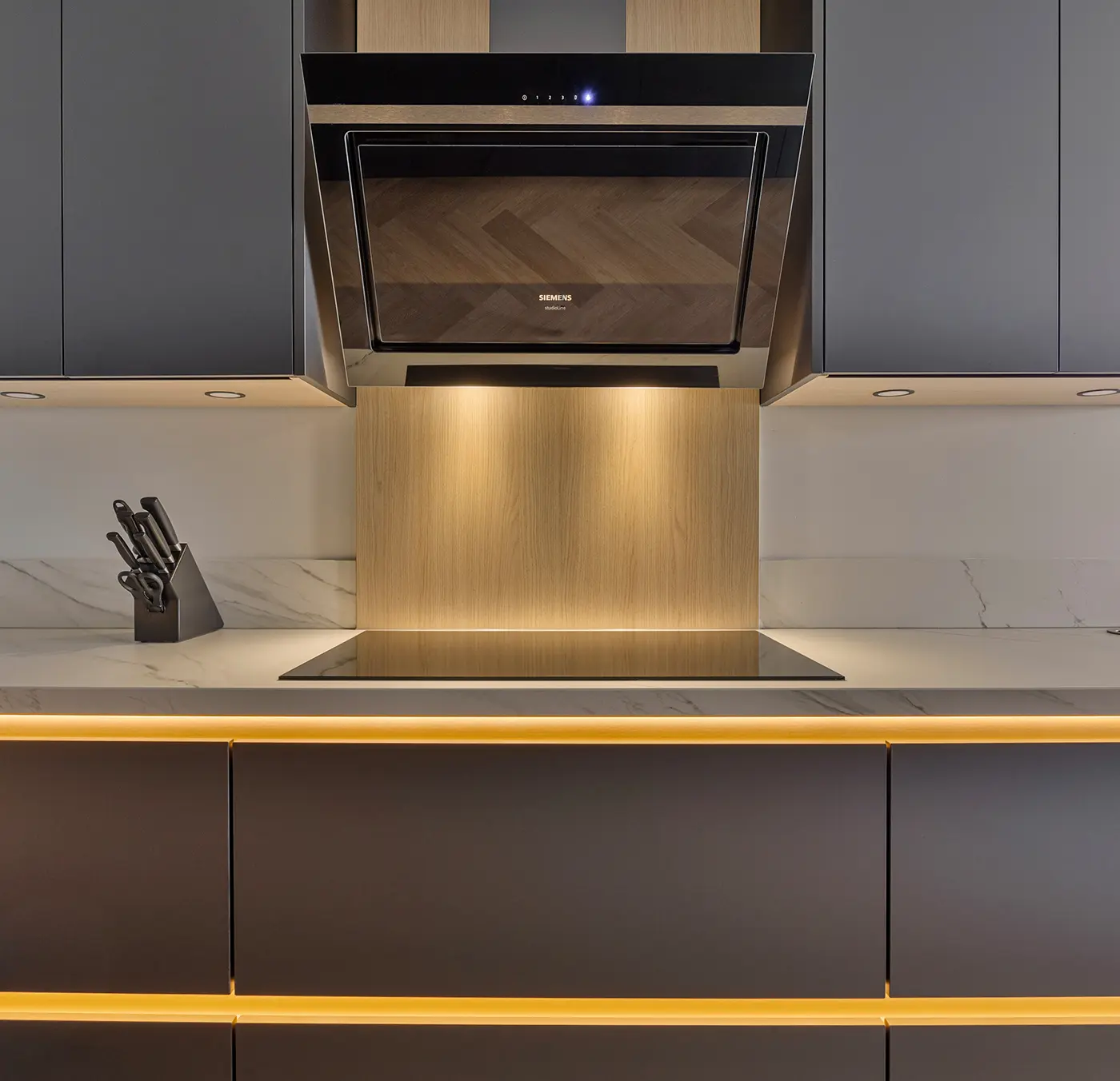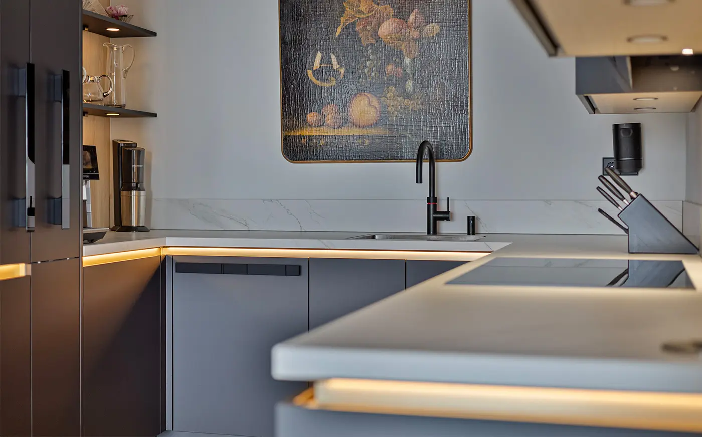 Deze prachtige U-vormige designkeuken combineert donkere fronten met een subtiel marmerlook werkblad en warme LED-accentverlichting. De geïntegreerde verlichting benadrukt de strakke lijnen en geeft de ruimte een stijlvolle, bijna luxueuze sfeer. De Siemens-apparatuur zorgt voor gebruiksgemak en precisie, terwijl de royale kastruimte en doordachte indeling optimaal kookcomfort garanderen.