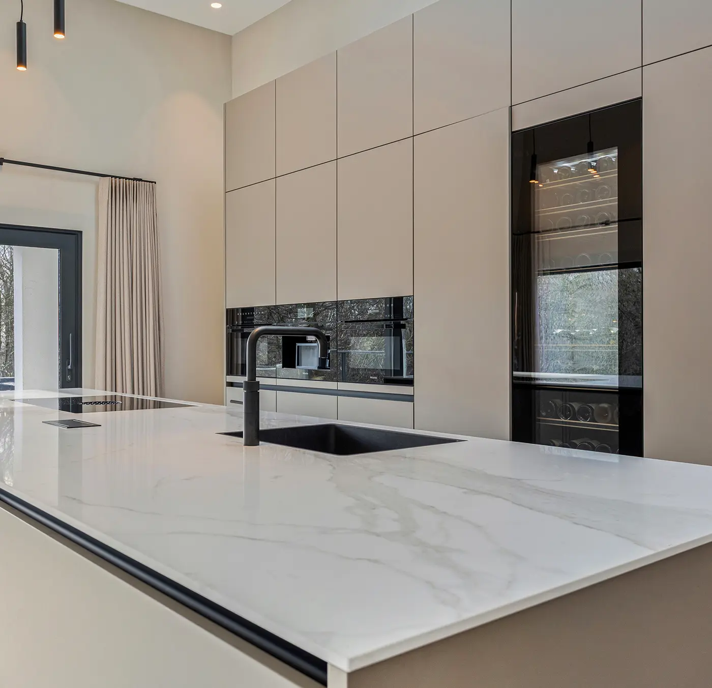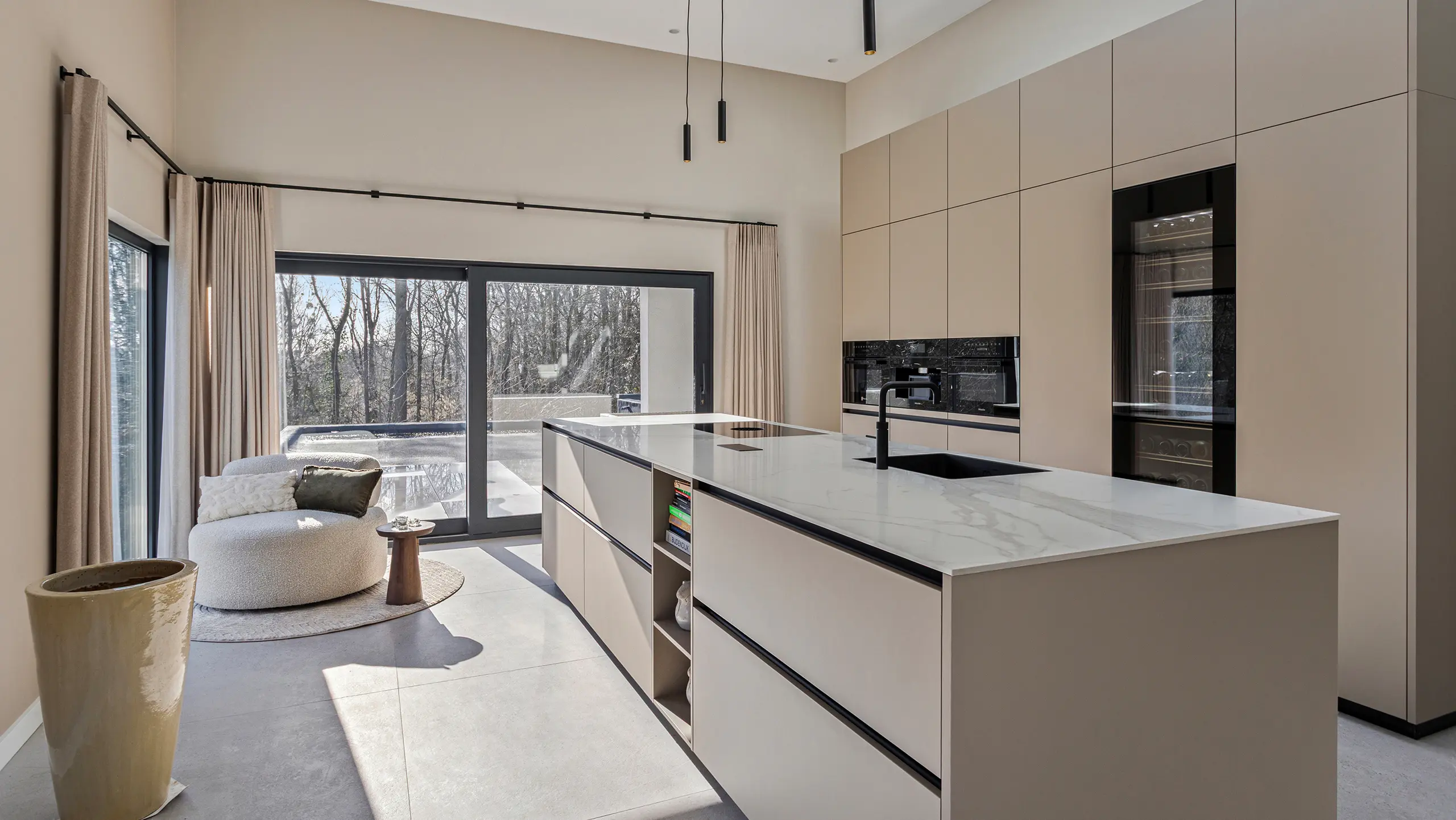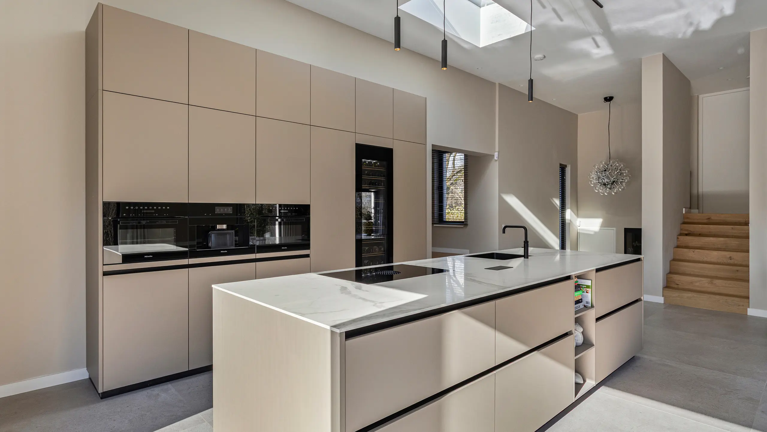 Deze verfijnde taupekleurige keuken straalt rust en klasse uit. Het ruime kookeiland met marmerlook werkblad vormt het stijlvolle middelpunt, terwijl de greeploze kastenwand zorgt voor een strak en harmonieus geheel. Uitgerust met Miele-apparatuur en een ingebouwde wijnklimaatkast combineert de Elegant Taupe topkwaliteit met moderne luxe en ultiem gebruiksgemak.
