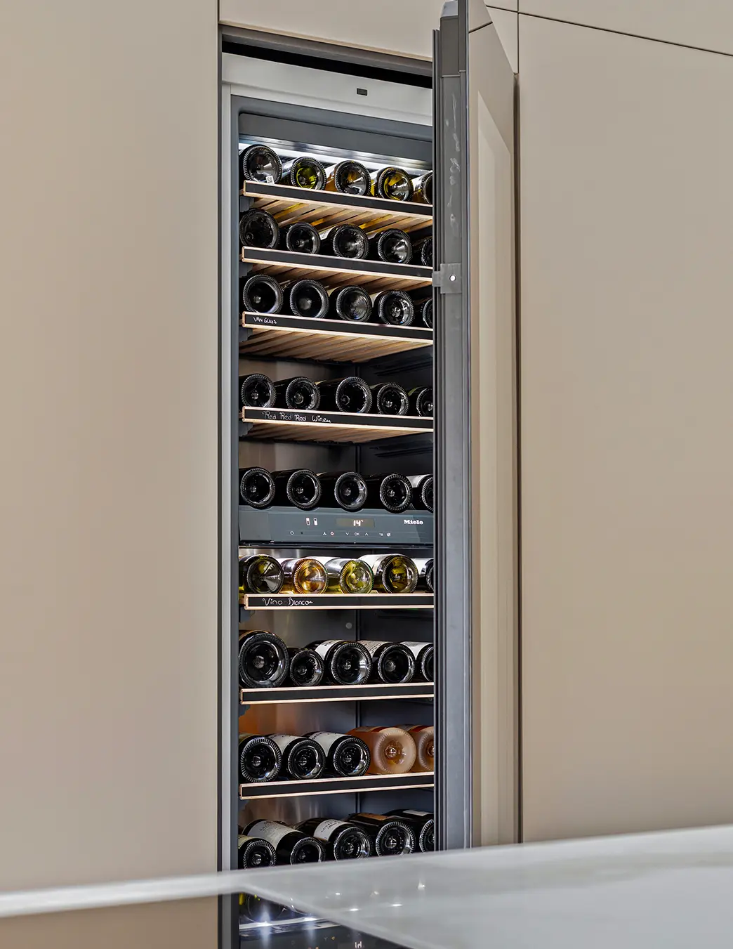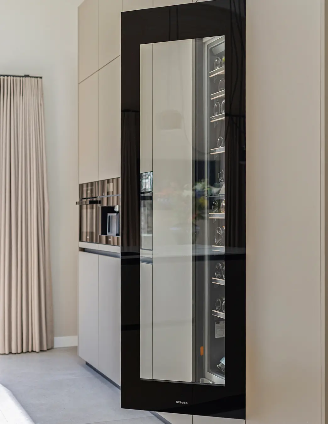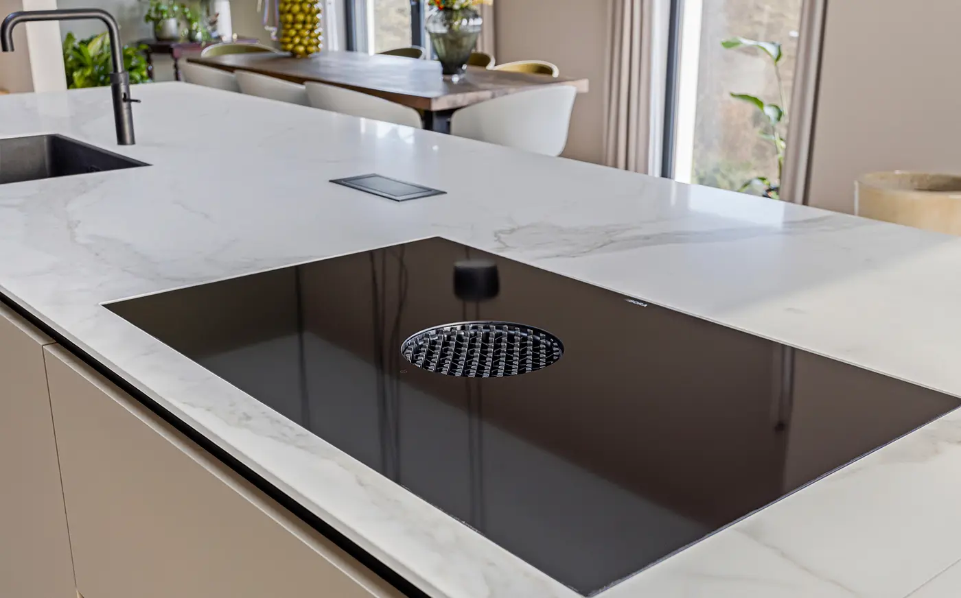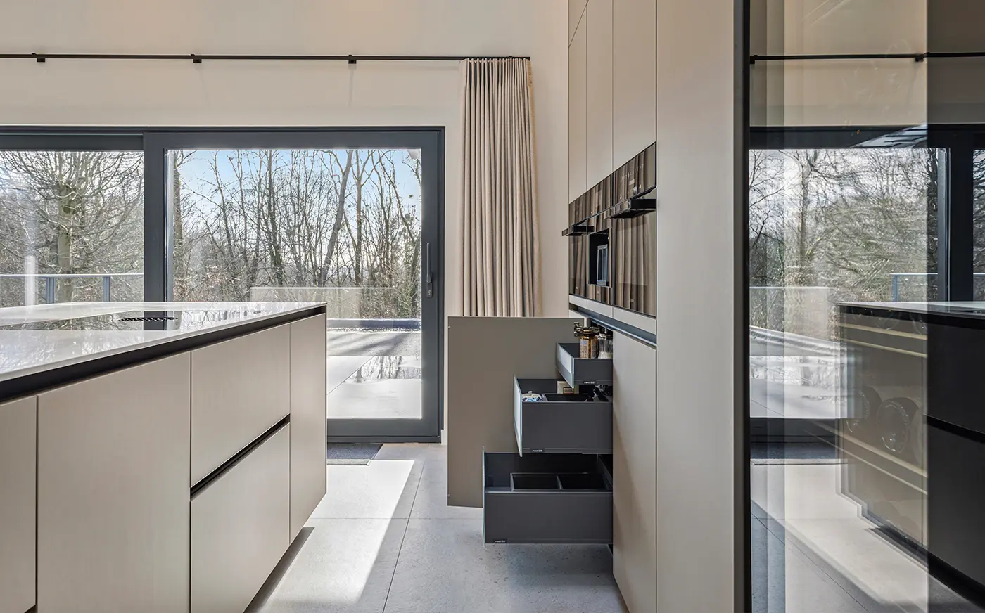 Deze verfijnde taupekleurige keuken straalt rust en klasse uit. Het ruime kookeiland met marmerlook werkblad vormt het stijlvolle middelpunt, terwijl de greeploze kastenwand zorgt voor een strak en harmonieus geheel. Uitgerust met Miele-apparatuur en een ingebouwde wijnklimaatkast combineert de Elegant Taupe topkwaliteit met moderne luxe en ultiem gebruiksgemak.