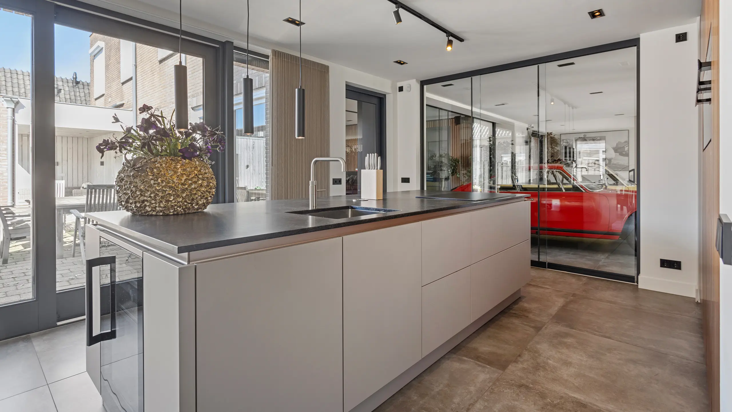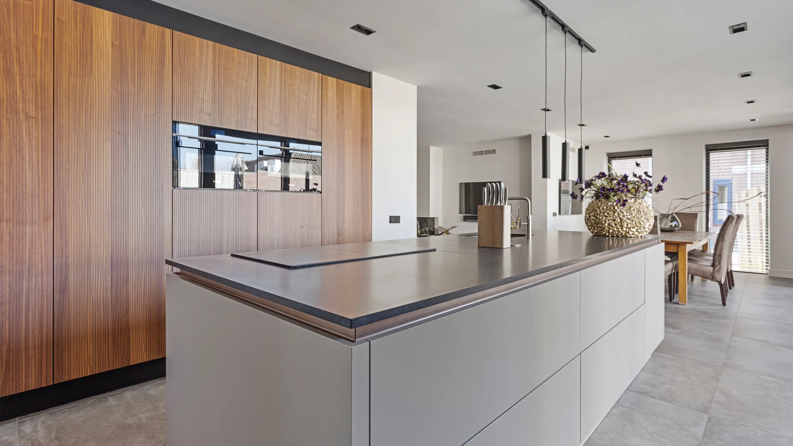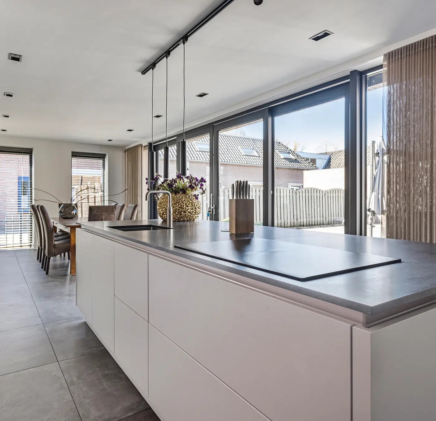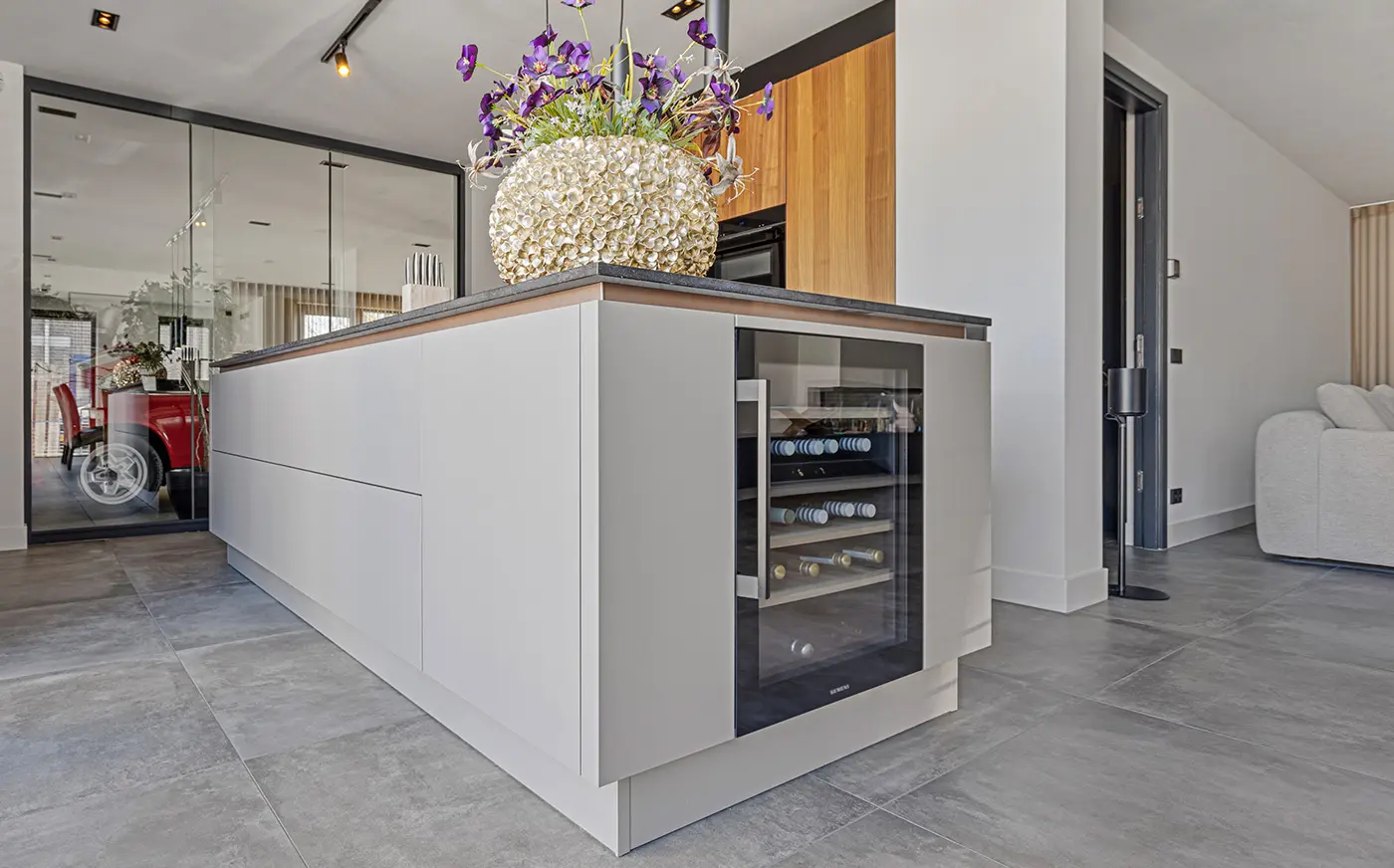 De Pure Essence is een stijlvolle moderne keuken met een strak licht kookeiland en een donker composiet werkblad dat elegant contrasteert met de ruimte. Grote raampartijen laten het daglicht overvloedig binnen, waardoor de keuken open en ruimtelijk aanvoelt. Uitgerust met Siemens-apparatuur en een wijnklimaatkast biedt deze keuken het perfecte evenwicht tussen design, comfort en Duitse kwaliteit.