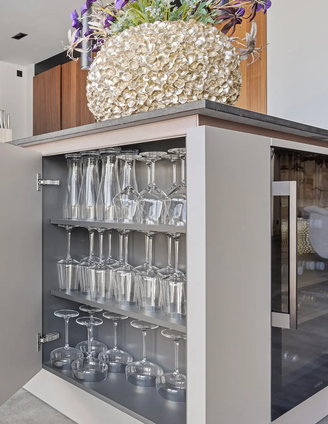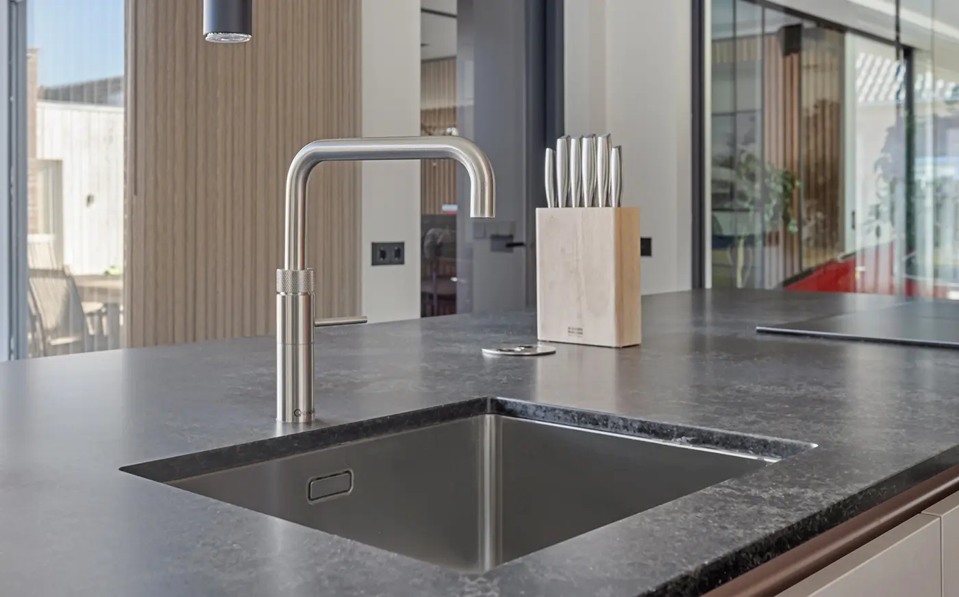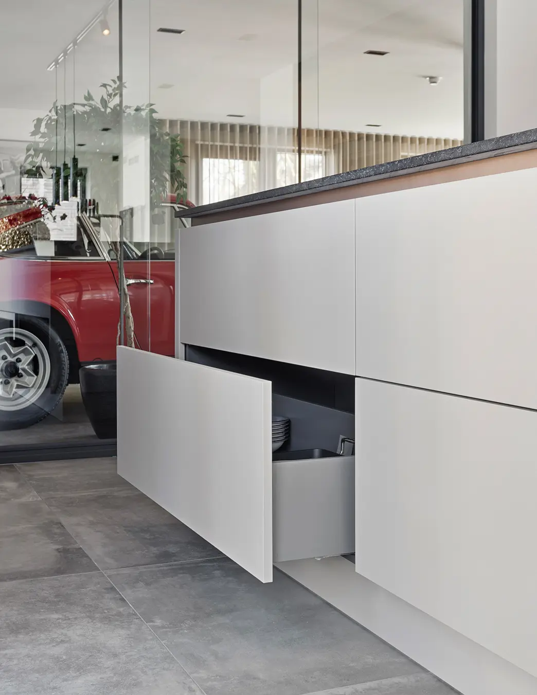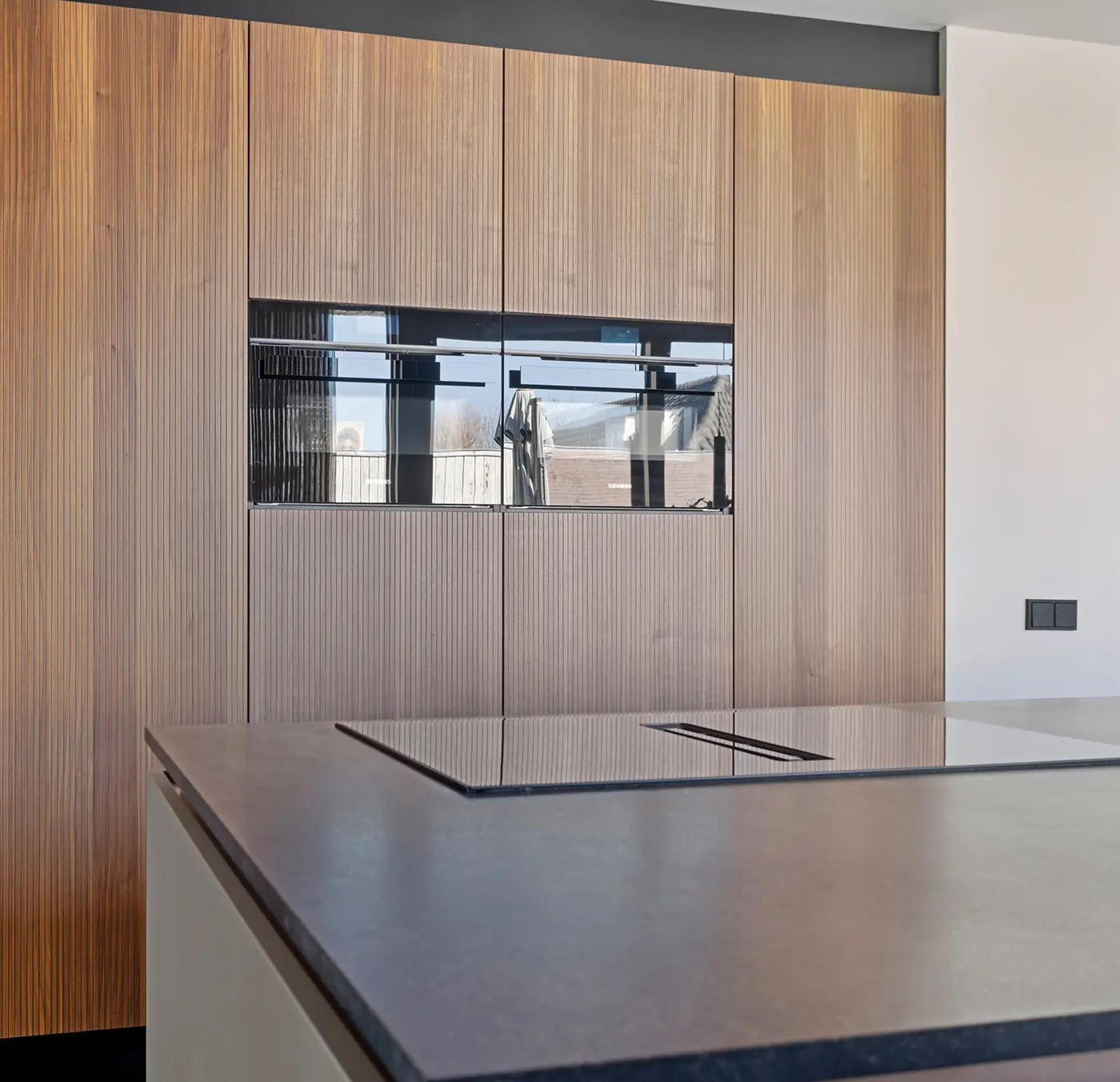 De Pure Essence is een stijlvolle moderne keuken met een strak licht kookeiland en een donker composiet werkblad dat elegant contrasteert met de ruimte. Grote raampartijen laten het daglicht overvloedig binnen, waardoor de keuken open en ruimtelijk aanvoelt. Uitgerust met Siemens-apparatuur en een wijnklimaatkast biedt deze keuken het perfecte evenwicht tussen design, comfort en Duitse kwaliteit.