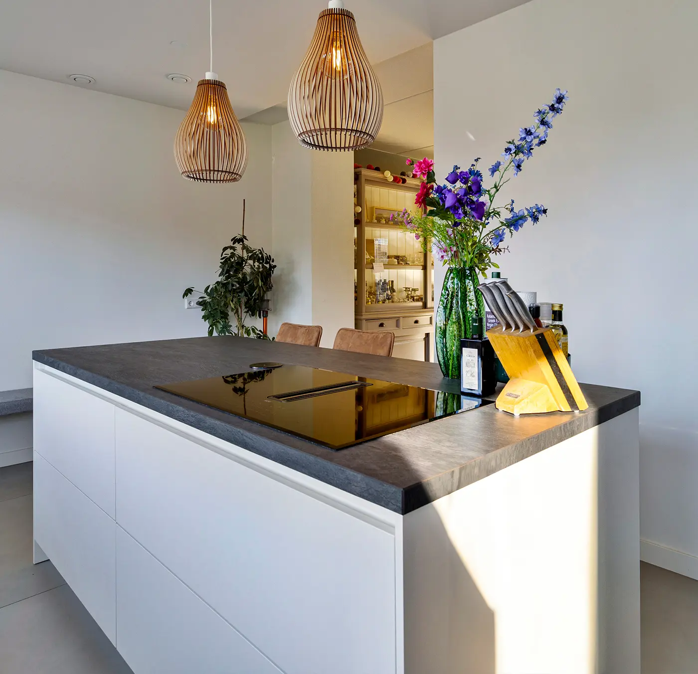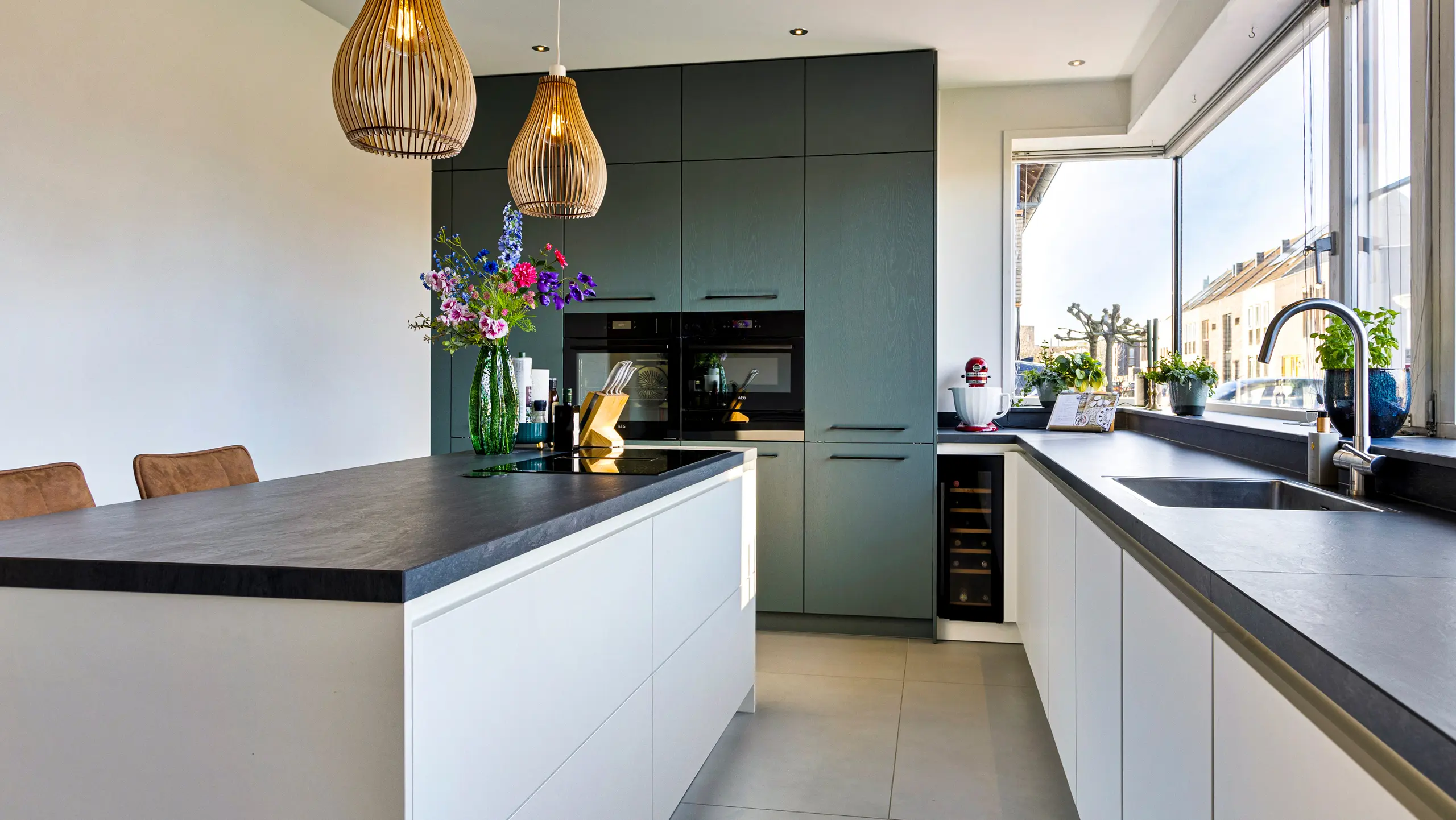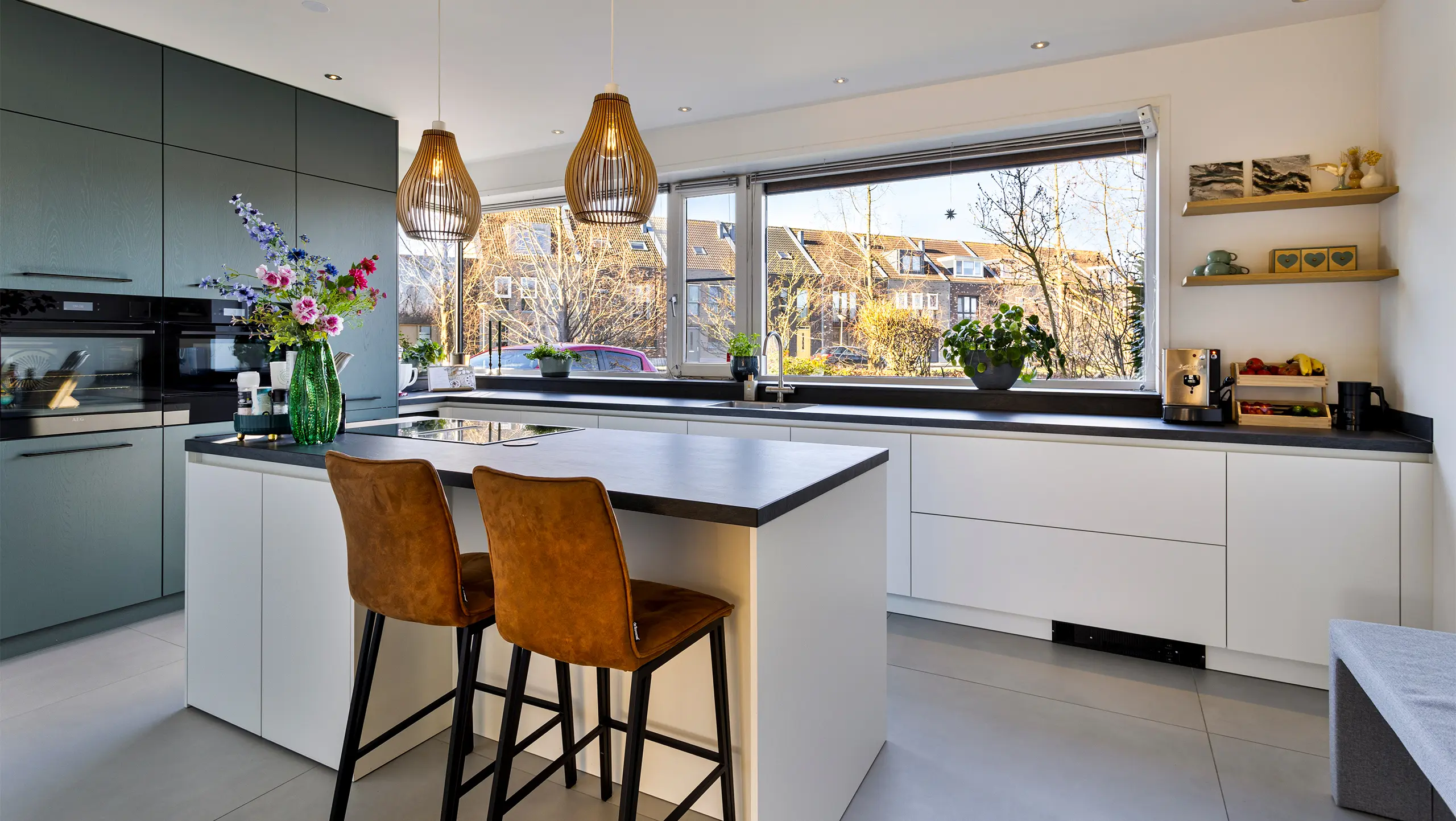Deze prachtige moderne hoekkeuken met een centraal kookeiland is uitgevoerd met greeploze fronten en een rustig kleurenpalet van wit en zachtgroen. Het donkere werkblad en de leren barkrukken geven warmte en karakter, terwijl de grote raampartij de ruimte vult met licht. Met AEG-apparatuur en een heetwaterkraan combineert deze keuken stijl met dagelijks gemak