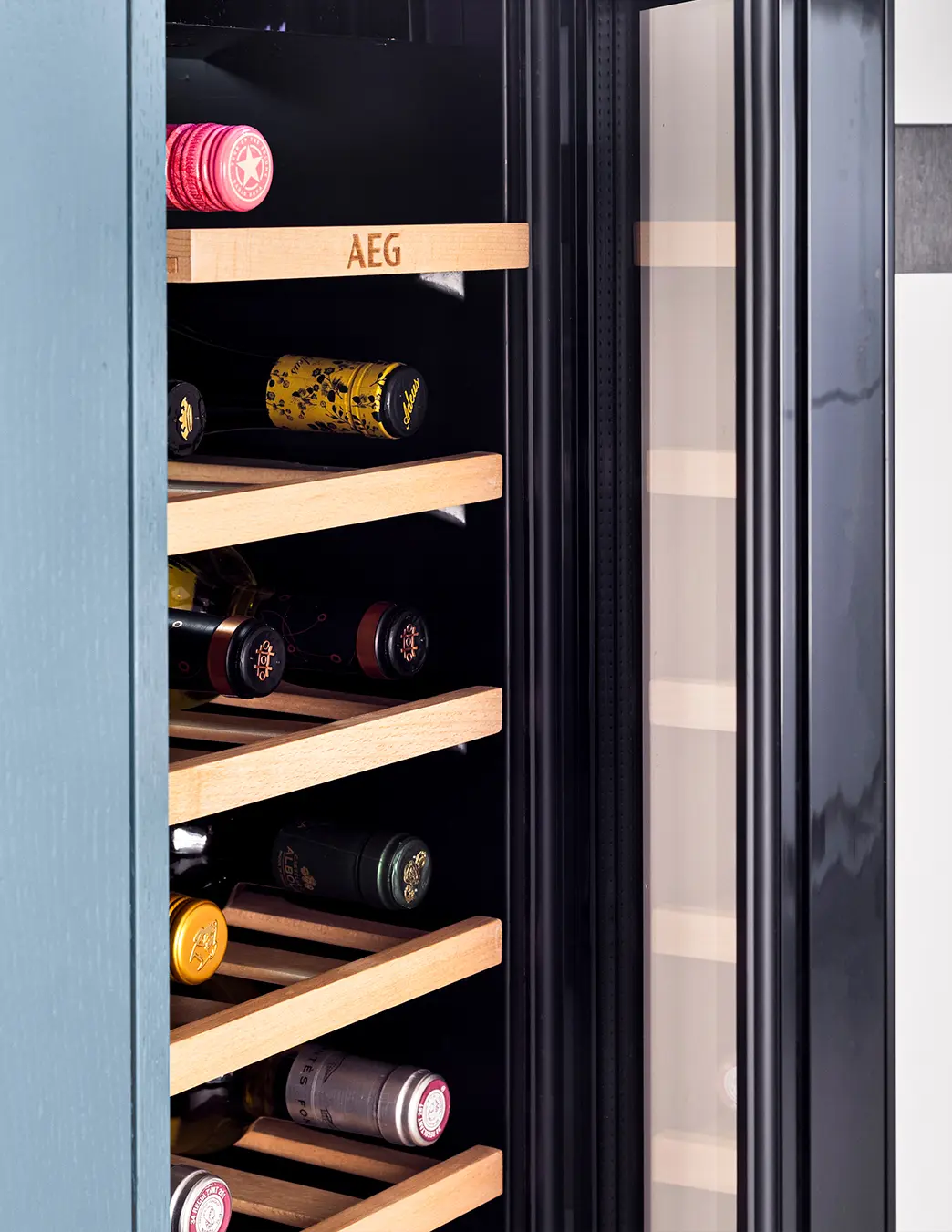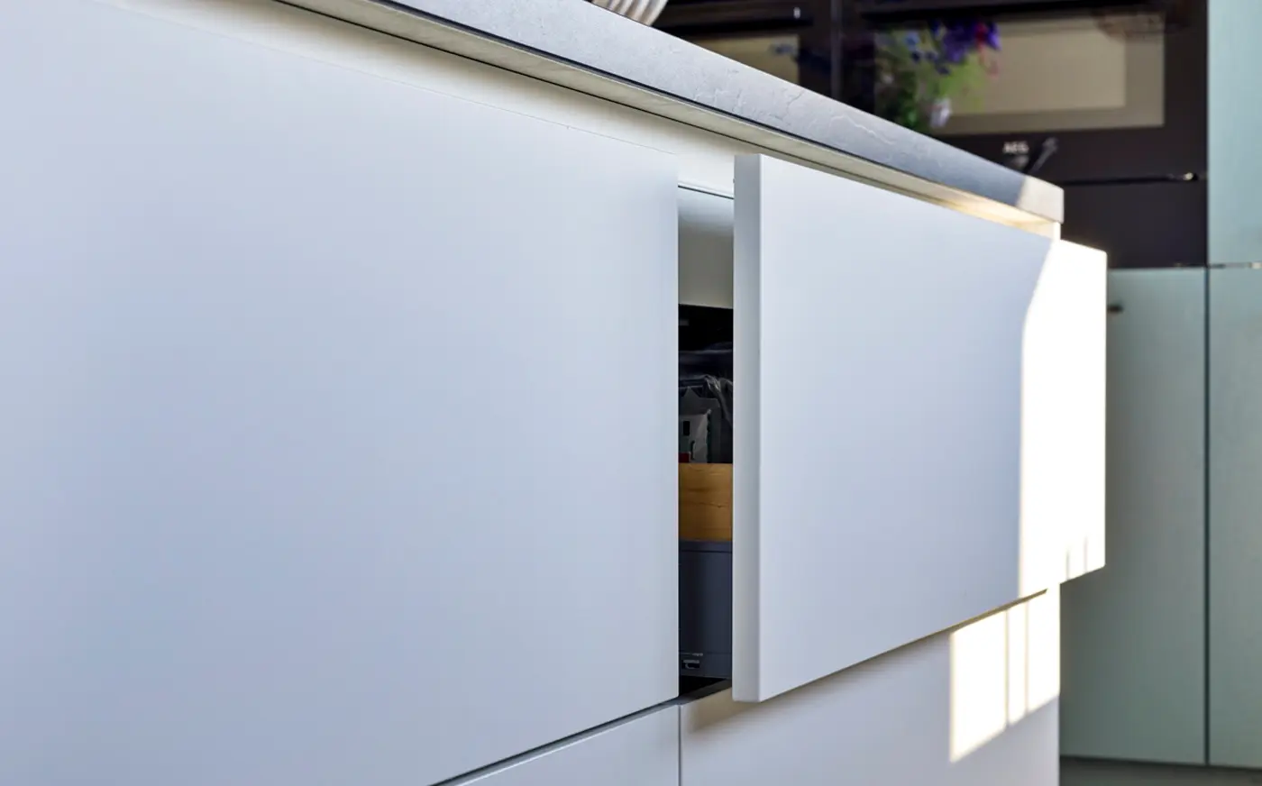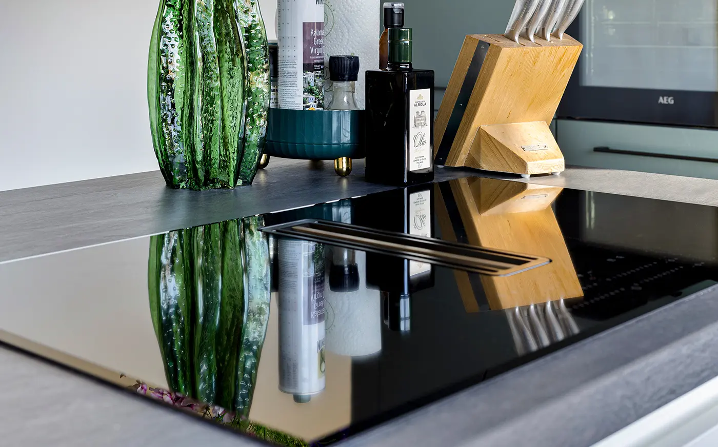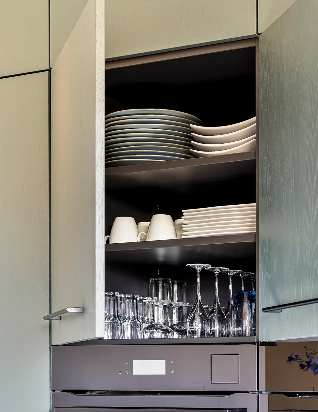 Deze prachtige moderne hoekkeuken met een centraal kookeiland is uitgevoerd met greeploze fronten en een rustig kleurenpalet van wit en zachtgroen. Het donkere werkblad en de leren barkrukken geven warmte en karakter, terwijl de grote raampartij de ruimte vult met licht. Met AEG-apparatuur en een heetwaterkraan combineert deze keuken stijl met dagelijks gemak