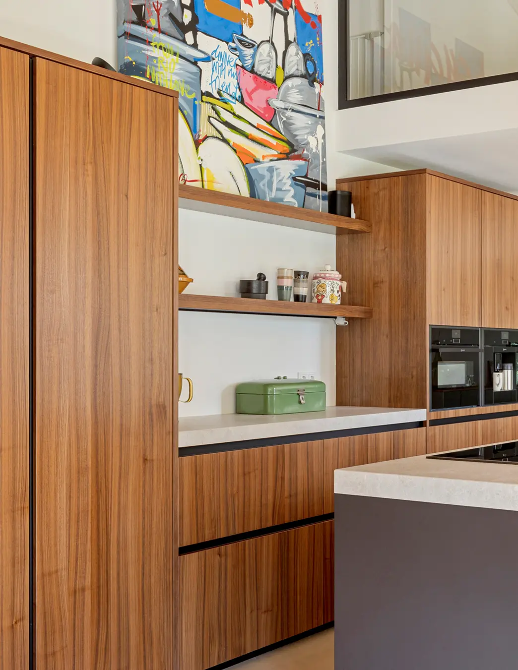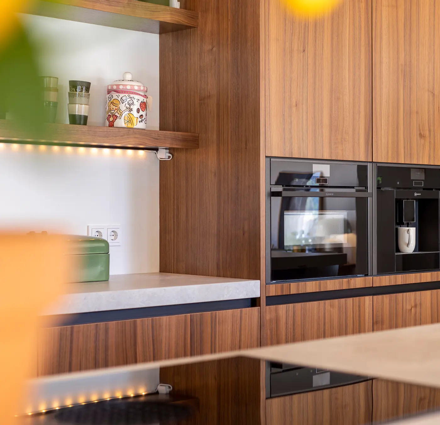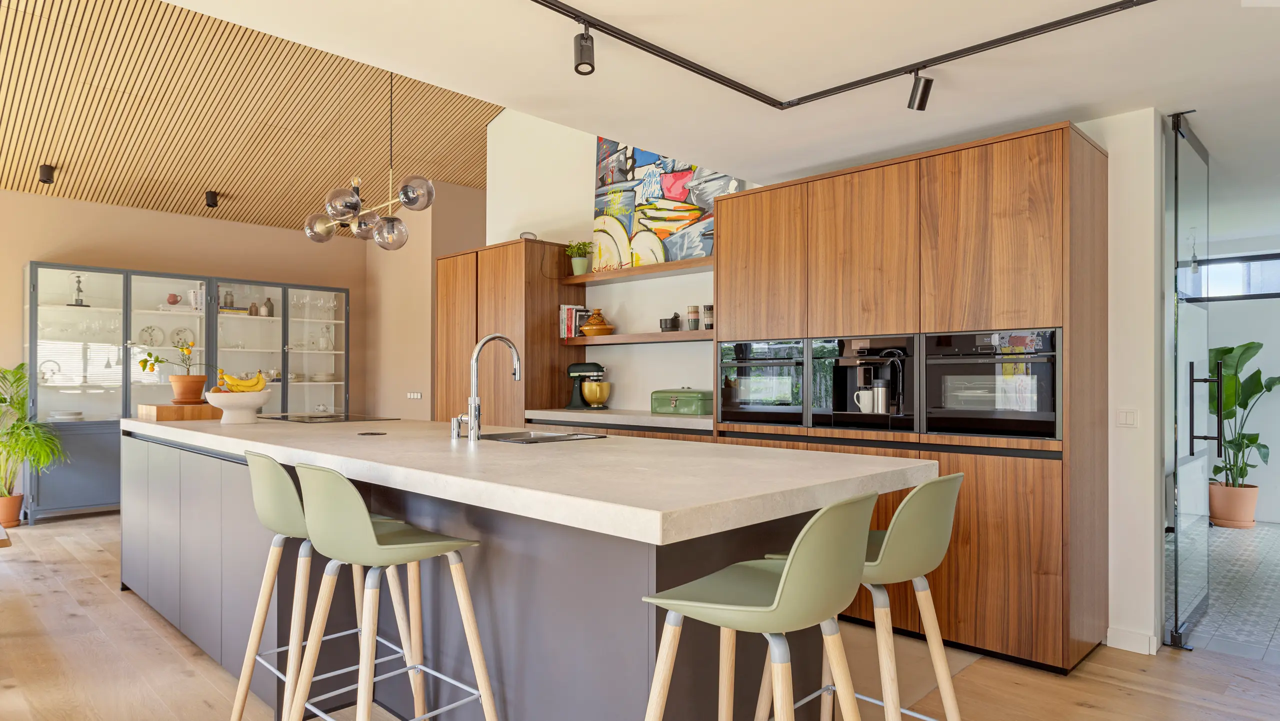 Deze eigentijdse eilandkeuken combineert rijke notenhouten fronten in de hoge kasten met een strak donkergrijs eiland en een robuust licht werkblad. De natuurlijke houtnerf brengt warmte in het moderne interieur, terwijl het grote eiland uitnodigt tot koken en samenzijn. Subtiele verlichting, elegante details en moderne apparatuur zorgen voor een perfecte balans tussen design en kookgemak.