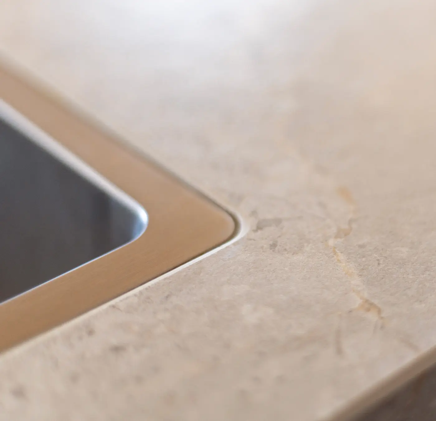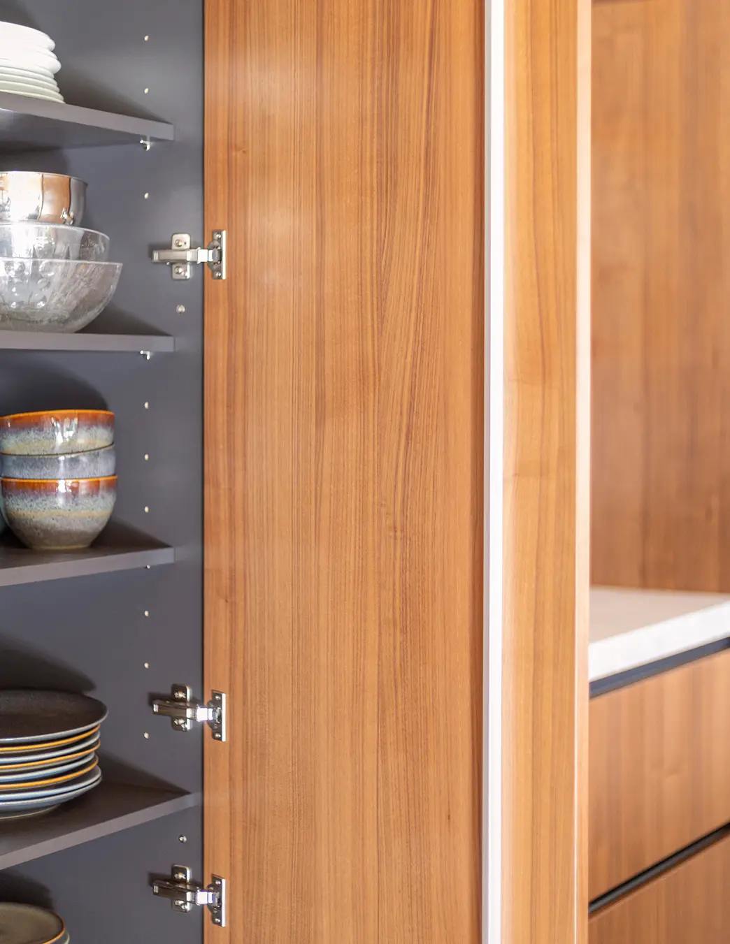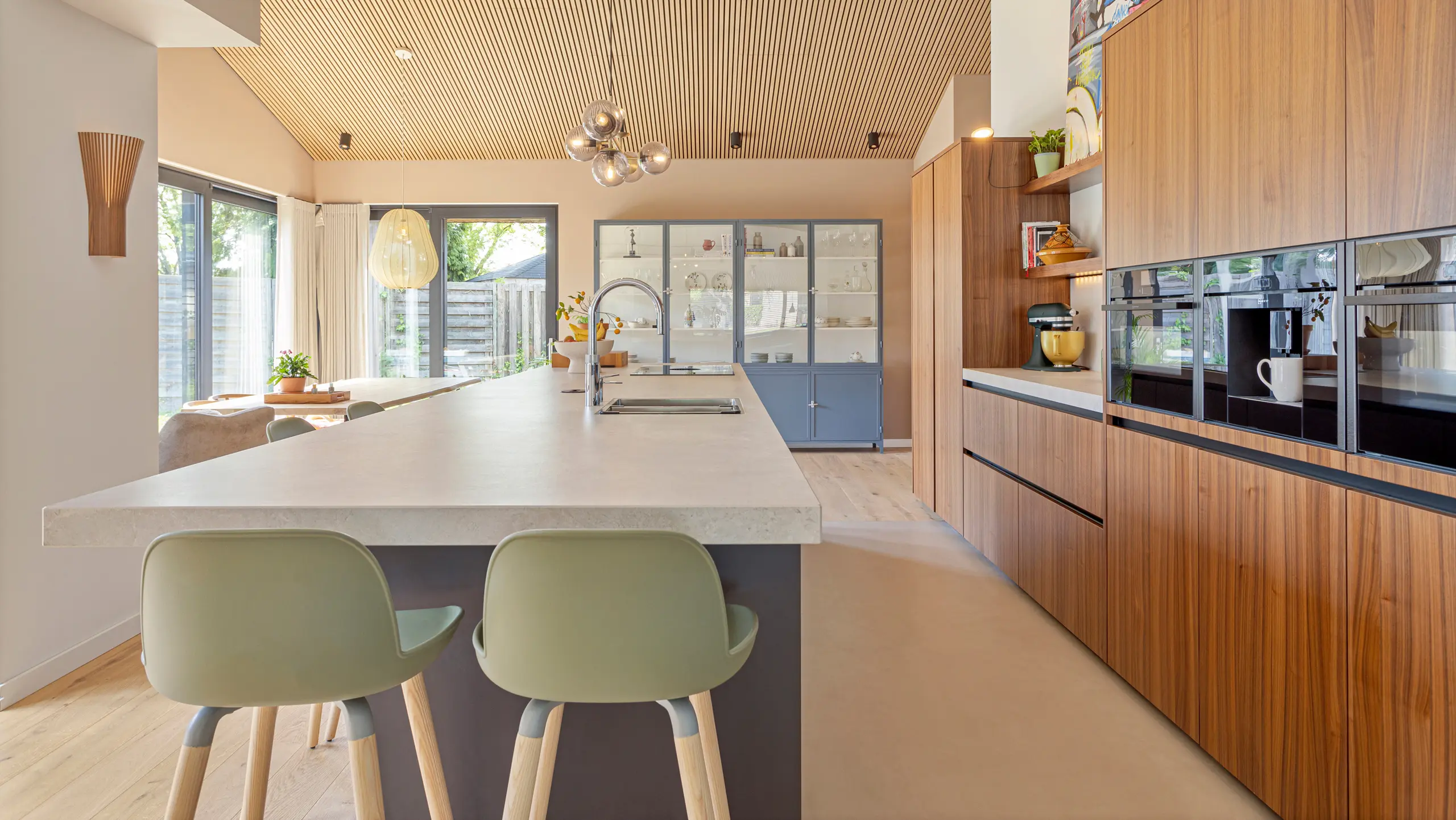 Deze eigentijdse eilandkeuken combineert rijke notenhouten fronten in de hoge kasten met een strak donkergrijs eiland en een robuust licht werkblad. De natuurlijke houtnerf brengt warmte in het moderne interieur, terwijl het grote eiland uitnodigt tot koken en samenzijn. Subtiele verlichting, elegante details en moderne apparatuur zorgen voor een perfecte balans tussen design en kookgemak.