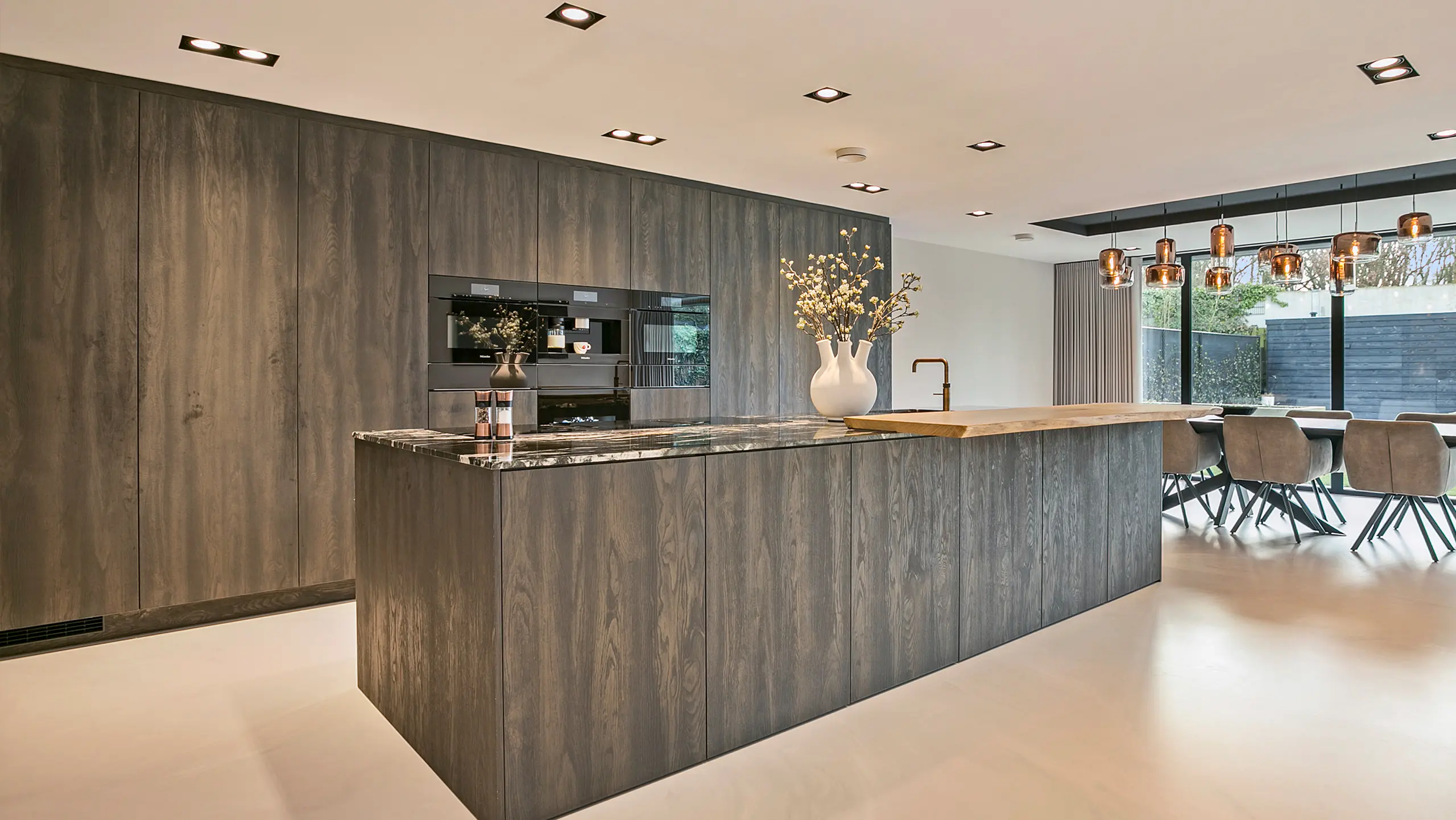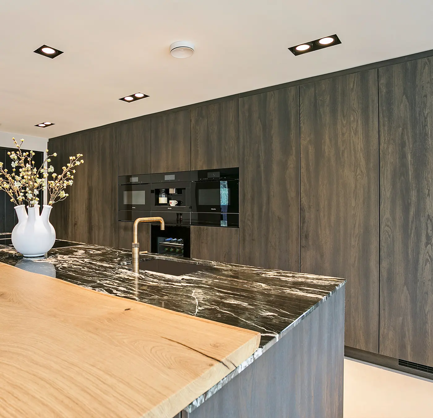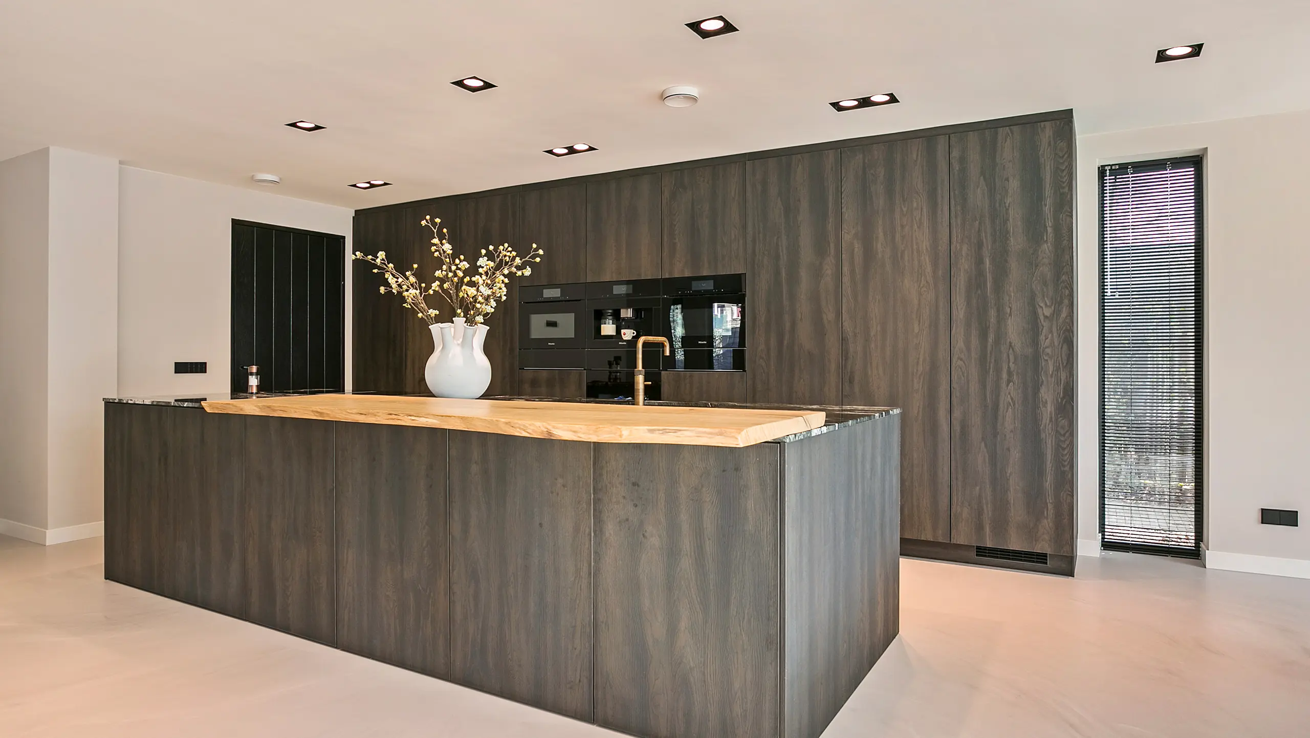 Deze stijlvolle woonkeuken uitgevoerd in twee houttinten ademt moderne elegantie. De hoge kasten tot aan het plafond zorgen voor een strakke, opgeruimde uitstraling en bieden volop opbergruimte. Het robuuste marmeren werkblad en het natuurhouten barblad voegen warmte en luxe toe aan het geheel. Een perfecte combinatie van design, functionaliteit en verfijning, gemaakt om in te leven én van te genieten.