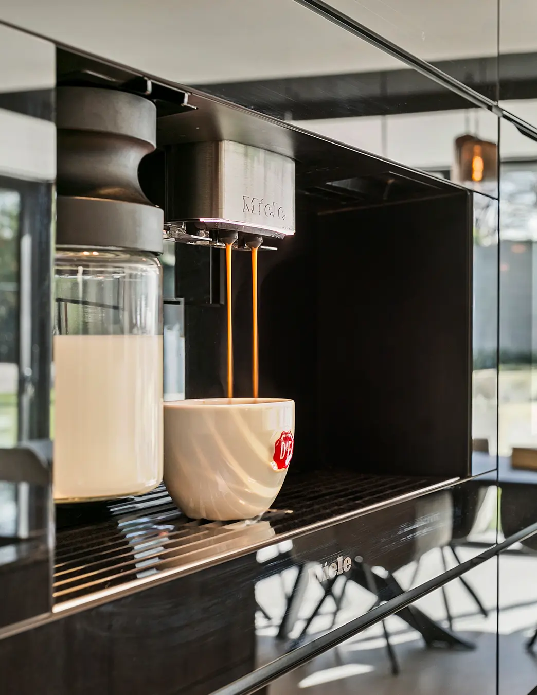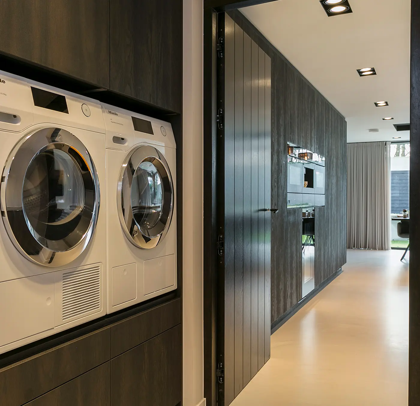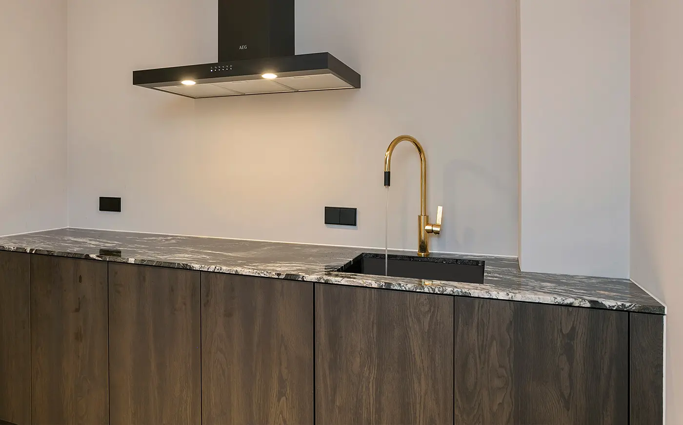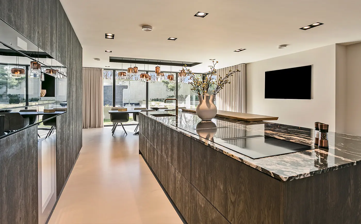 Deze stijlvolle woonkeuken uitgevoerd in twee houttinten ademt moderne elegantie. De hoge kasten tot aan het plafond zorgen voor een strakke, opgeruimde uitstraling en bieden volop opbergruimte. Het robuuste marmeren werkblad en het natuurhouten barblad voegen warmte en luxe toe aan het geheel. Een perfecte combinatie van design, functionaliteit en verfijning, gemaakt om in te leven én van te genieten.
