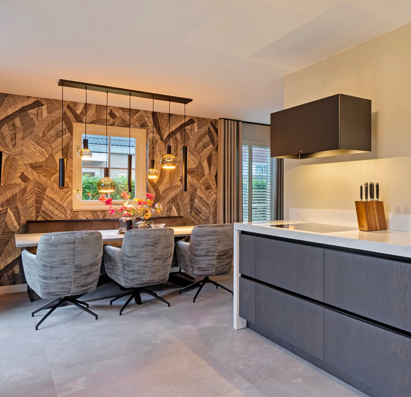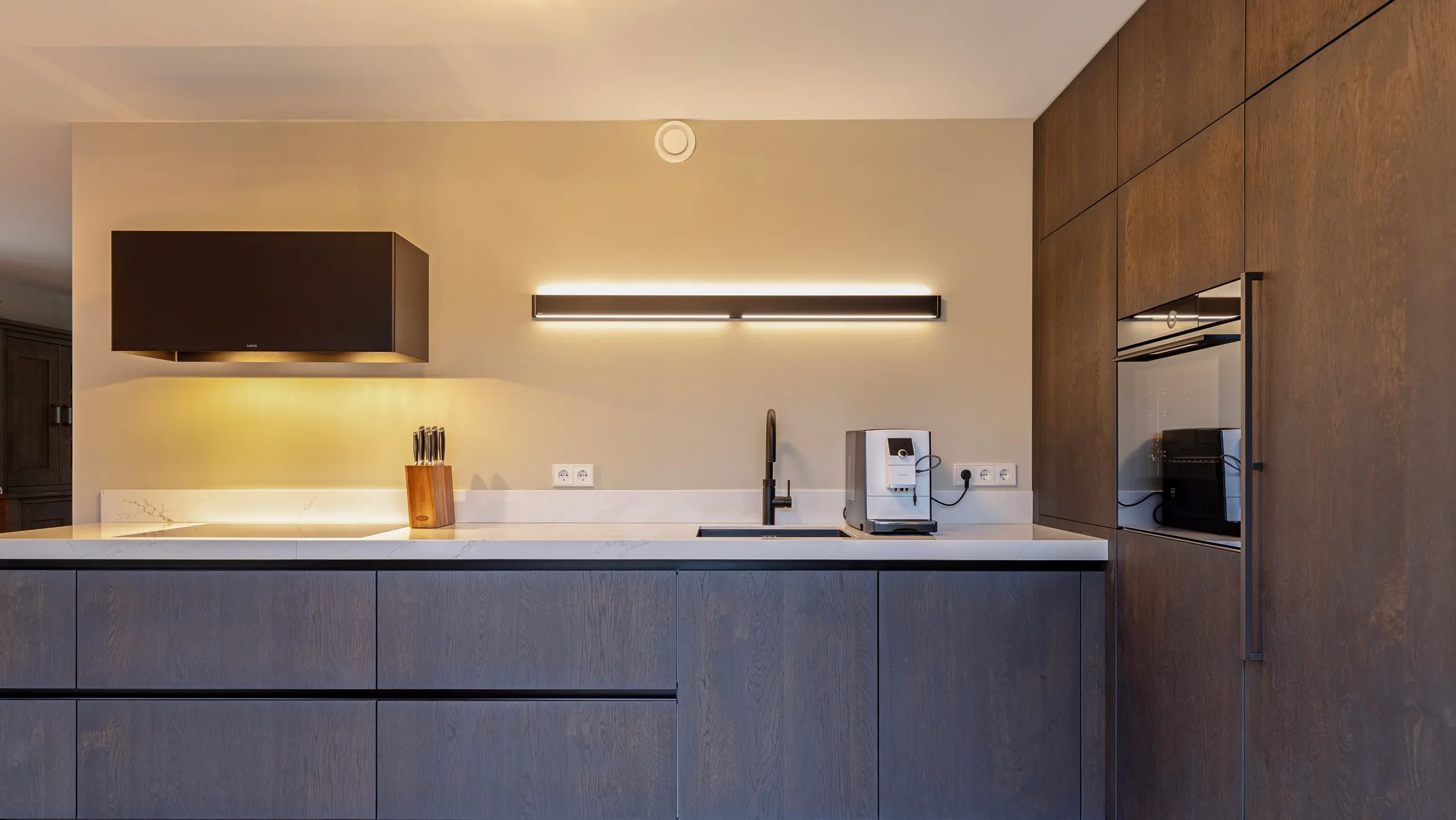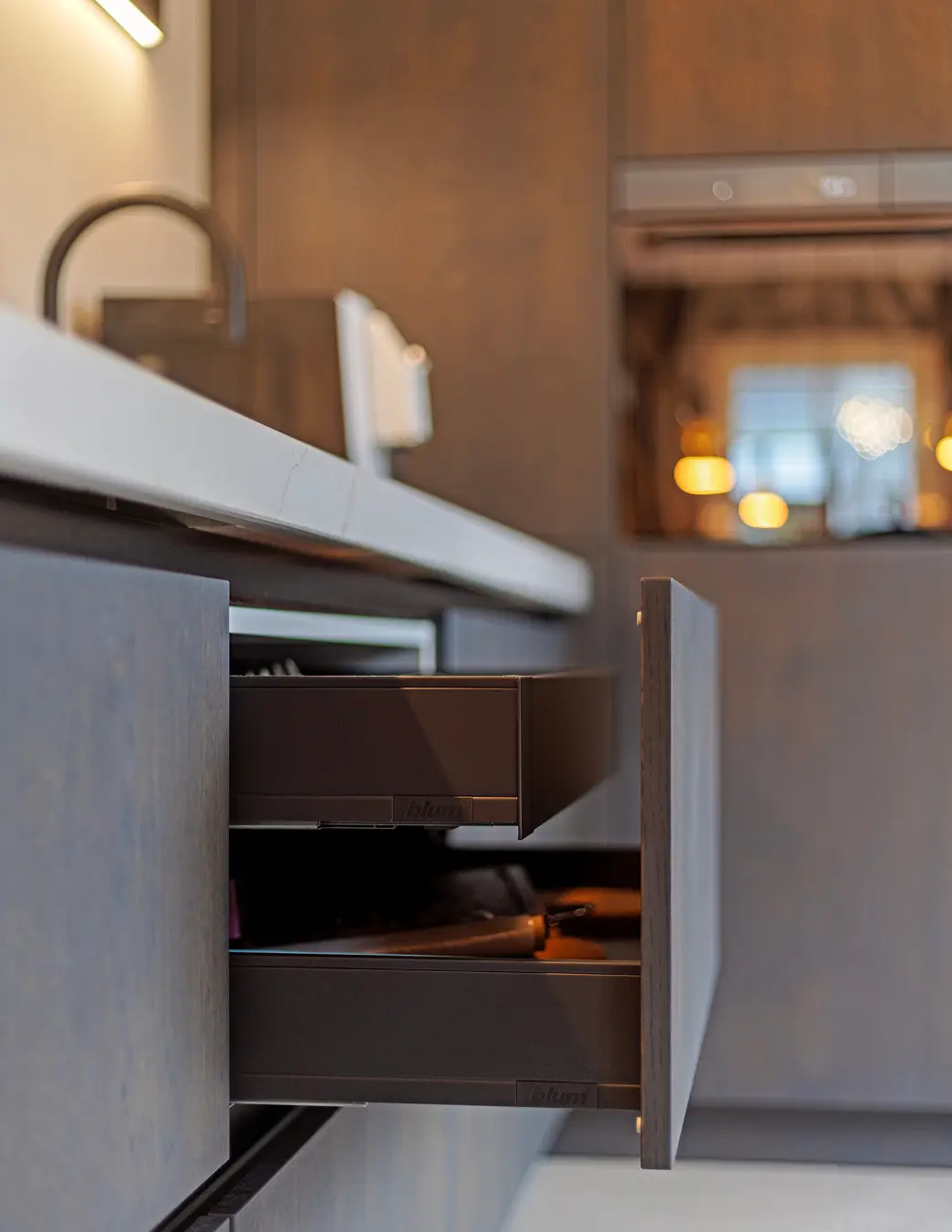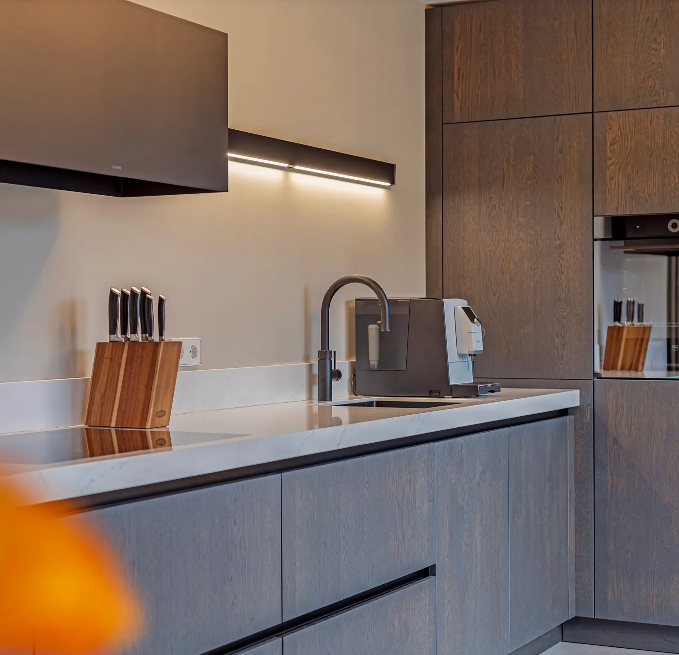 Deze moderne hoekkeuken combineert donkere fronten in betoonlook met een licht marmerkleurig werkblad voor een elegant en tijdloos contrast. De greeploze afwerking en strakke lijnen benadrukken het minimalistische ontwerp, terwijl de geïntegreerde verlichting boven het werkblad zorgt voor een warme, uitnodigende sfeer.