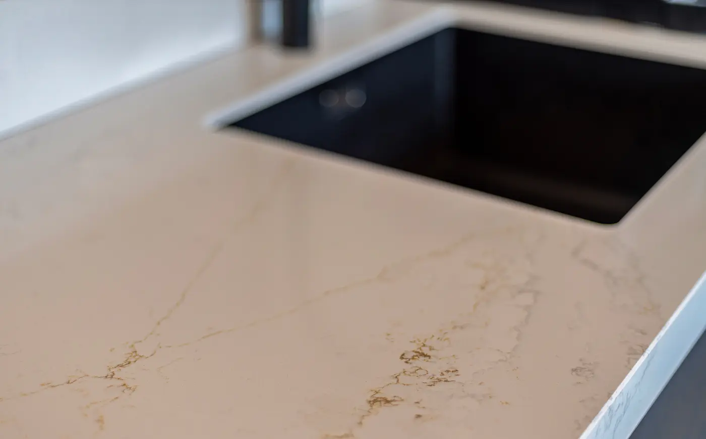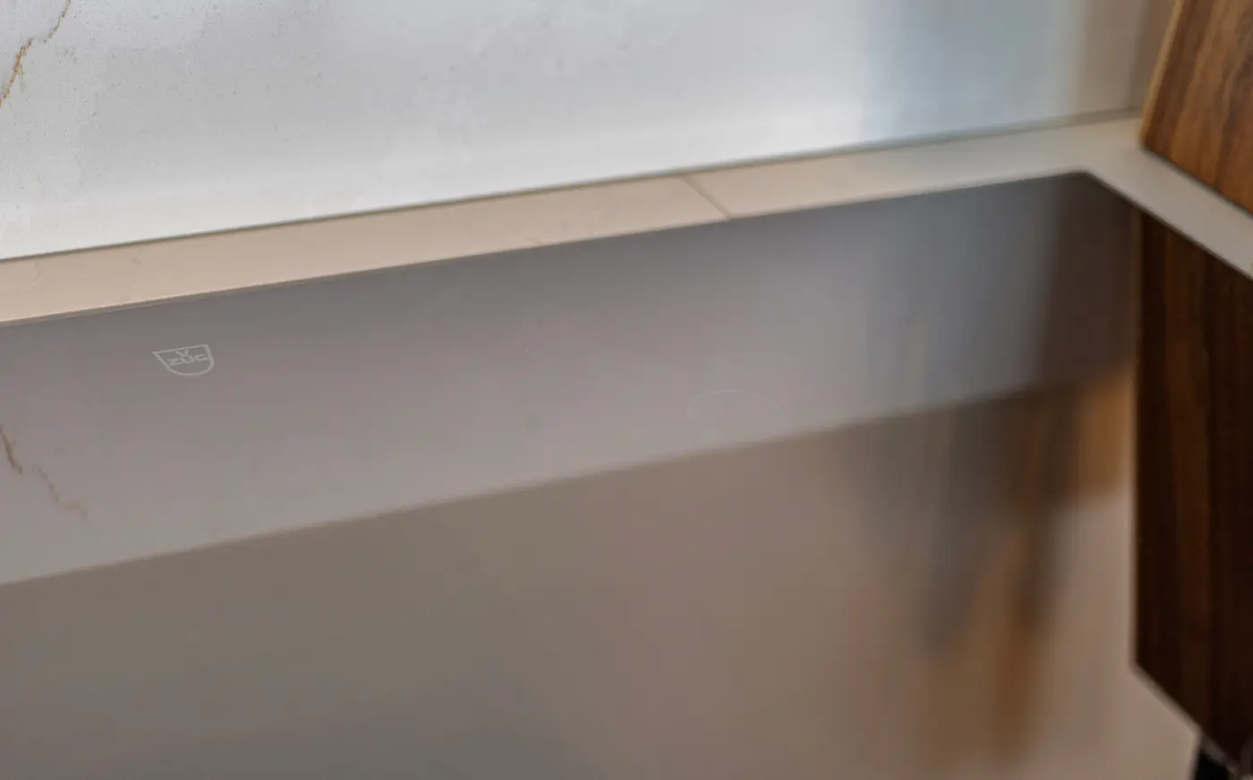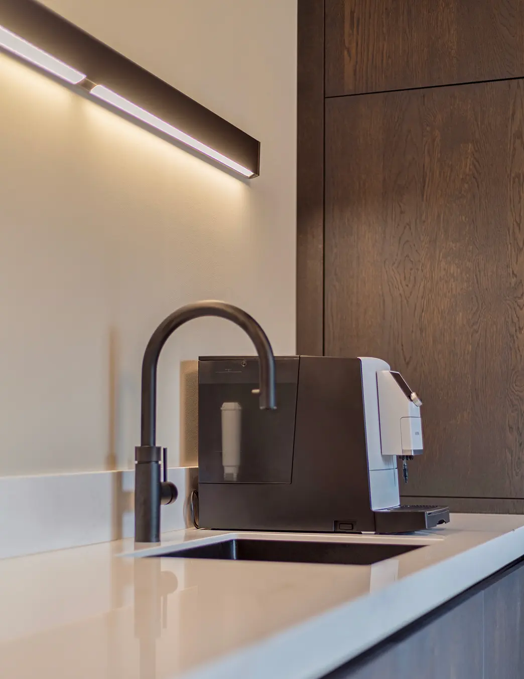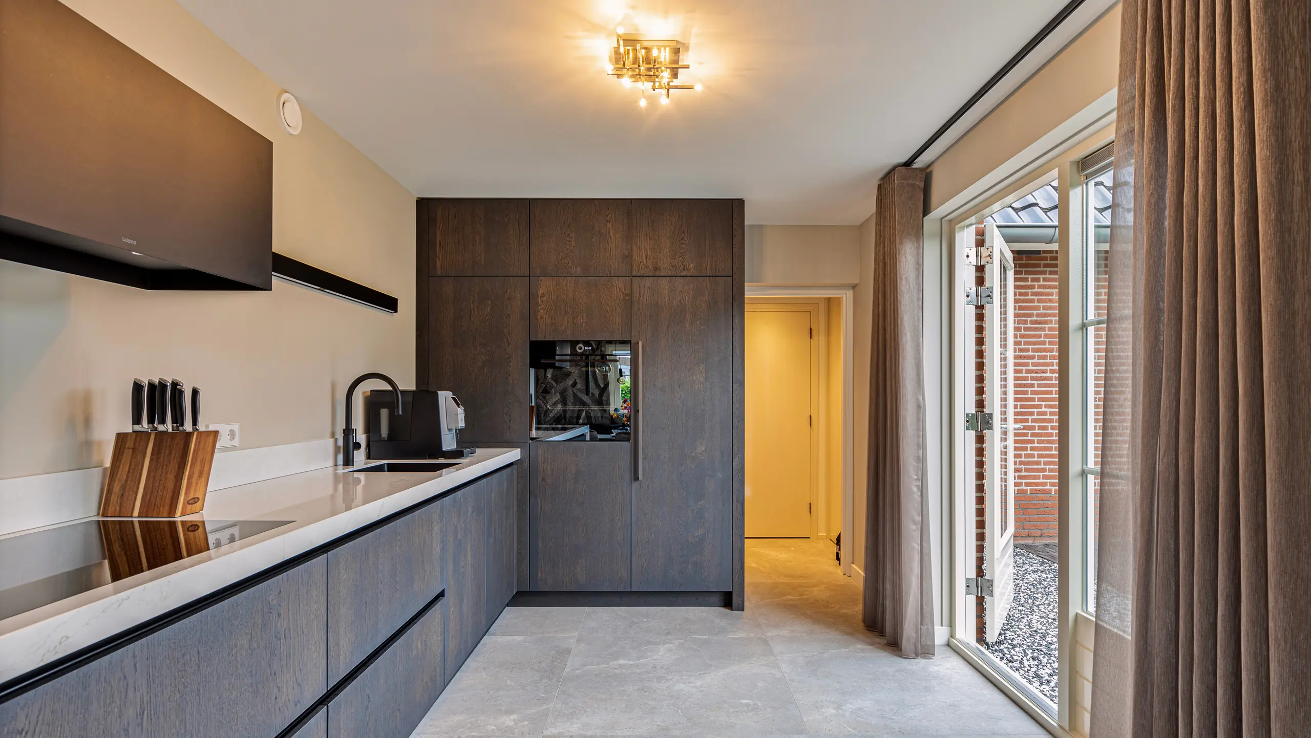 Deze moderne hoekkeuken combineert donkere fronten in betoonlook met een licht marmerkleurig werkblad voor een elegant en tijdloos contrast. De greeploze afwerking en strakke lijnen benadrukken het minimalistische ontwerp, terwijl de geïntegreerde verlichting boven het werkblad zorgt voor een warme, uitnodigende sfeer.