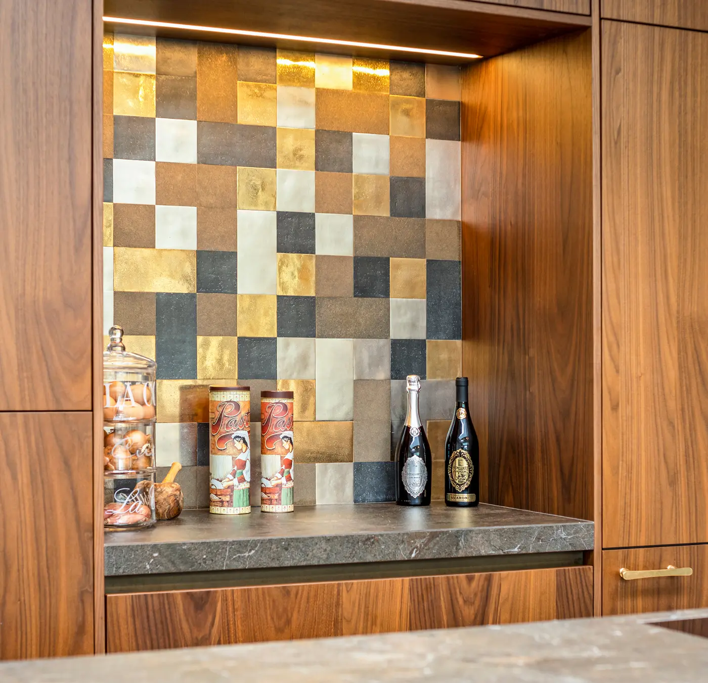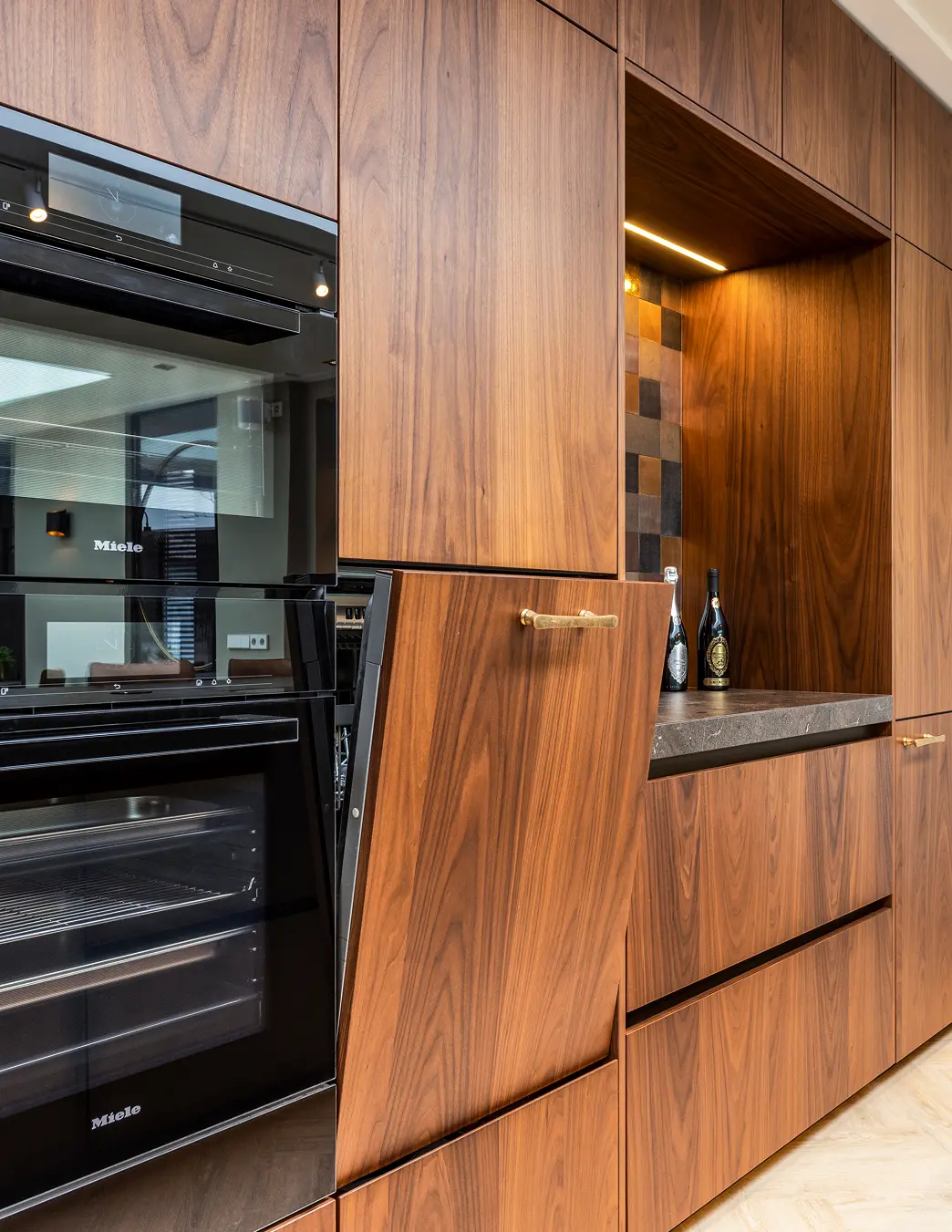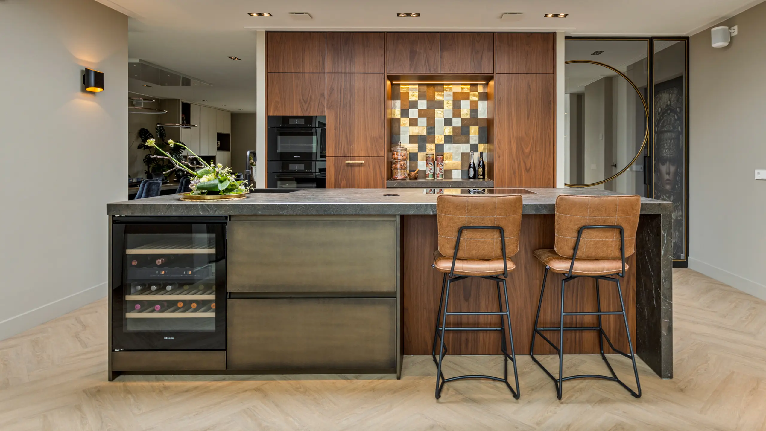 Deze prachtige keuken met een klassiek karakter combineert warm hout met de elegantie van natuursteen en subtiele metallic tinten. De walnoot fronten vormen een rijke basis, terwijl de bijzondere wandtegels een speels klassiek karakter toevoegen. Het royale bargedeelte nodigt uit tot samenkomen en geeft de ruimte een gastvrije sfeer. Zo brengt deze keuken luxe, comfort en tijdloze charme op een perfect manier samen.