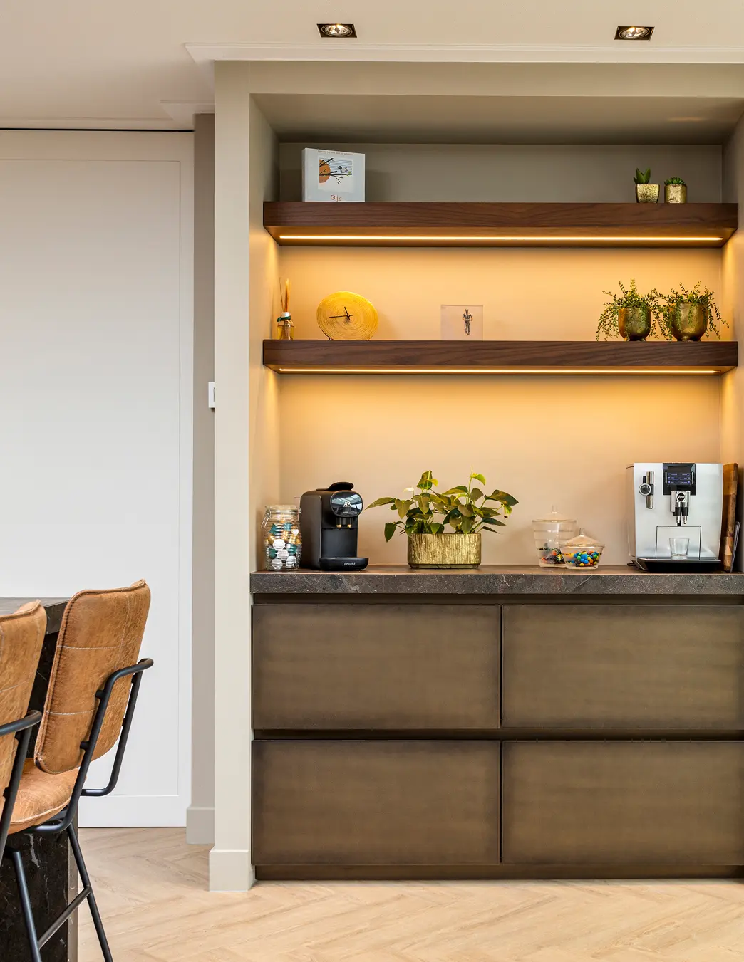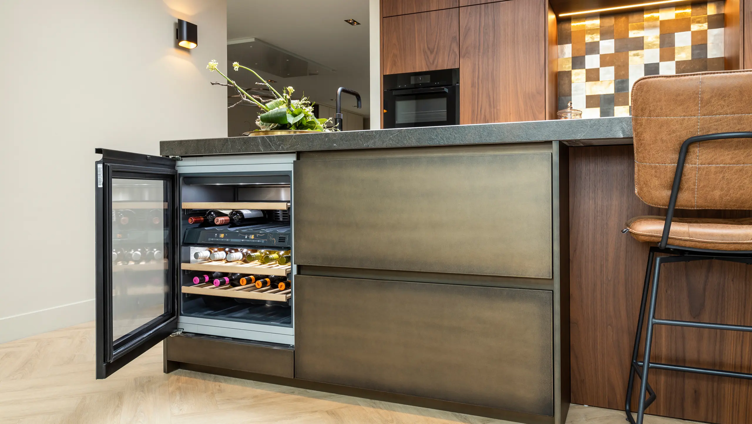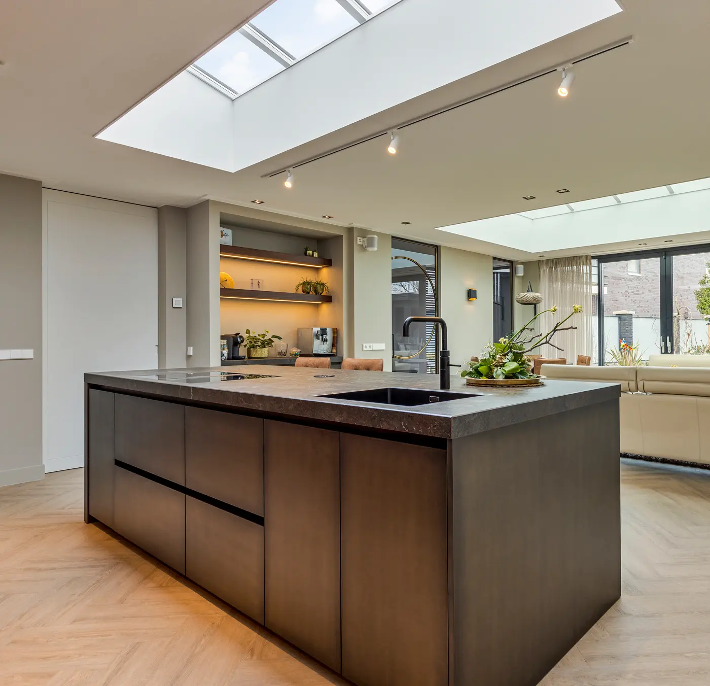 Deze prachtige keuken met een klassiek karakter combineert warm hout met de elegantie van natuursteen en subtiele metallic tinten. De walnoot fronten vormen een rijke basis, terwijl de bijzondere wandtegels een speels klassiek karakter toevoegen. Het royale bargedeelte nodigt uit tot samenkomen en geeft de ruimte een gastvrije sfeer. Zo brengt deze keuken luxe, comfort en tijdloze charme op een perfect manier samen.