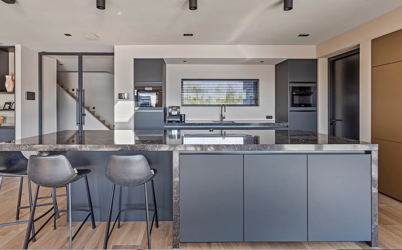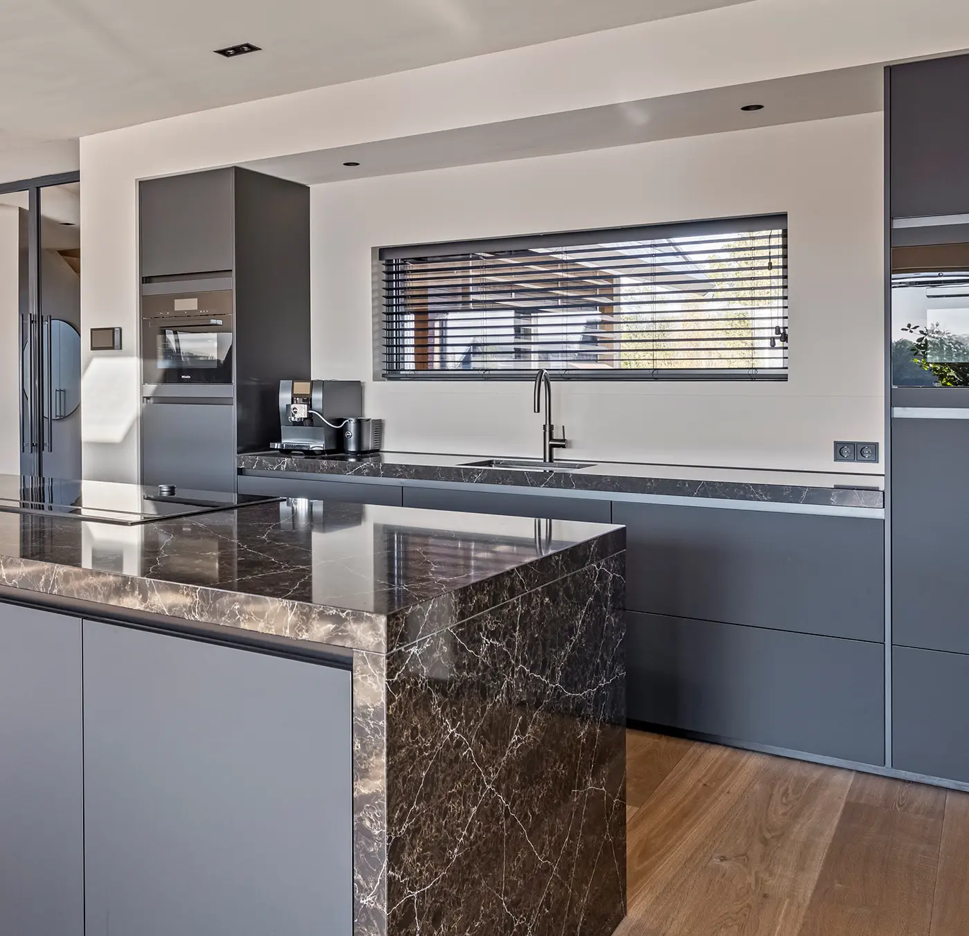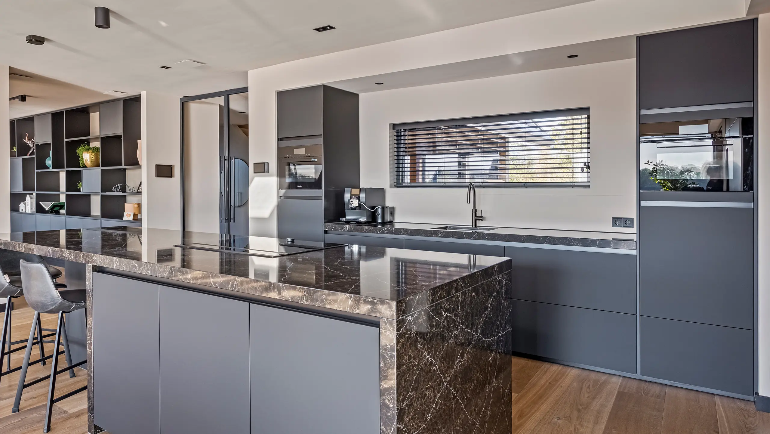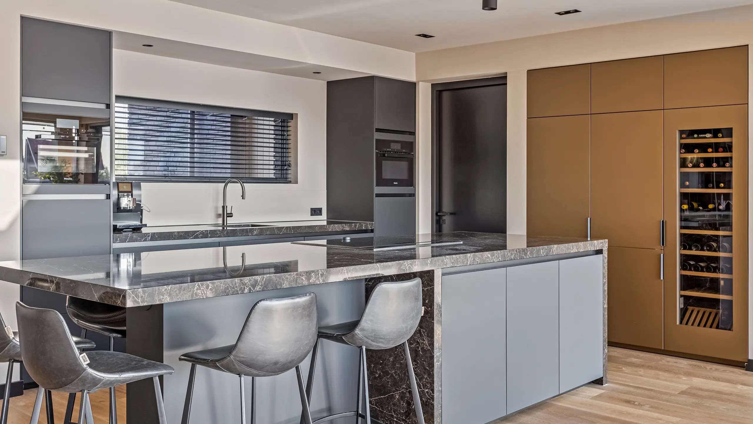 Deze moderne keuken met royaal kookeiland en bargedeelte ademt pure elegantie. Het donkere granieten werkblad vormt een krachtig contrast met de zachte antraciettinten en geeft de ruimte een verfijnde, luxe uitstraling. De Miele-apparatuur biedt topprestaties en maakt koken tot een plezier, terwijl de goudkleurige accenten de keuken een exclusieve uitstraling geven.