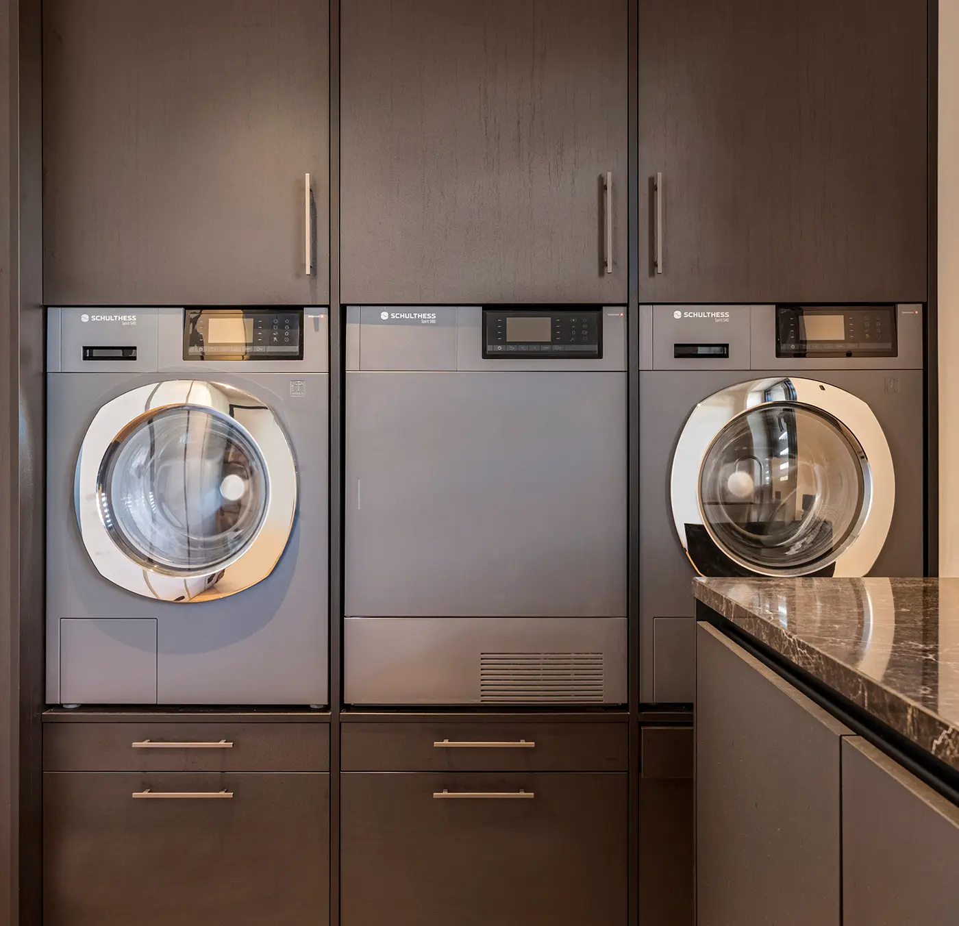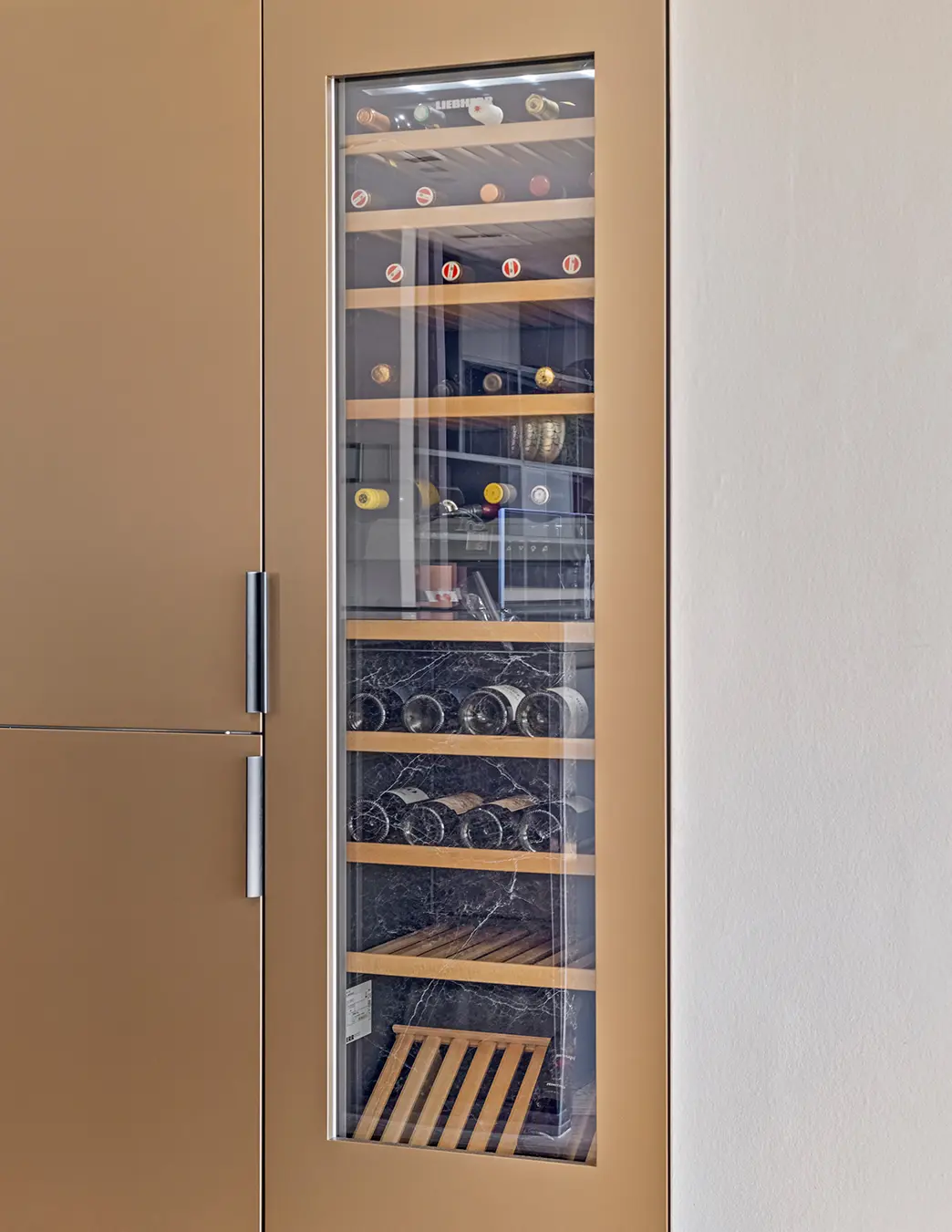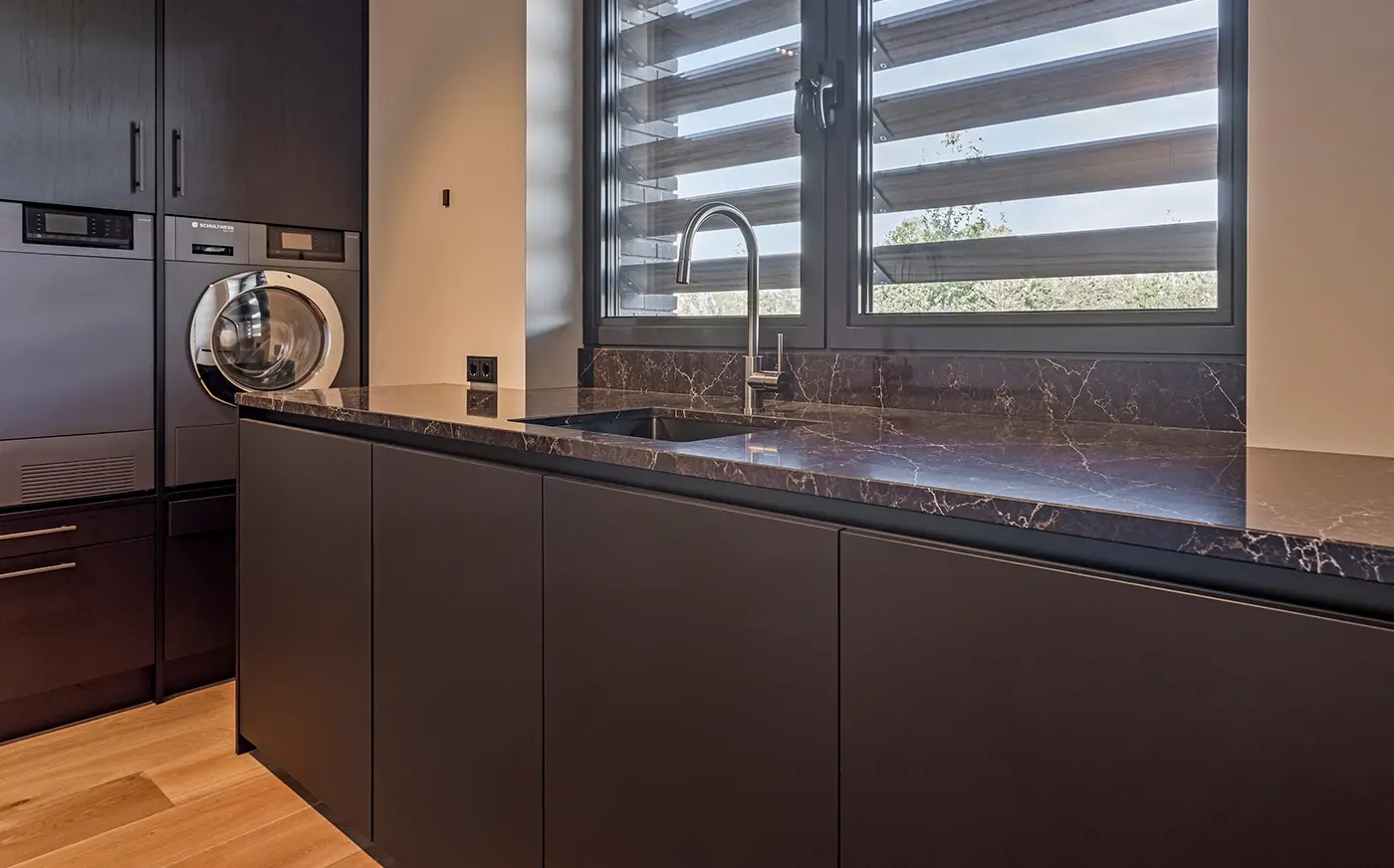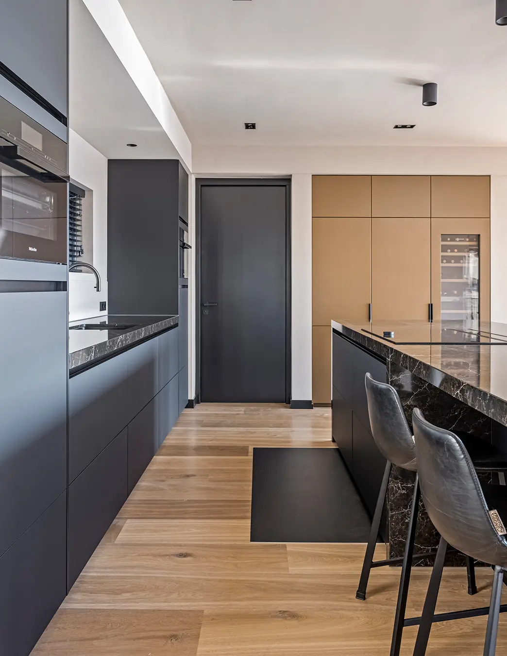 Deze moderne keuken met royaal kookeiland en bargedeelte ademt pure elegantie. Het donkere granieten werkblad vormt een krachtig contrast met de zachte antraciettinten en geeft de ruimte een verfijnde, luxe uitstraling. De Miele-apparatuur biedt topprestaties en maakt koken tot een plezier, terwijl de goudkleurige accenten de keuken een exclusieve uitstraling geven.