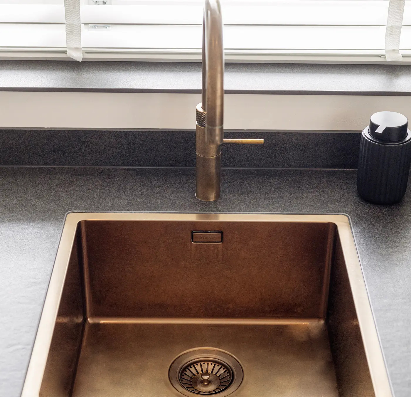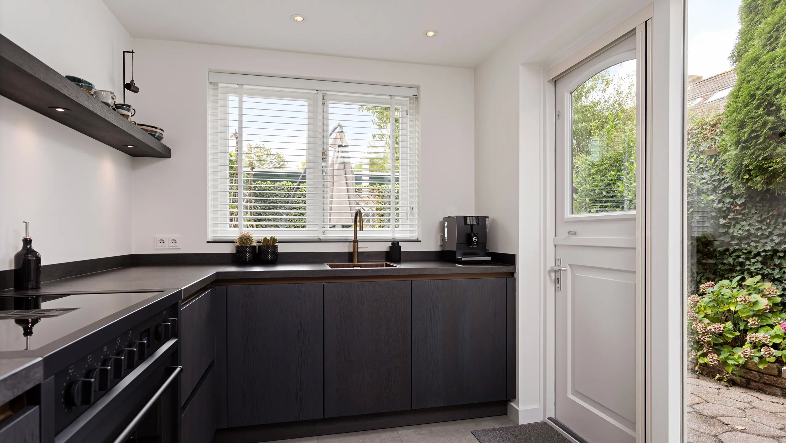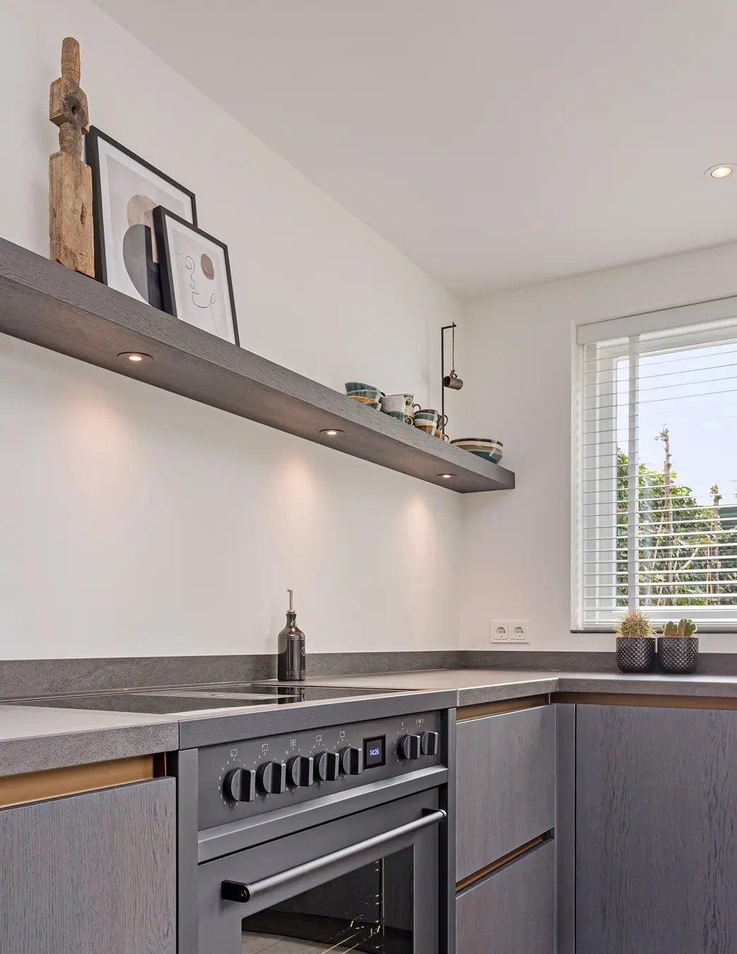 Deze moderne hoekkeuken combineert donker gerookt eikenhout met subtiele bronsaccenten en een stoer stenen werkblad, wat zorgt voor een perfecte balans tussen warmte en strak design. Het fornuis met klassieke knoppen voegt een ambachtelijk karakter toe, terwijl de greeploze fronten en geïntegreerde verlichting zorgen voor een eigentijdse, sfeervolle uitstraling.