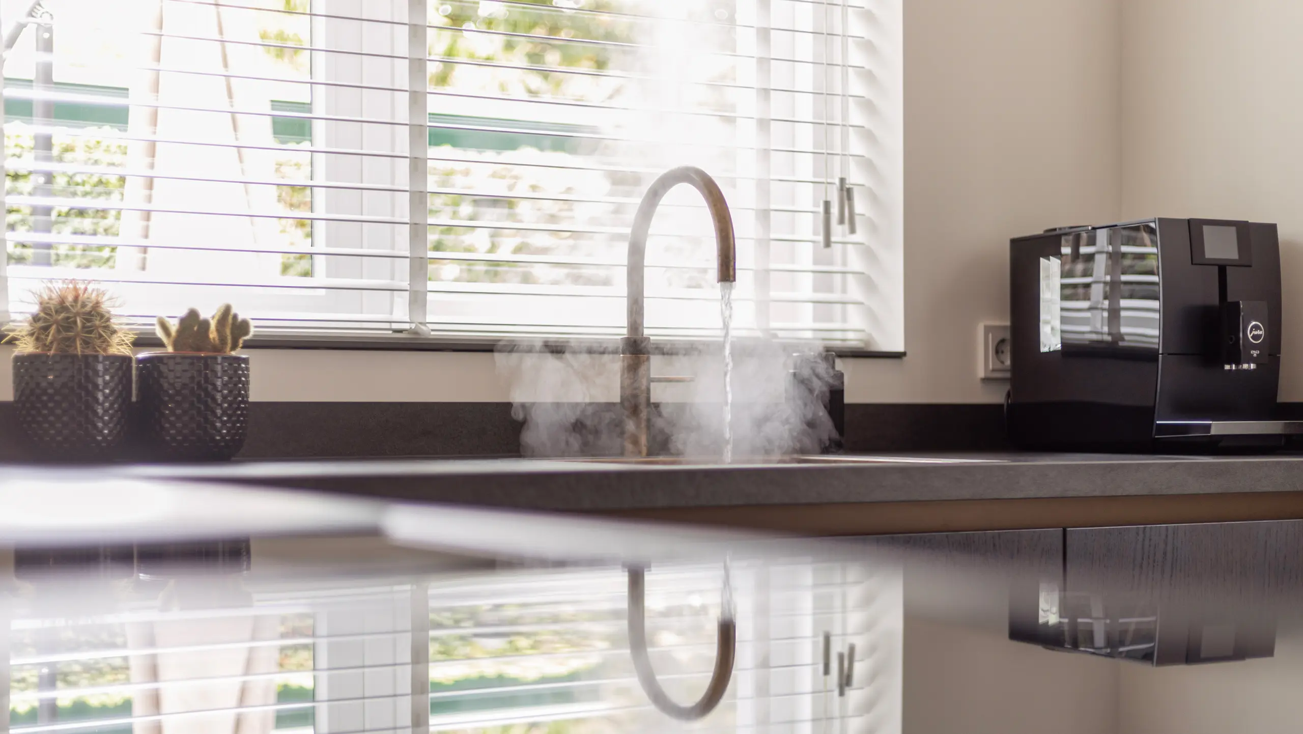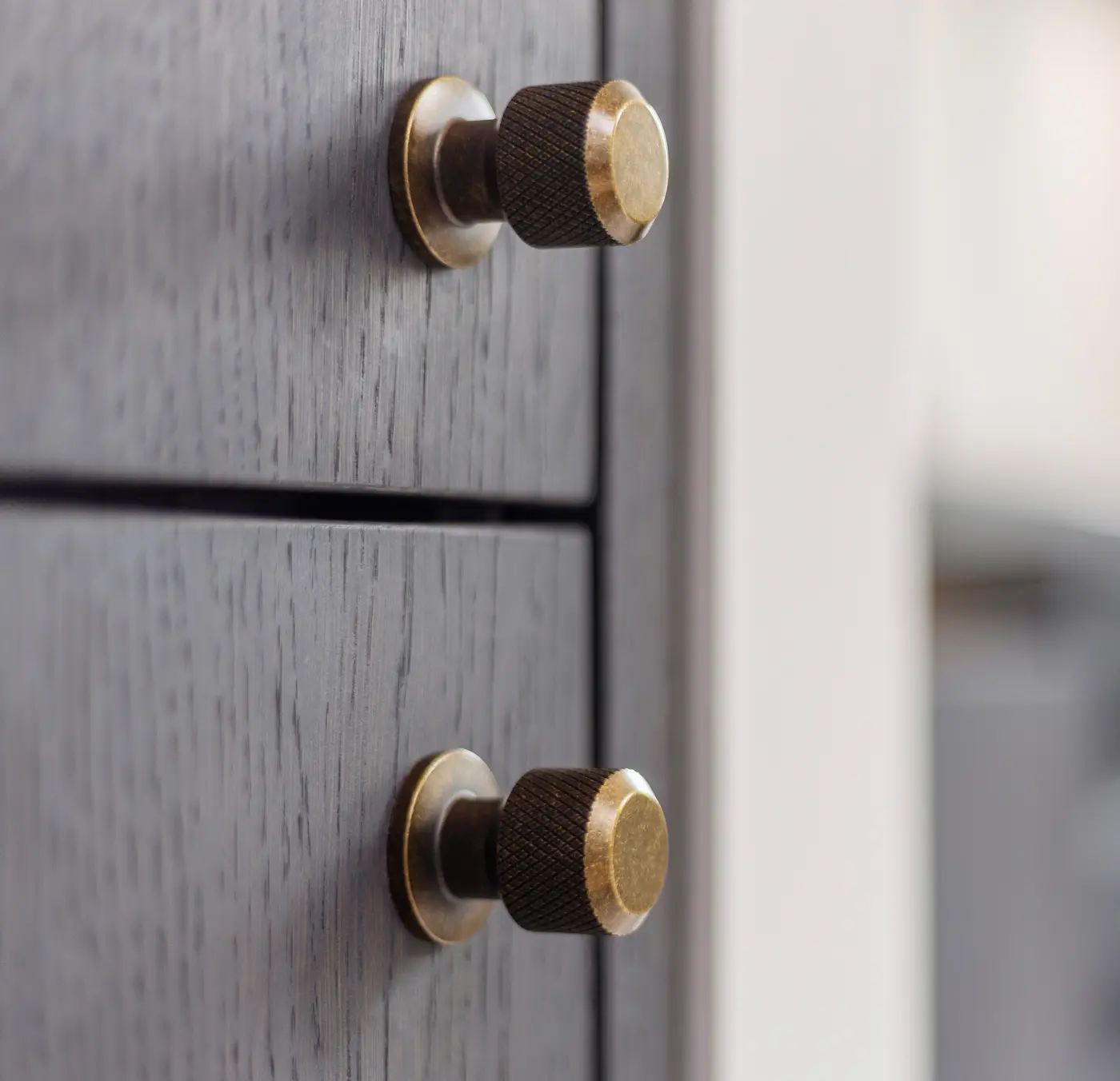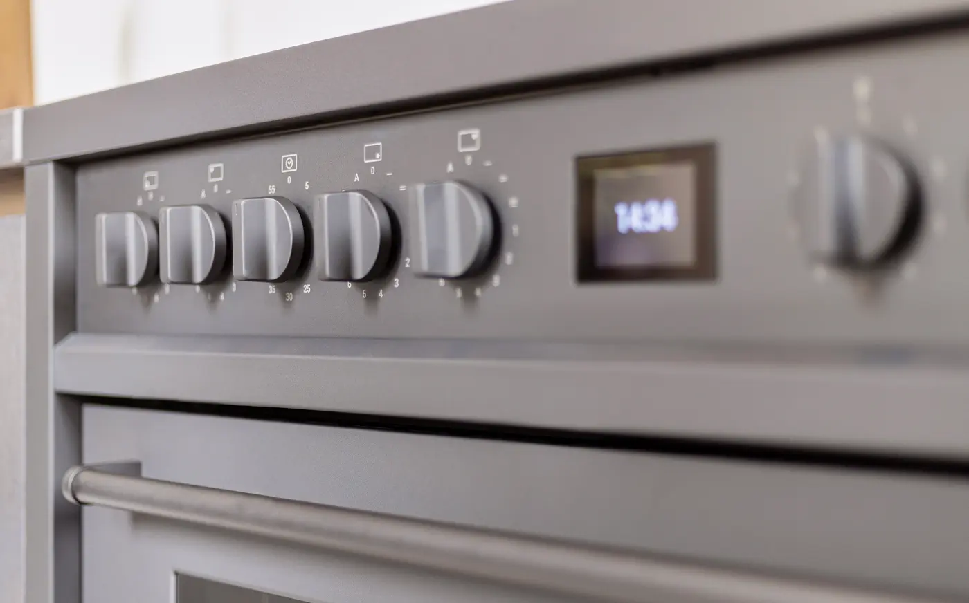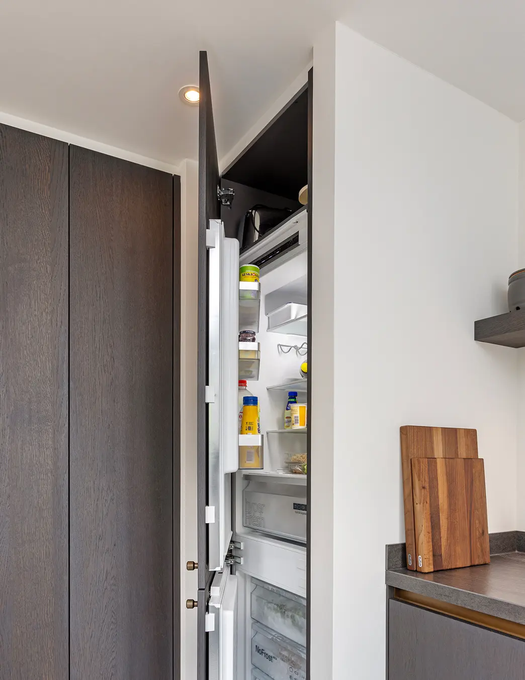 Deze moderne hoekkeuken combineert donker gerookt eikenhout met subtiele bronsaccenten en een stoer stenen werkblad, wat zorgt voor een perfecte balans tussen warmte en strak design. Het fornuis met klassieke knoppen voegt een ambachtelijk karakter toe, terwijl de greeploze fronten en geïntegreerde verlichting zorgen voor een eigentijdse, sfeervolle uitstraling.