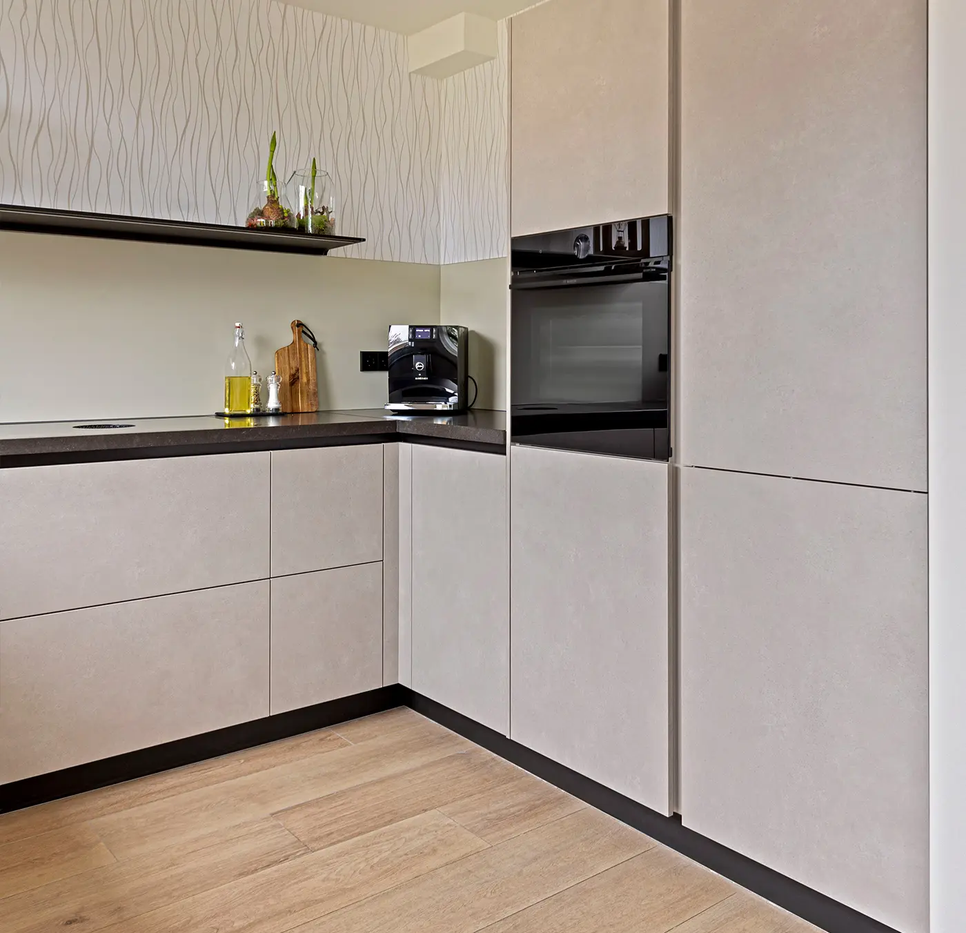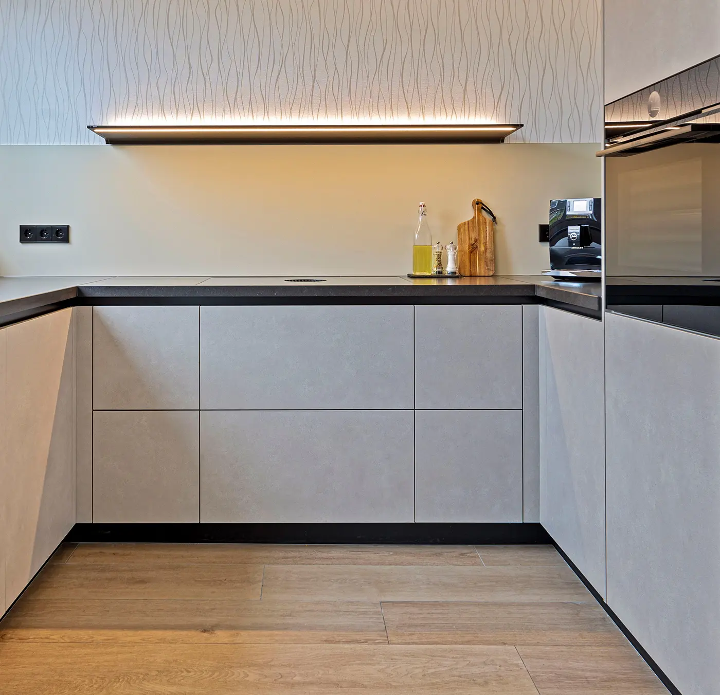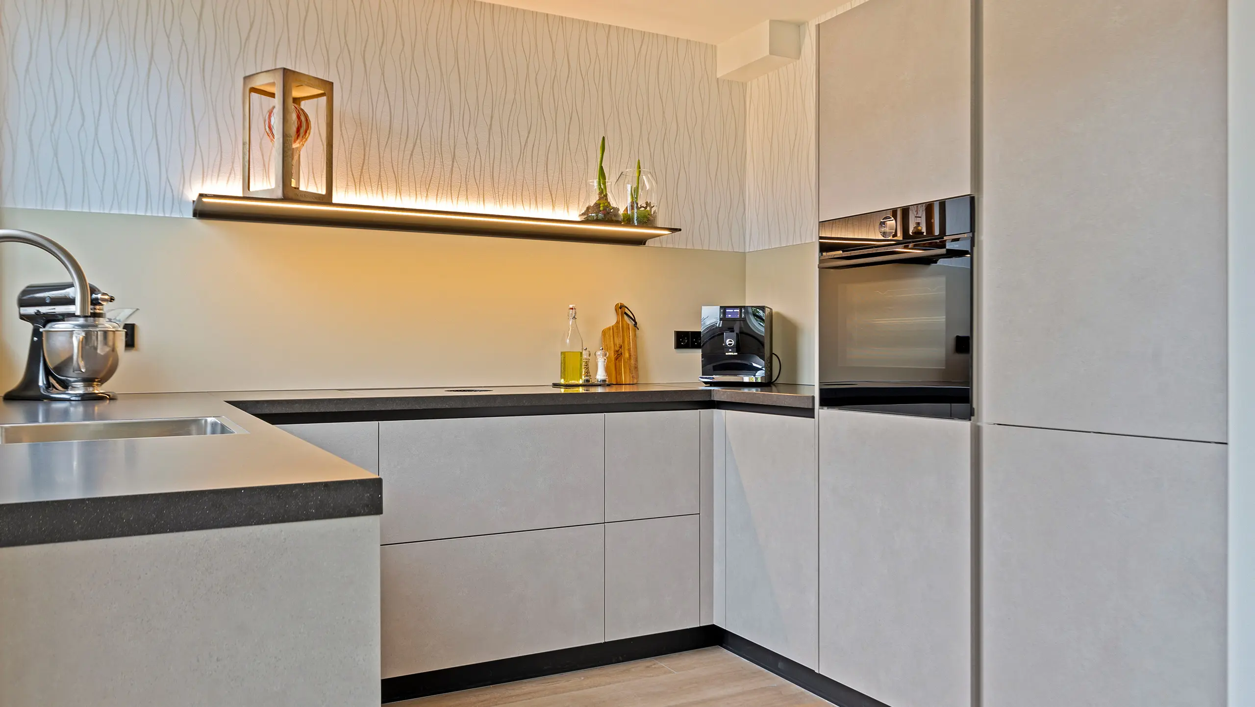 Deze moderne hoekkeuken in lichtgrijs straalt rust en eenvoud uit. De greeploze fronten en het donkere werkblad creëren een strak contrast dat perfect past bij een eigentijdse inrichting. Dankzij de Bosch-apparatuur en design-afzuiging van Novy is koken hier niet alleen comfortabel, maar ook stil en efficiënt. De subtiele verlichting en het warme lijnenspel in de wandbekleding maken het geheel sfeervol en helemaal in balans.