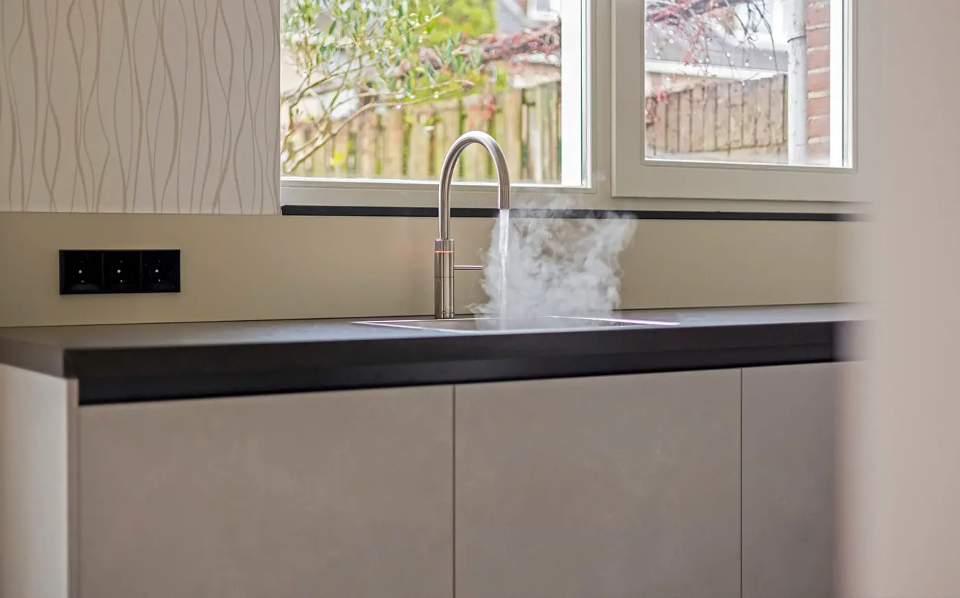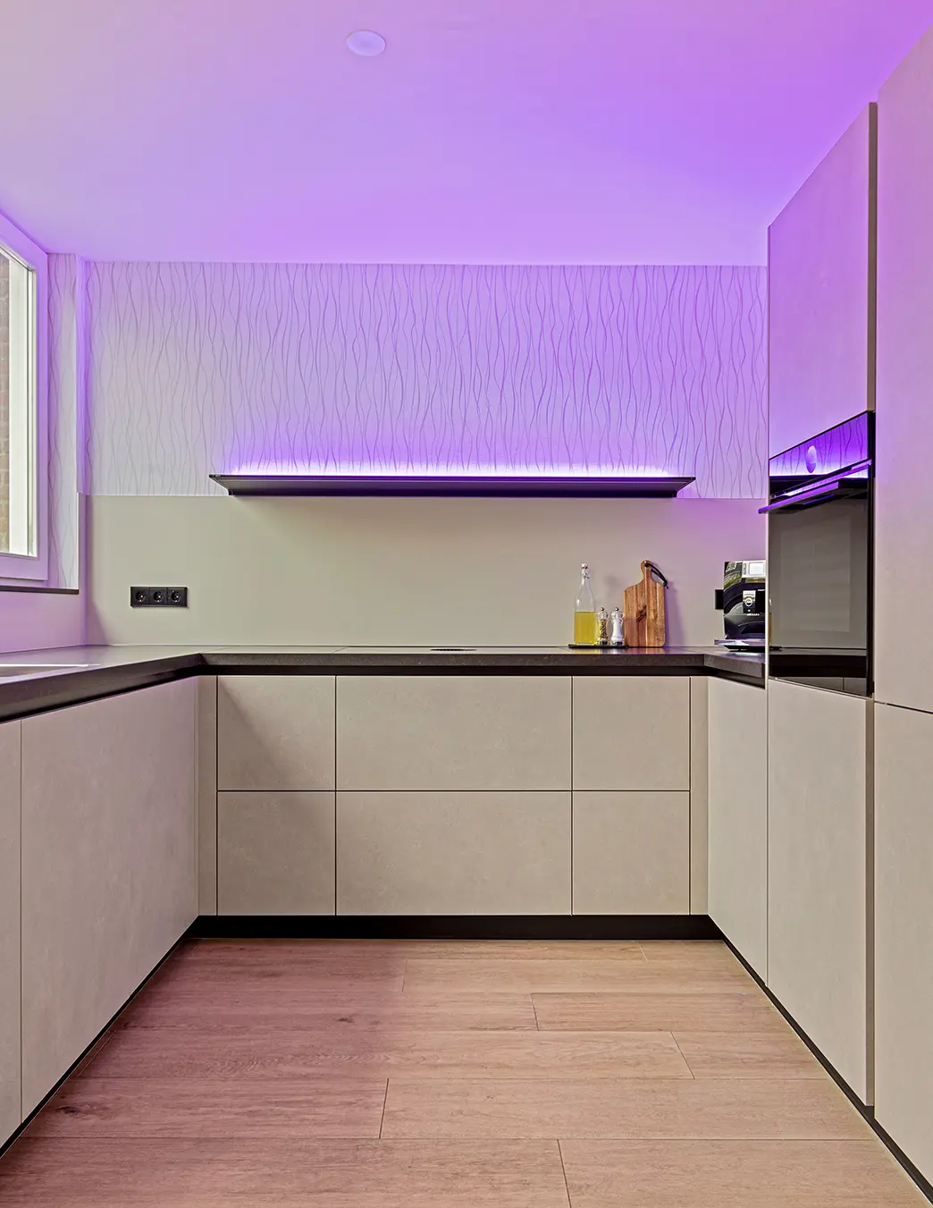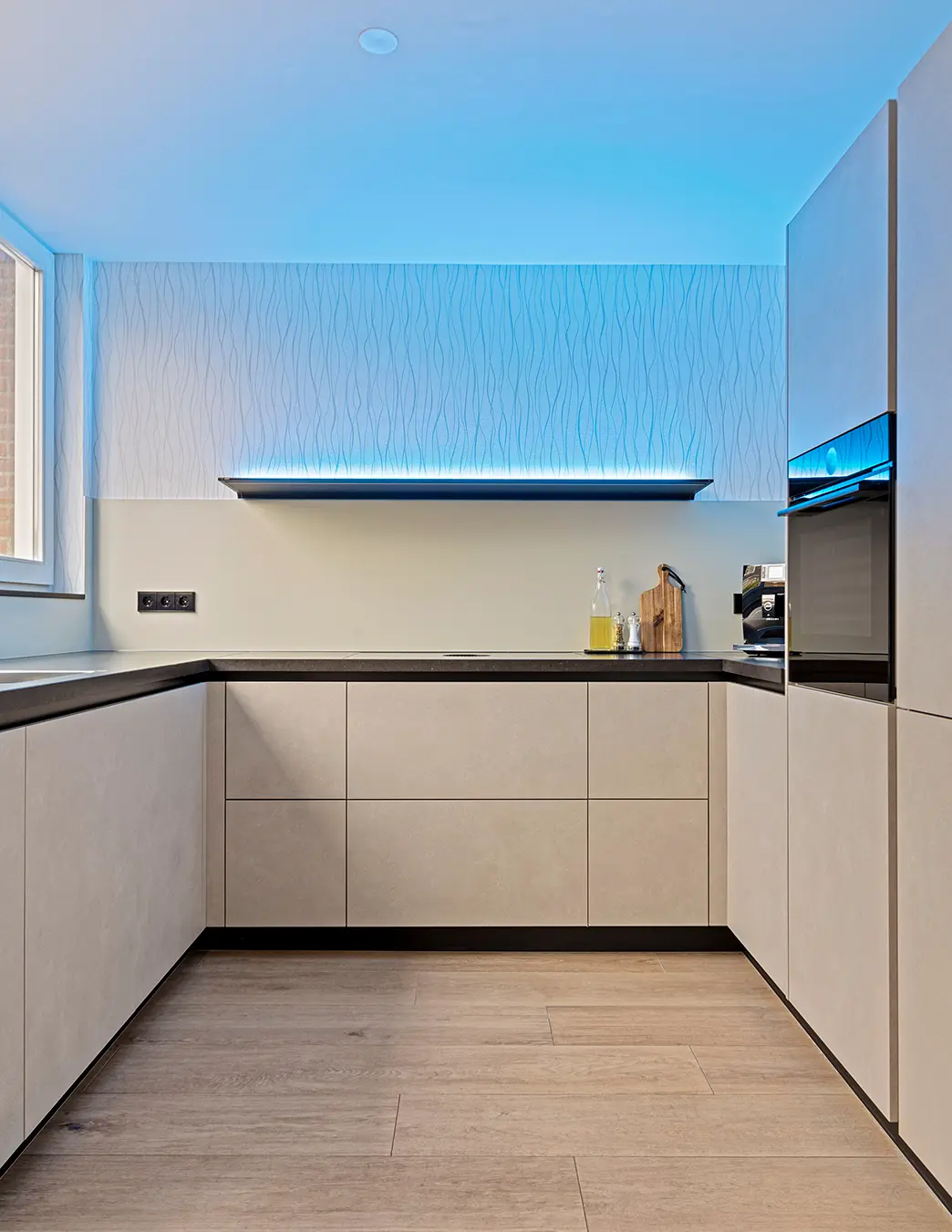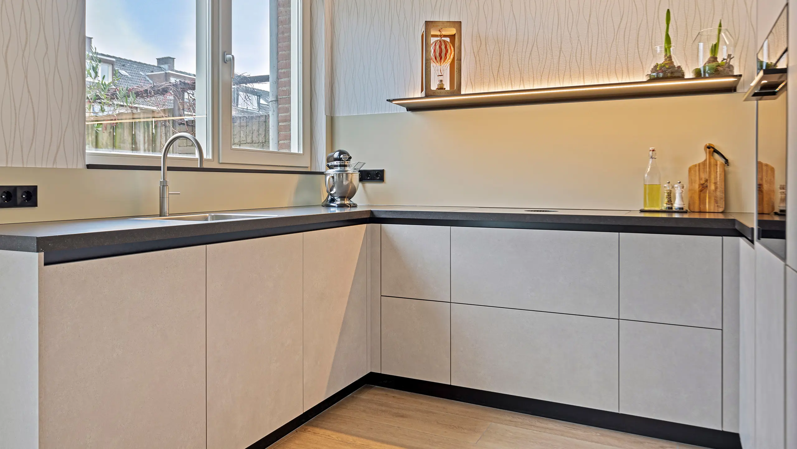 Deze moderne hoekkeuken in lichtgrijs straalt rust en eenvoud uit. De greeploze fronten en het donkere werkblad creëren een strak contrast dat perfect past bij een eigentijdse inrichting. Dankzij de Bosch-apparatuur en design-afzuiging van Novy is koken hier niet alleen comfortabel, maar ook stil en efficiënt. De subtiele verlichting en het warme lijnenspel in de wandbekleding maken het geheel sfeervol en helemaal in balans.