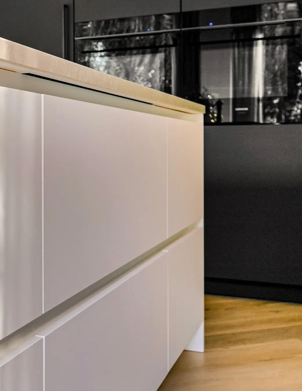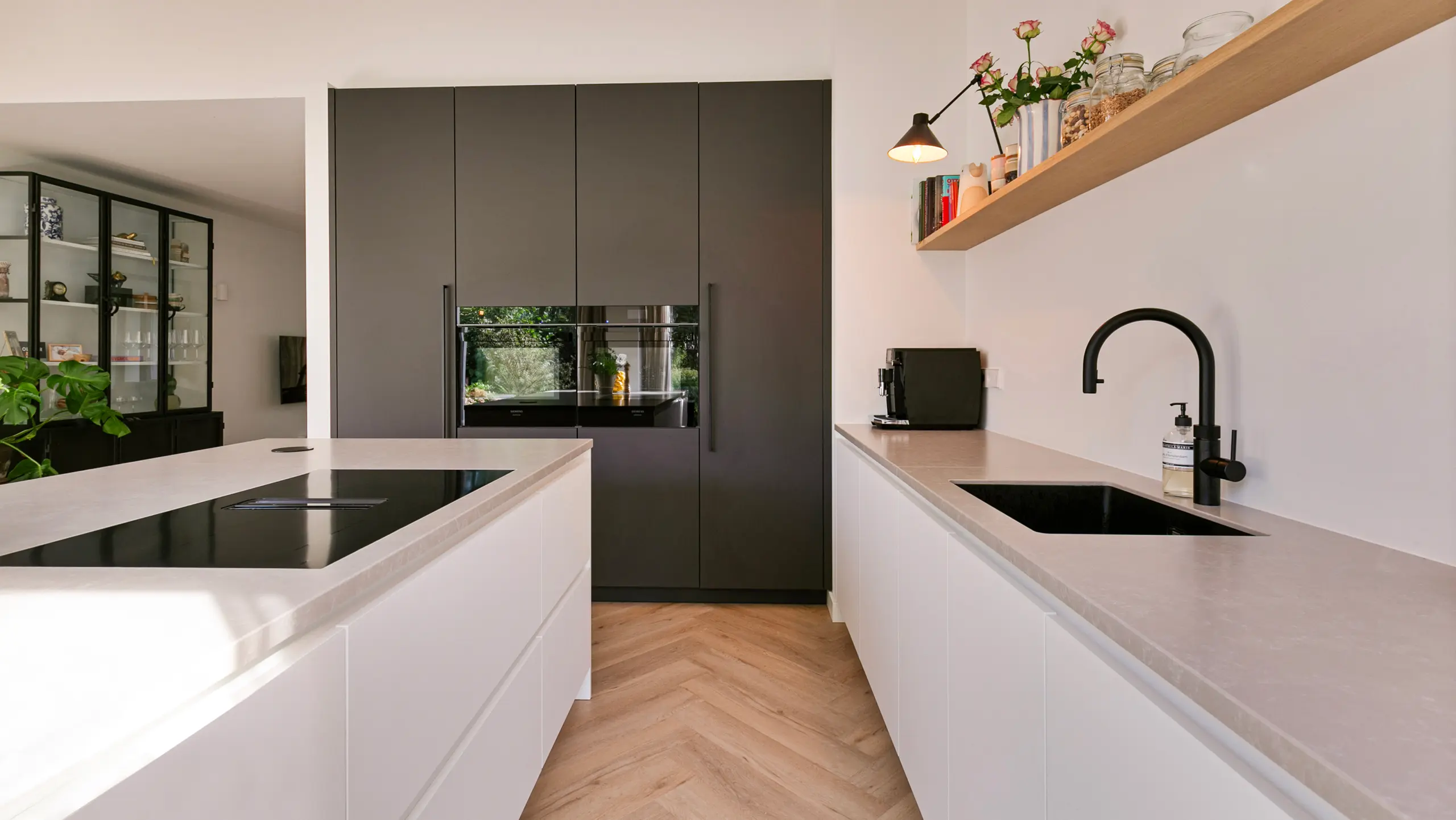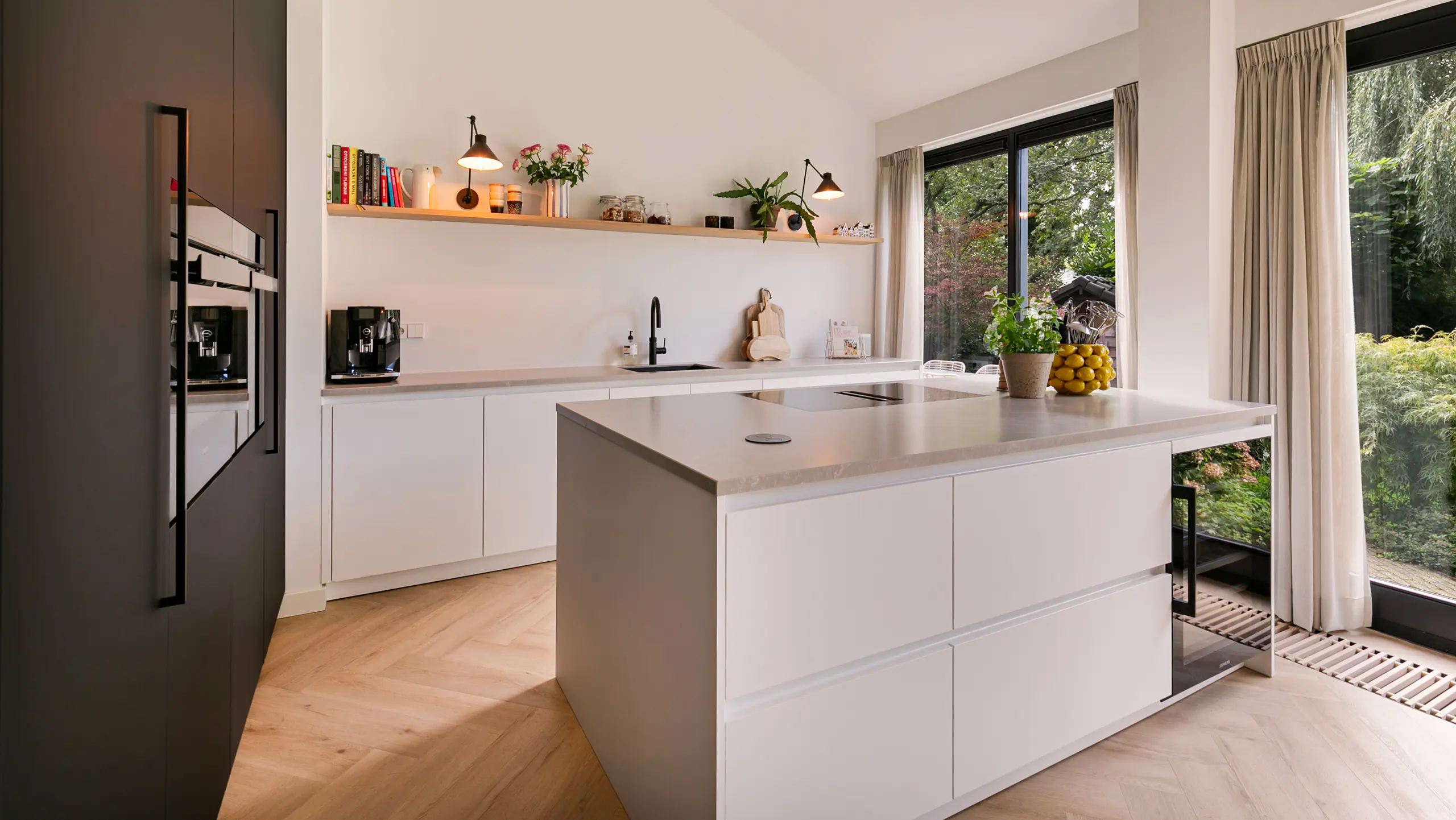 Deze moderne keuken combineert een helder wit kleurenpalet met donkere accenten voor een stijlvol contrast. Het ruime kookeiland vormt het hart van de keuken, terwijl de greeploze fronten zorgen voor een strak, naadloos geheel. De houten plank en sfeervolle verlichting brengen warmte in het moderne ontwerp, en de Siemens apparatuur garandeert een optimale kookervaring.