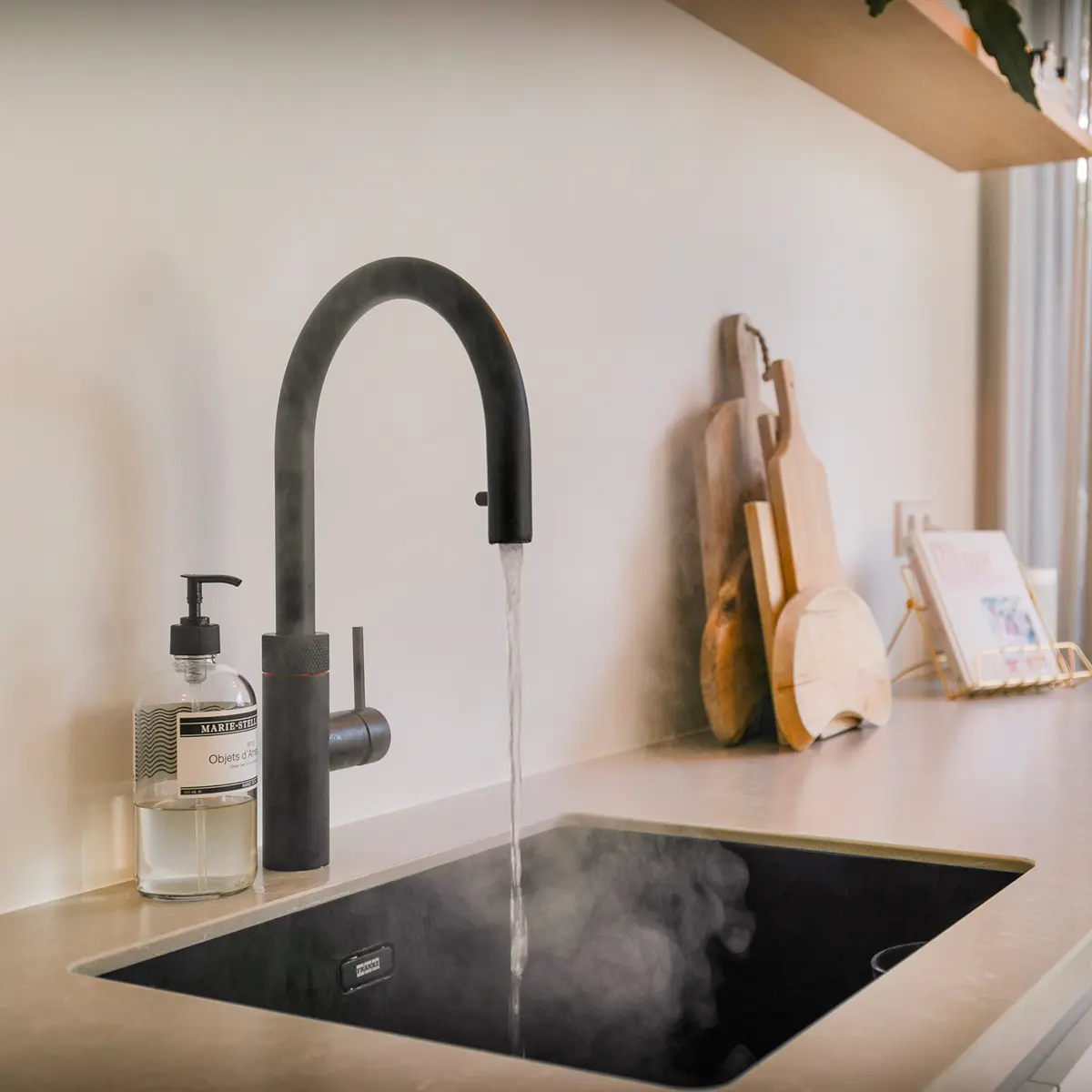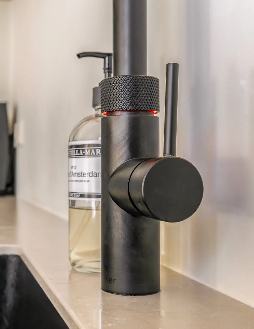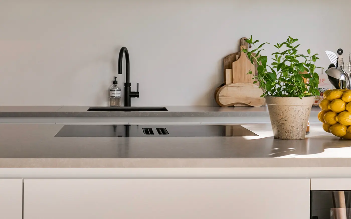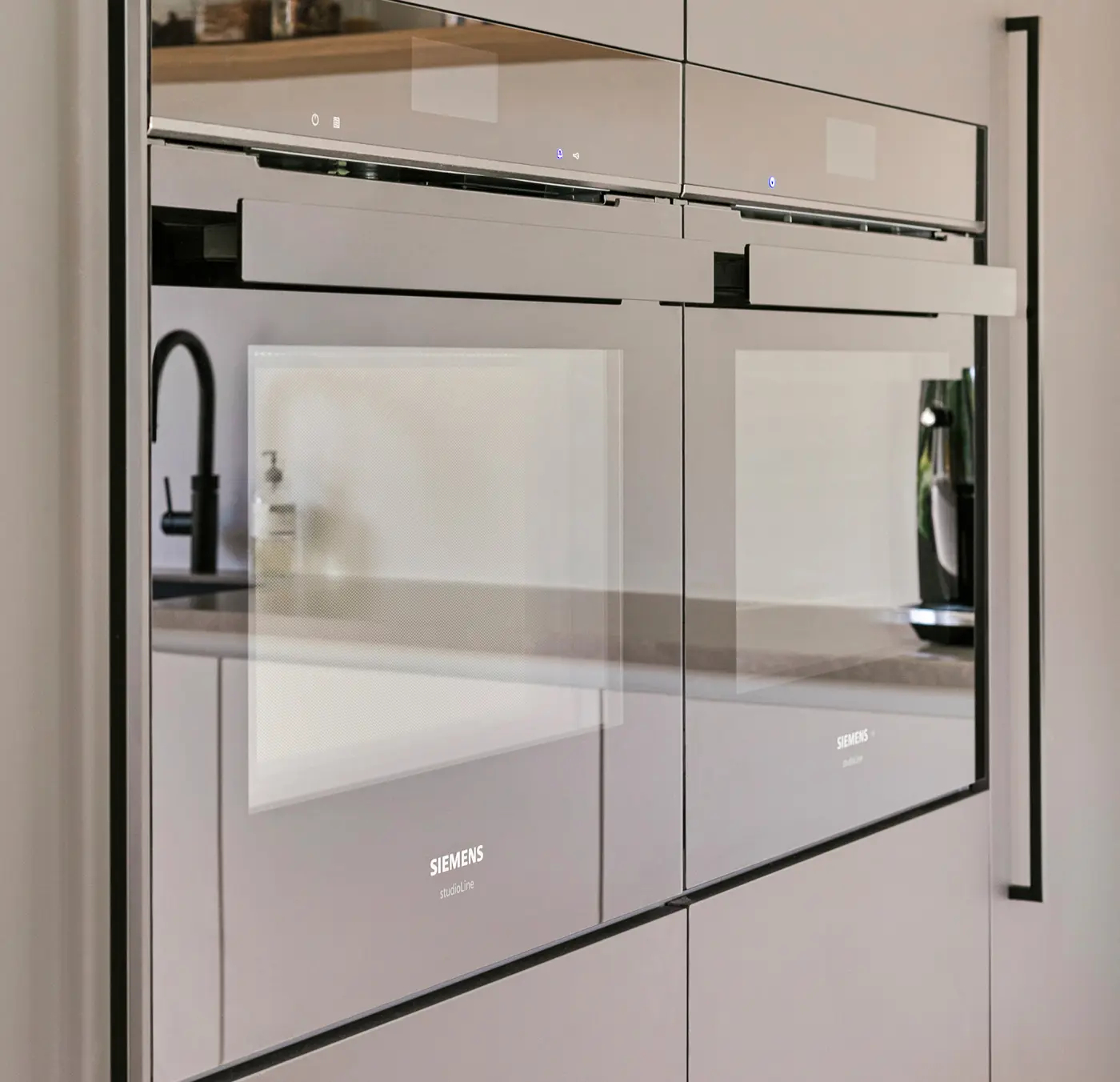 Deze moderne keuken combineert een helder wit kleurenpalet met donkere accenten voor een stijlvol contrast. Het ruime kookeiland vormt het hart van de keuken, terwijl de greeploze fronten zorgen voor een strak, naadloos geheel. De houten plank en sfeervolle verlichting brengen warmte in het moderne ontwerp, en de Siemens apparatuur garandeert een optimale kookervaring.