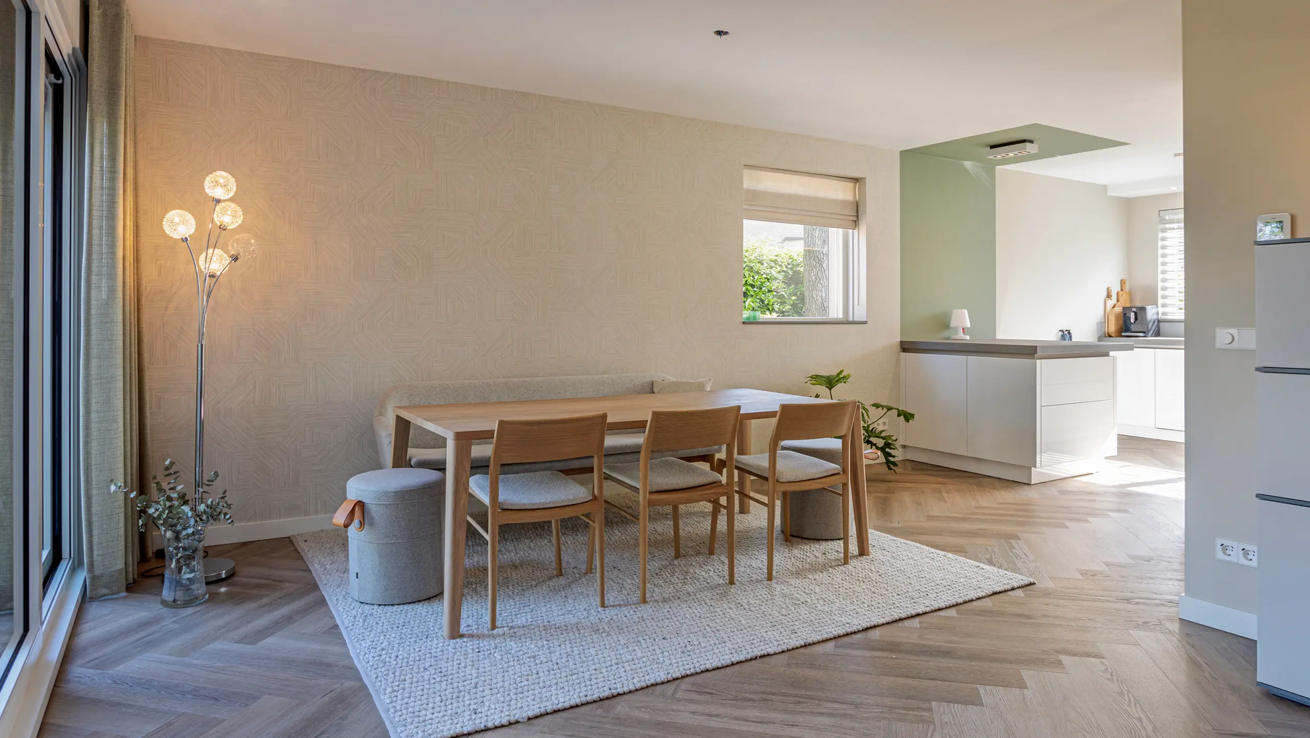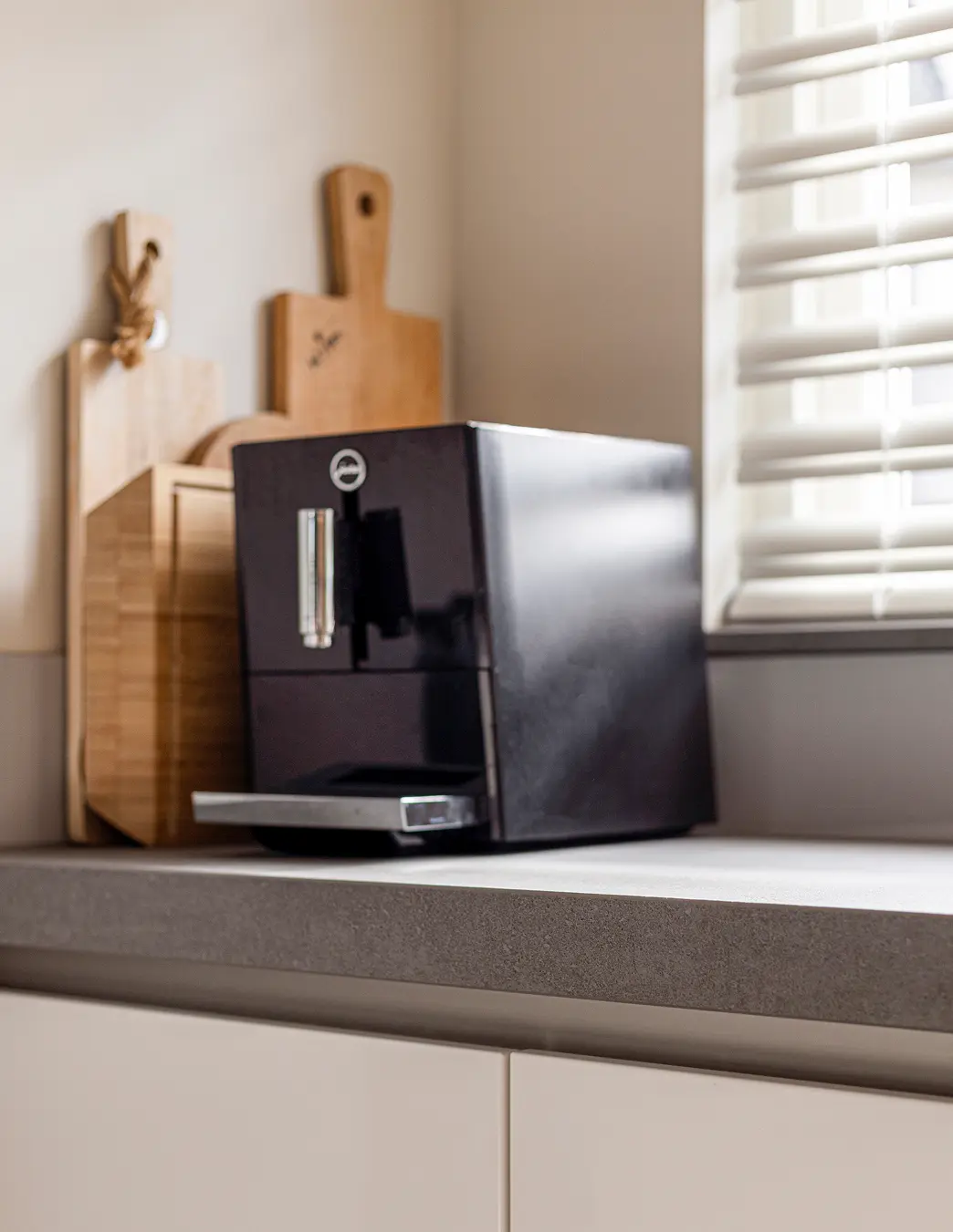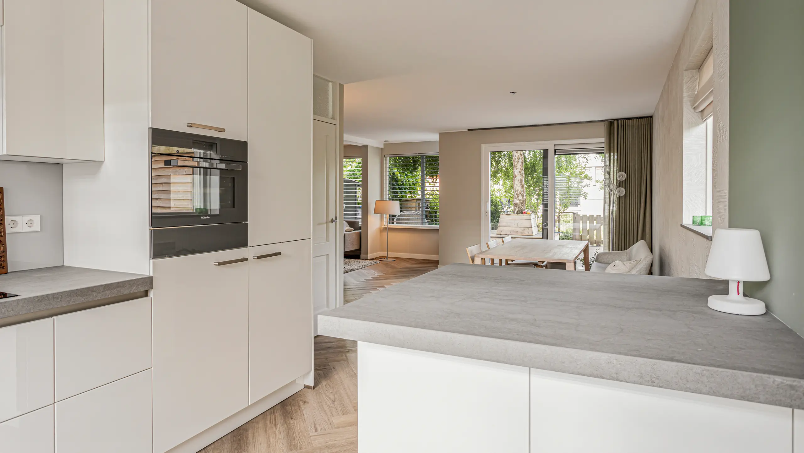 Deze moderne witte hoekkeuken straalt rust en verfijning uit dankzij het strakke lijnenspel en het subtiele contrast tussen de hoogglans fronten en het grijze werkblad. De geïntegreerde bar creëert een gezellige plek om te ontbijten of te borrelen, terwijl slimme opberglades en kasten zorgen voor optimale functionaliteit. Door de combinatie van natuurlijke lichtinval en een lichte, open opzet voelt de ruimte fris en ruimtelijk.