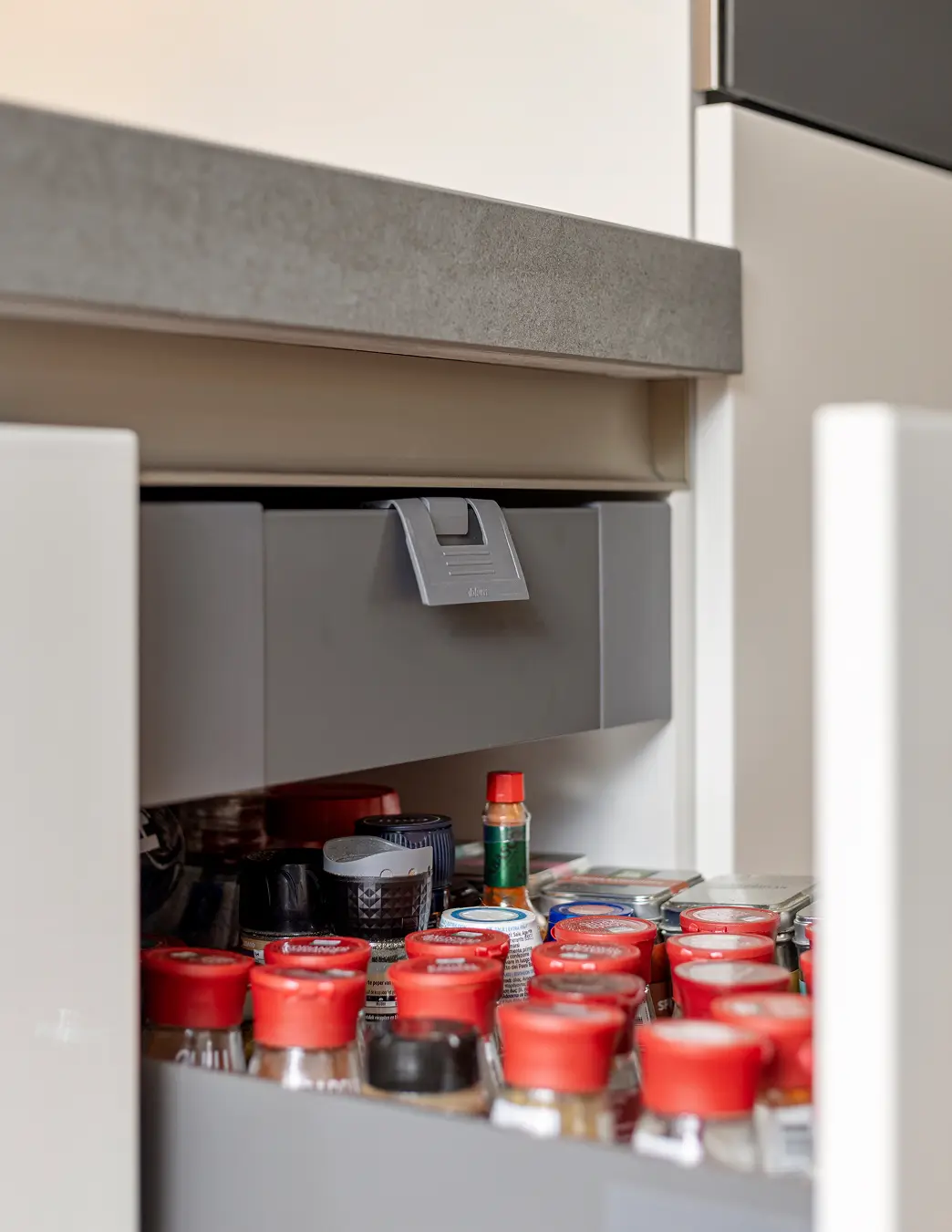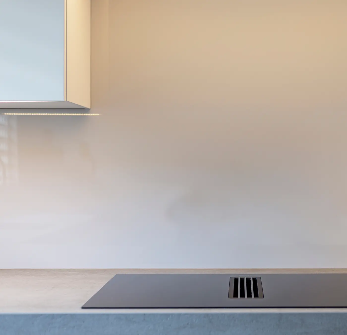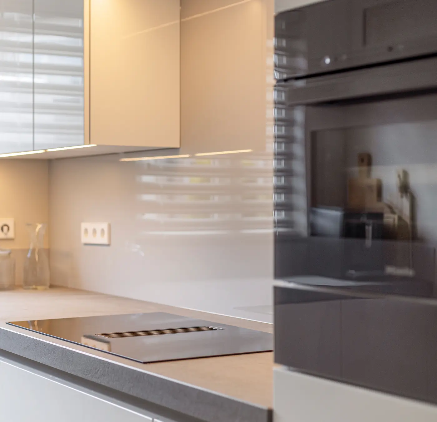 Deze moderne witte hoekkeuken straalt rust en verfijning uit dankzij het strakke lijnenspel en het subtiele contrast tussen de hoogglans fronten en het grijze werkblad. De geïntegreerde bar creëert een gezellige plek om te ontbijten of te borrelen, terwijl slimme opberglades en kasten zorgen voor optimale functionaliteit. Door de combinatie van natuurlijke lichtinval en een lichte, open opzet voelt de ruimte fris en ruimtelijk.