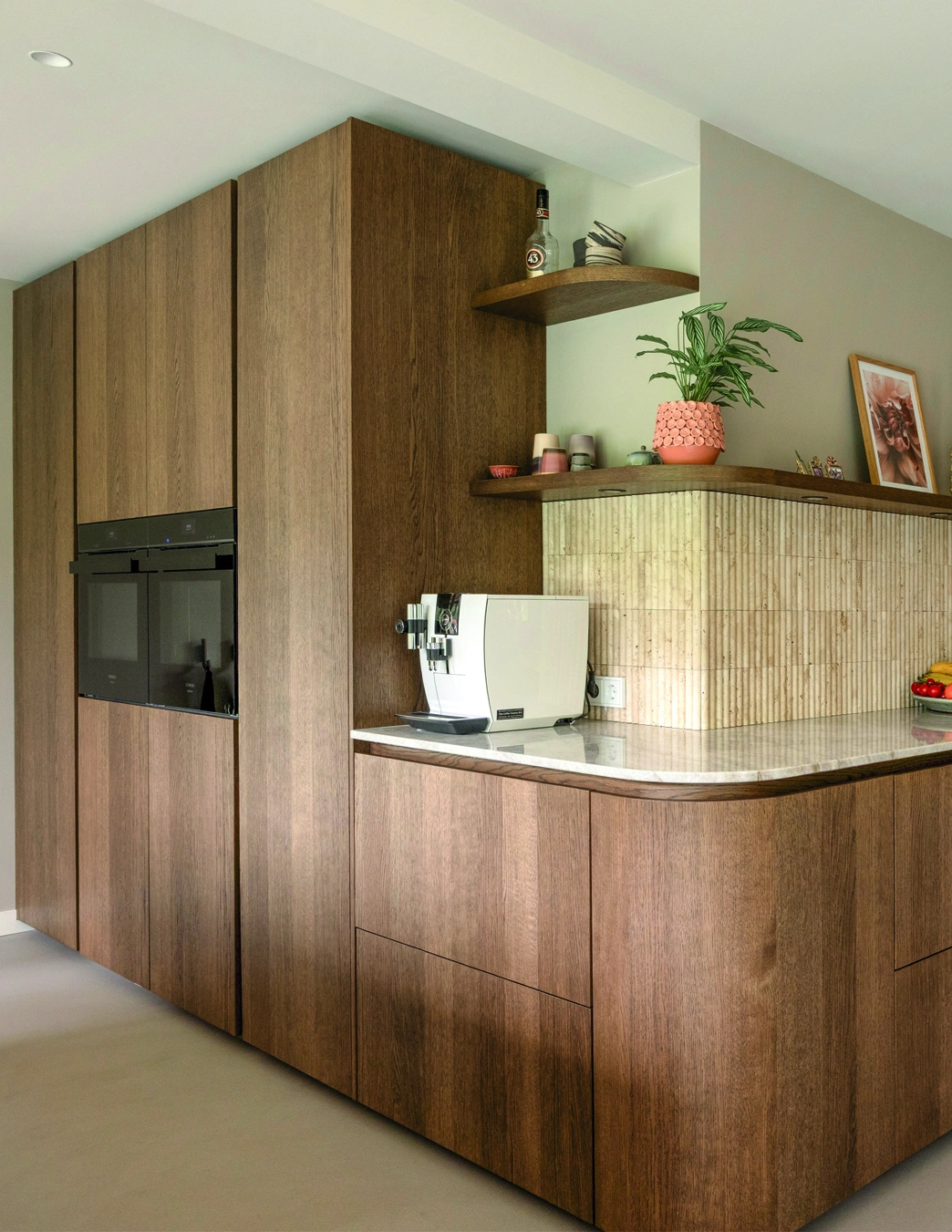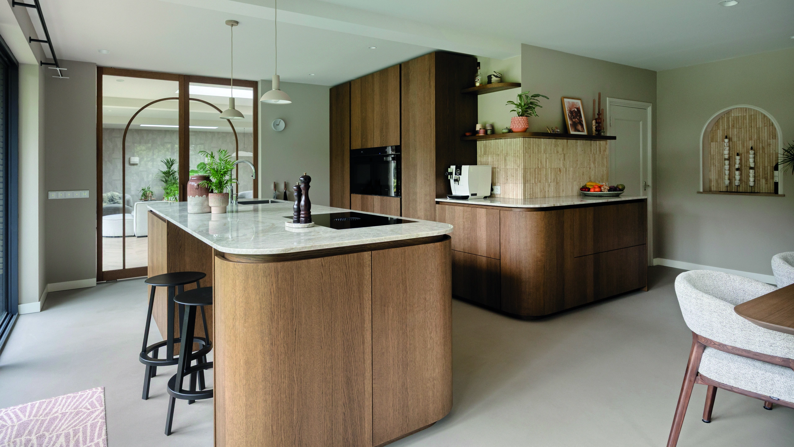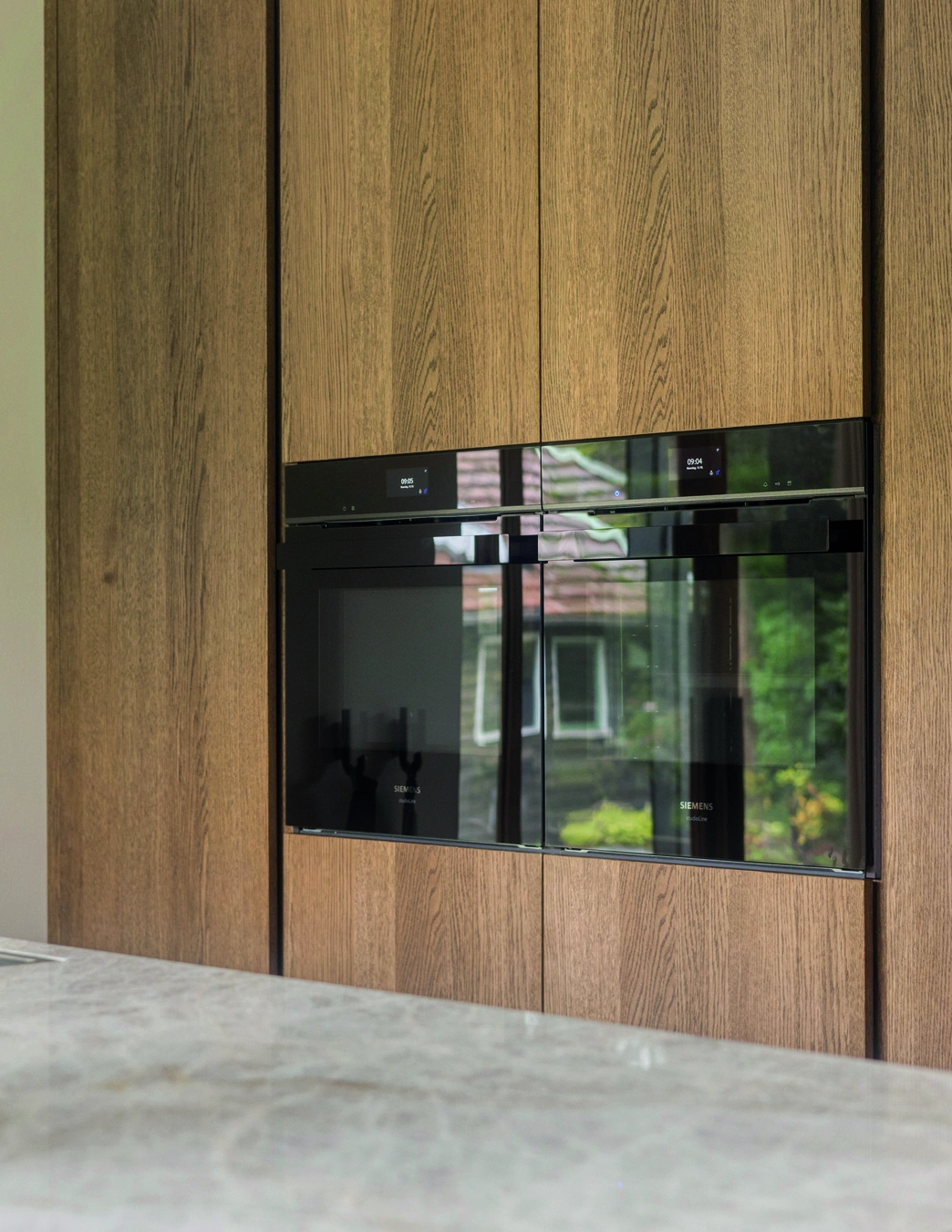 Prachtige houten keuken met ronde vormen en royaal kookeiland, voorzien van hoogwaardige Siemens-apparatuur en bijzonder mooi werkblad. Dit design is een echte eyecatcher, met aandacht voor detail, veel bergruimte en een warme, uitnodigende uitstraling voor elke keukenliefhebber.